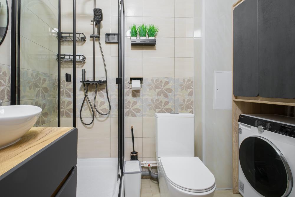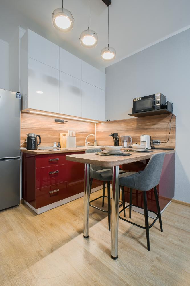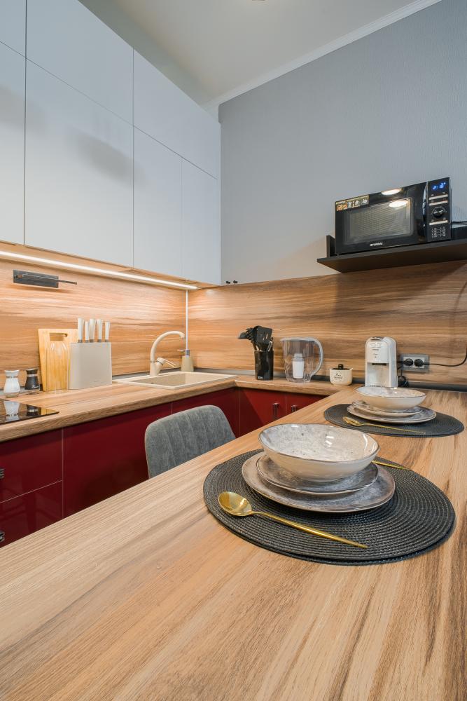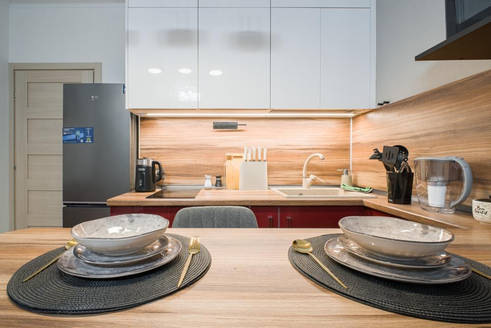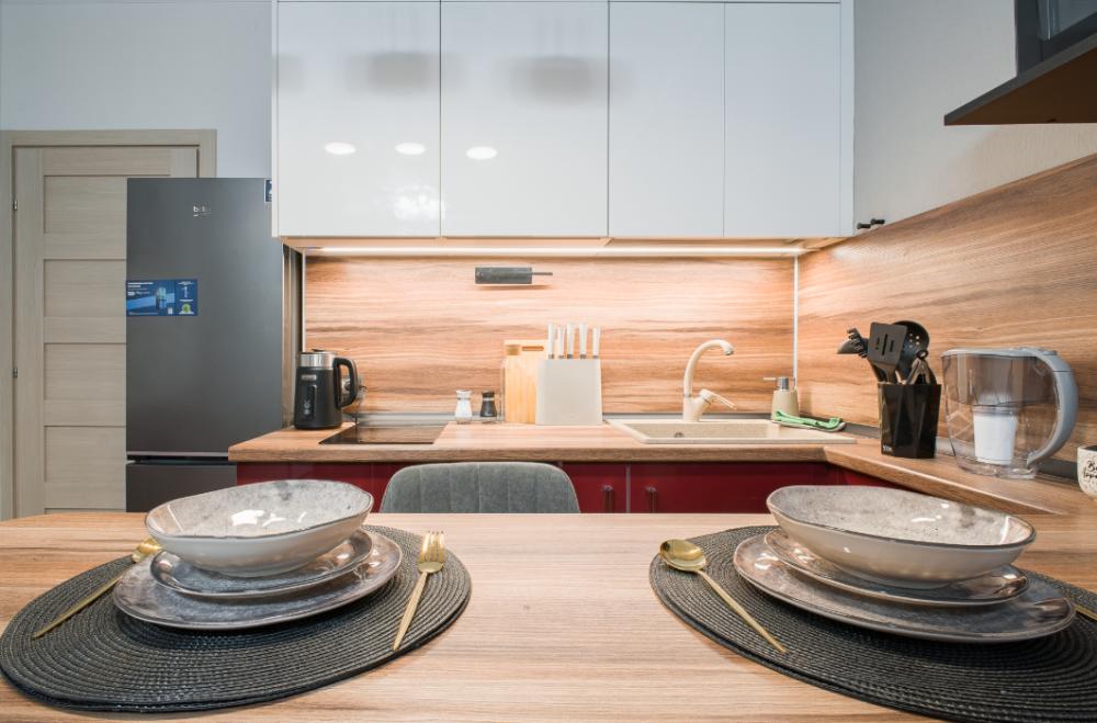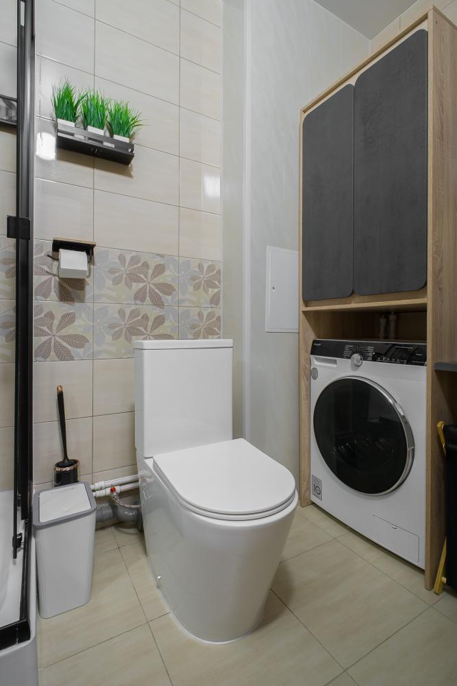 - Полный комплект кухонной и бытовой техники: плита, свч печь, холодильник, чайник, фен, утюг, стиральная машина,