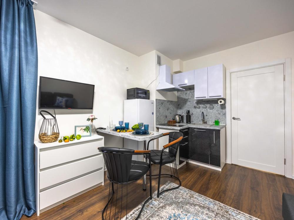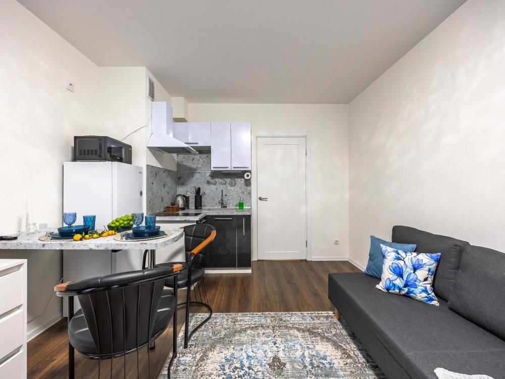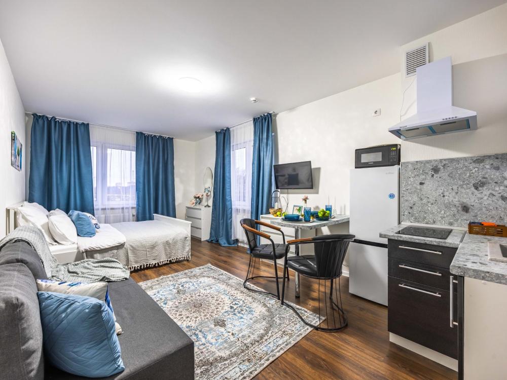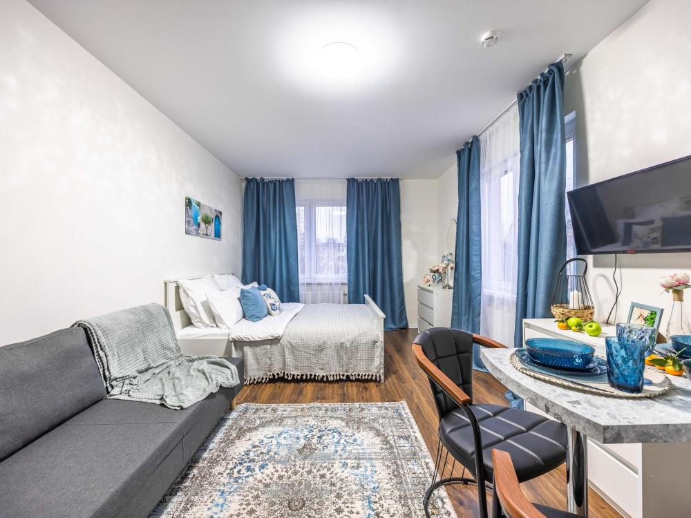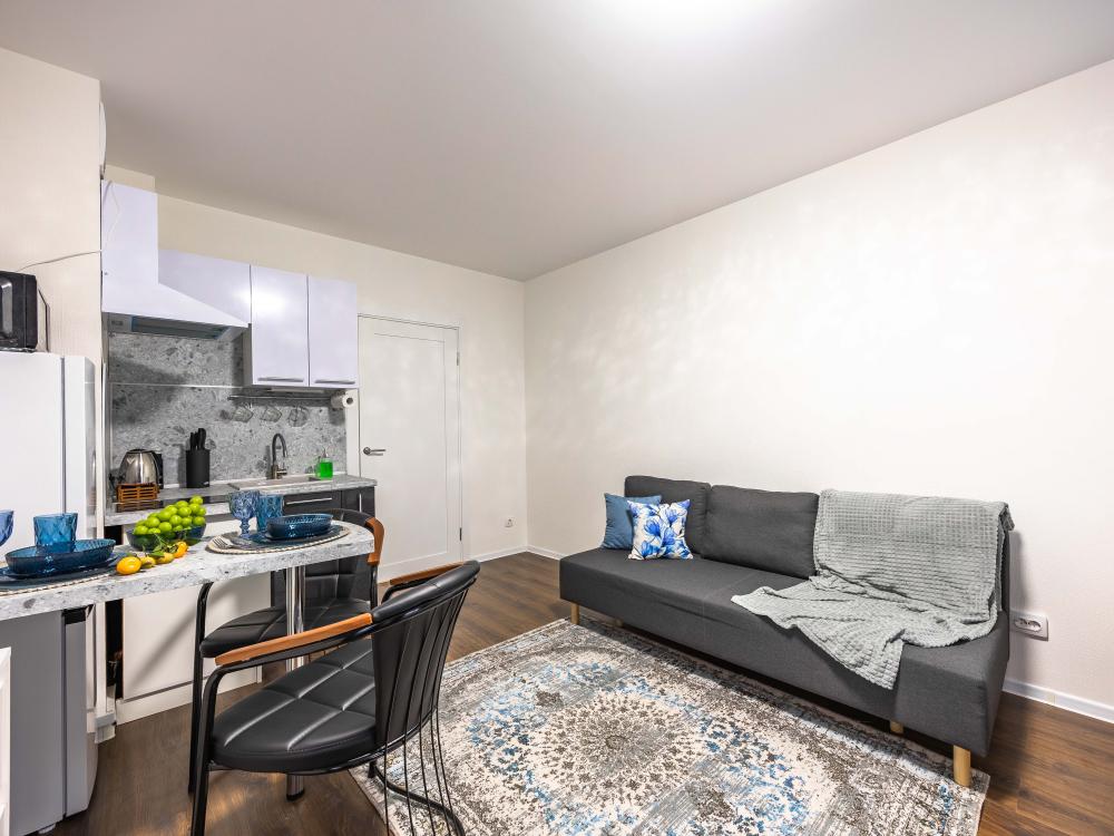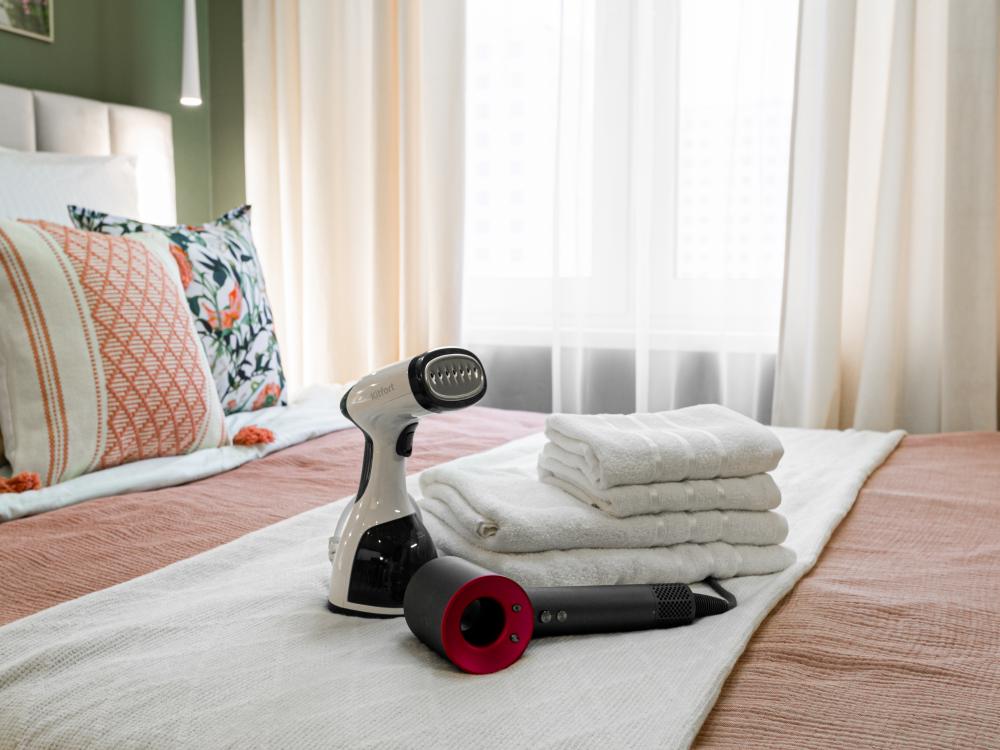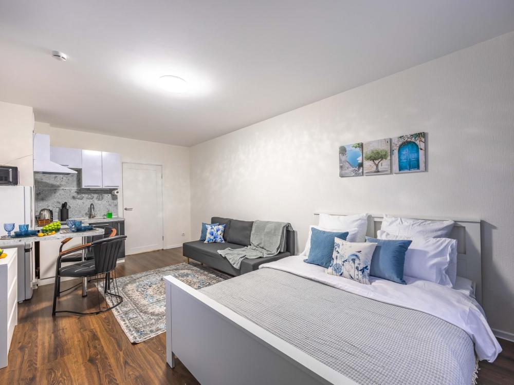 В апартаментах имеется все необходимое для комфортного проживания. Отличная двуспальная кровать 1600*2000 с ортопедическим матрасом, раскладное кресло-кровать. Кухня со всей необходимой техникой и аксессуарами, чайник. Дополнительно предоставляется набор полотенец и комплект постельного белья. Есть парогенератор, ванные принадлежности, фен, высокоскоростной интернет, телевизор со смарт ТВ.