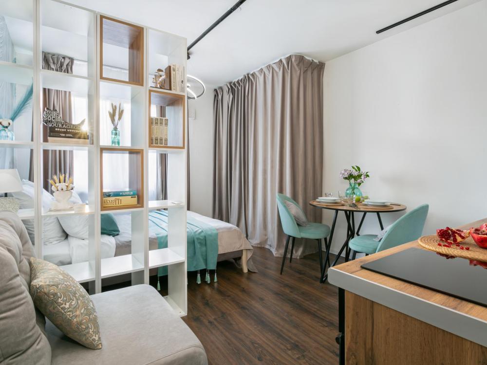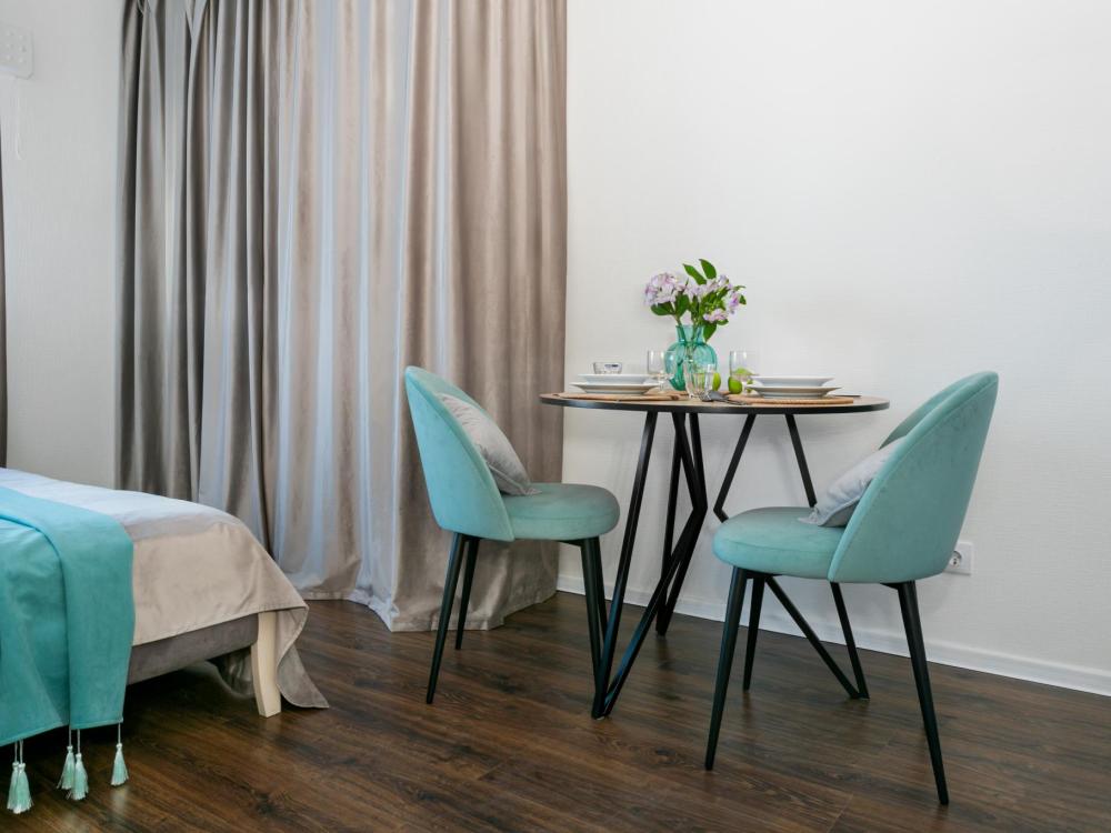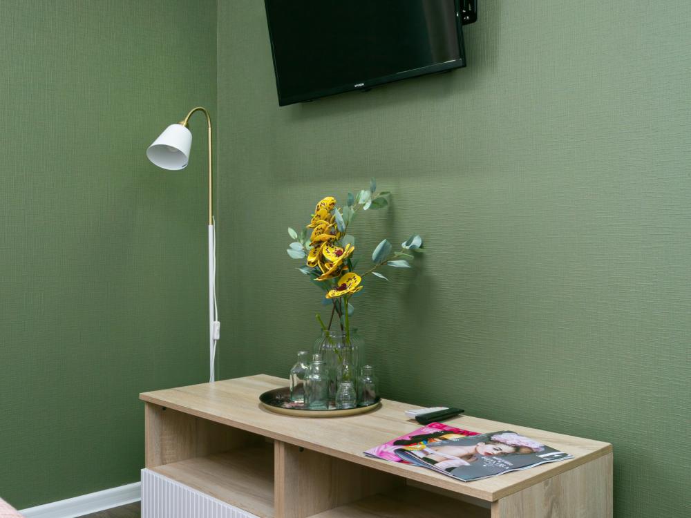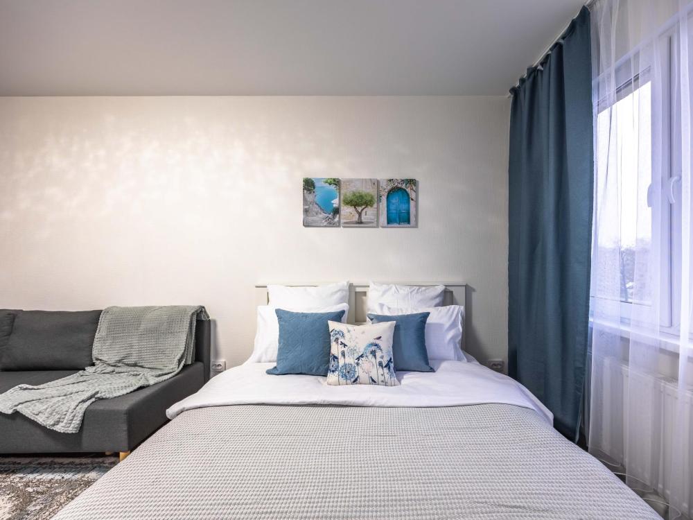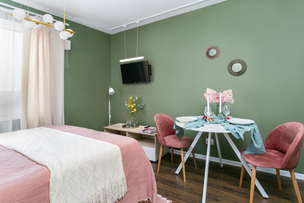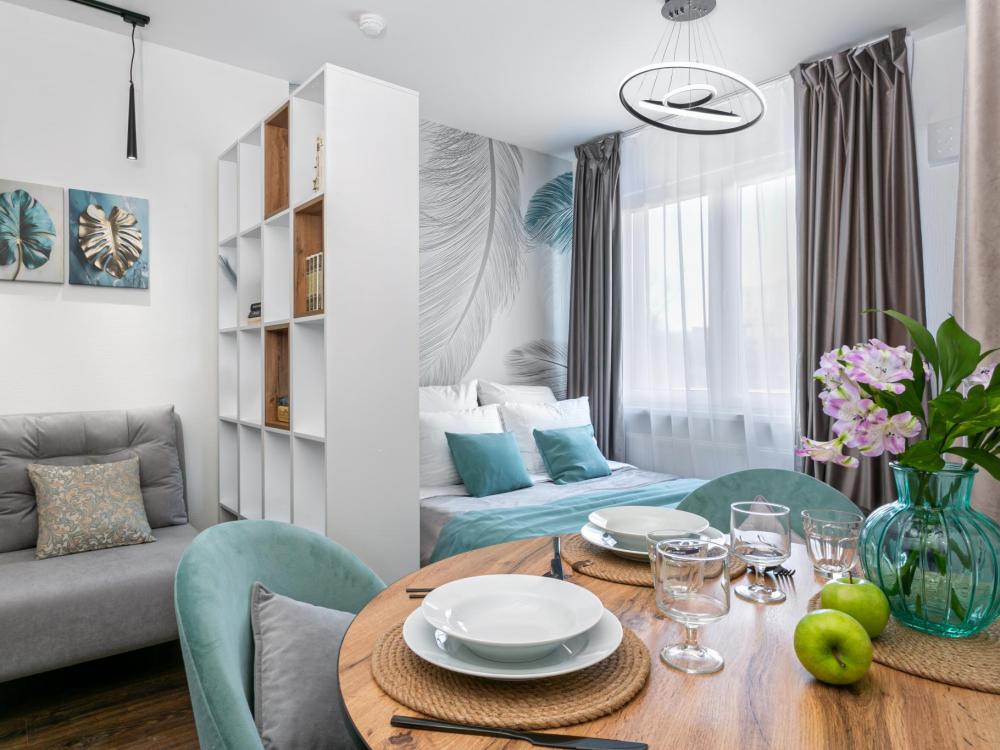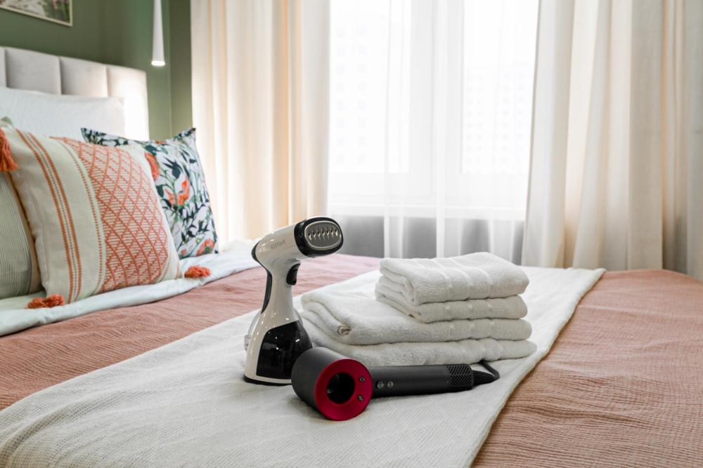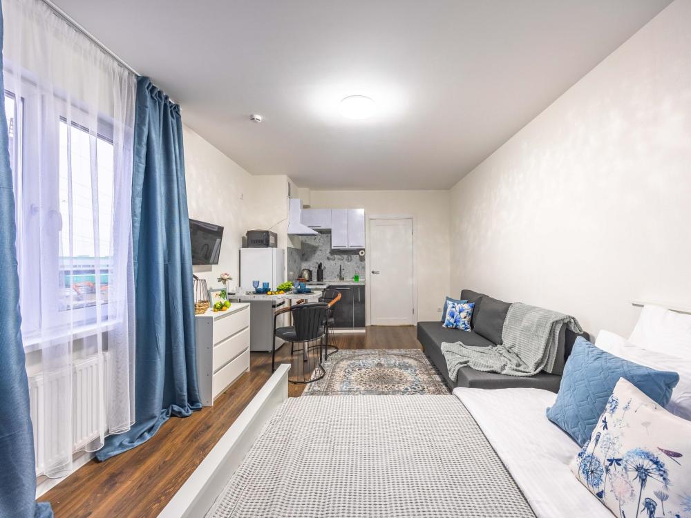 В апартаментах имеется все необходимое для комфортного проживания. Отличная двуспальная кровать 1600*2000 с ортопедическим матрасом, раскладное кресло-кровать. Кухня со всей необходимой техникой и аксессуарами, чайник. Дополнительно предоставляется набор полотенец и комплект постельного белья. Есть парогенератор, ванные принадлежности, фен, высокоскоростной интернет, телевизор со смарт ТВ.