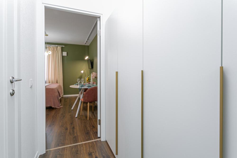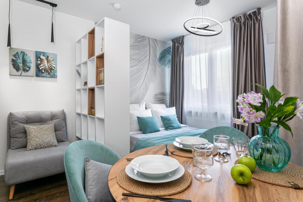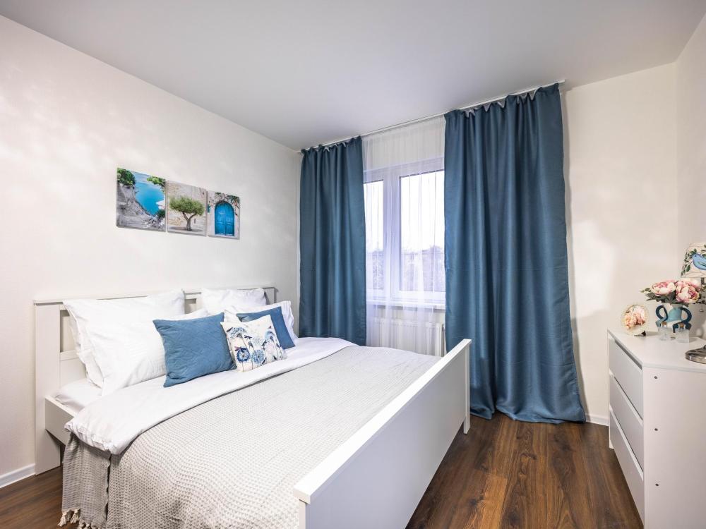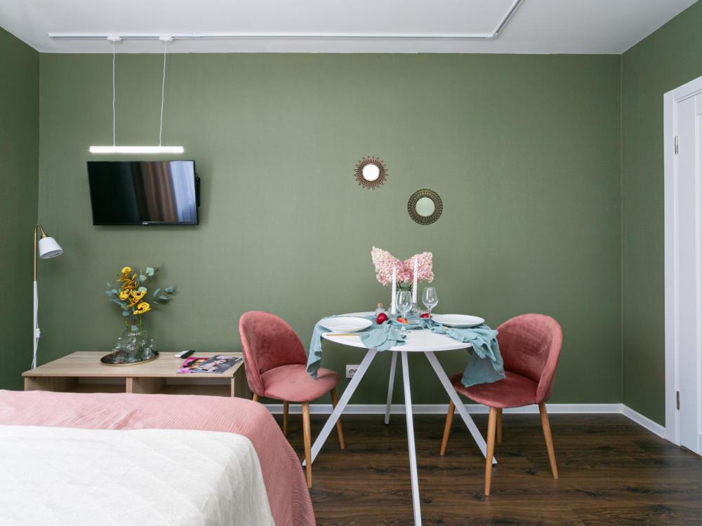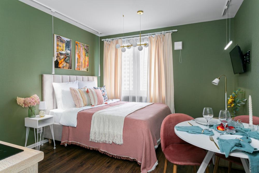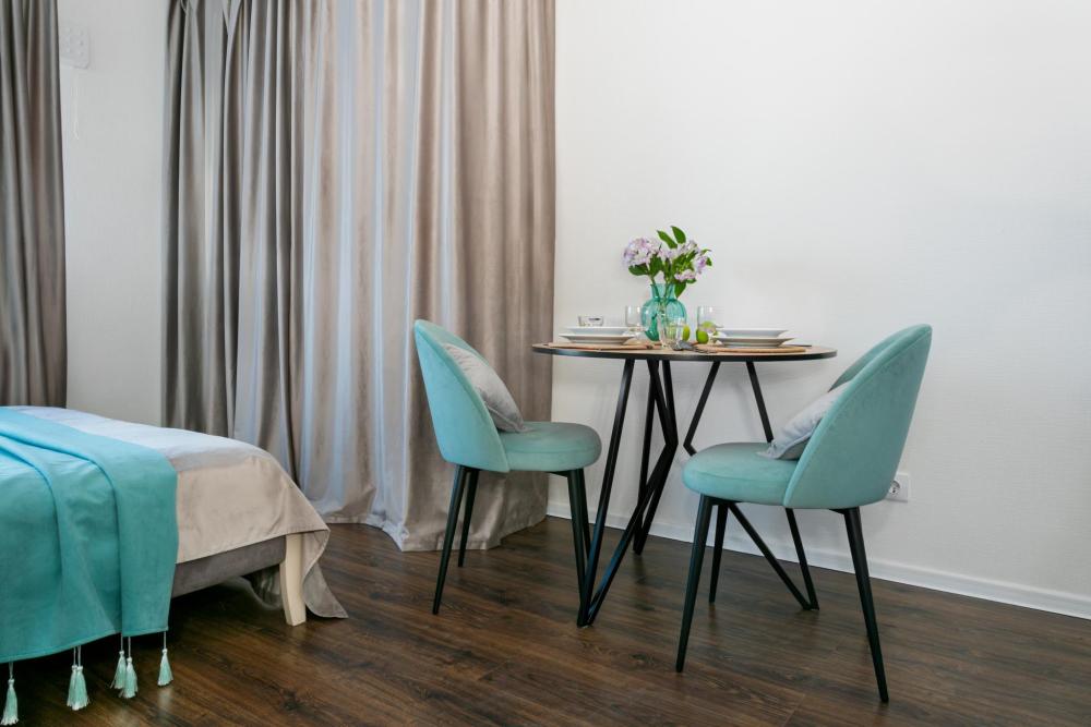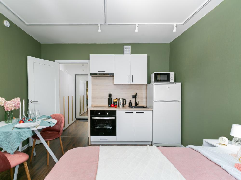 В апартаментах имеется все необходимое для комфортного проживания. Отличная двуспальная кровать 1600*2000 с ортопедическим матрасом, раскладное кресло-кровать. Кухня со всей необходимой техникой и аксессуарами, чайник. Дополнительно предоставляется набор полотенец и комплект постельного белья. Есть парогенератор, ванные принадлежности, фен, высокоскоростной интернет, телевизор со смарт ТВ.