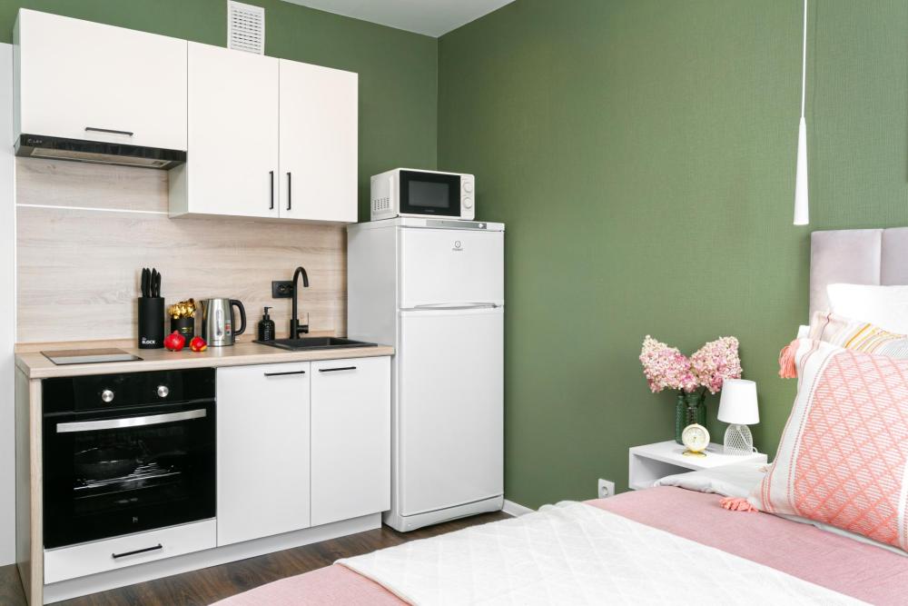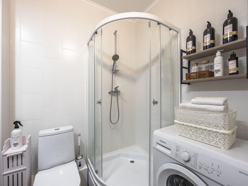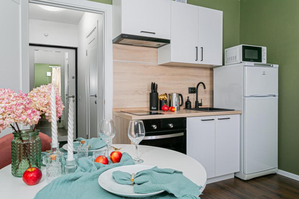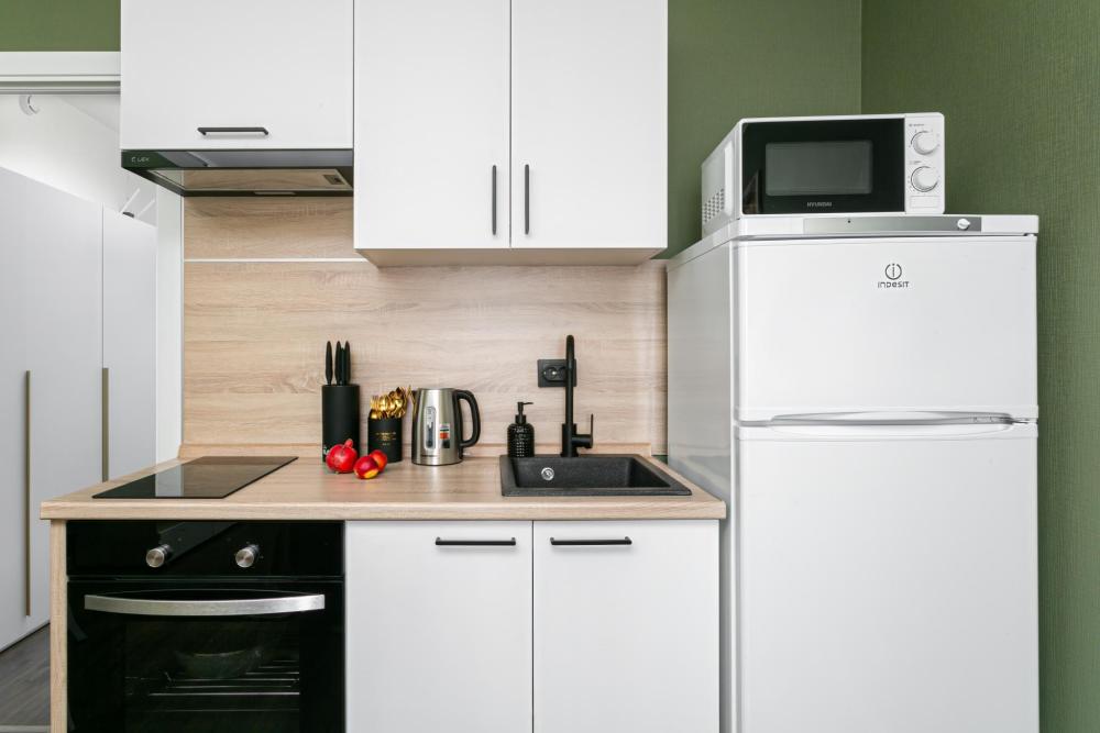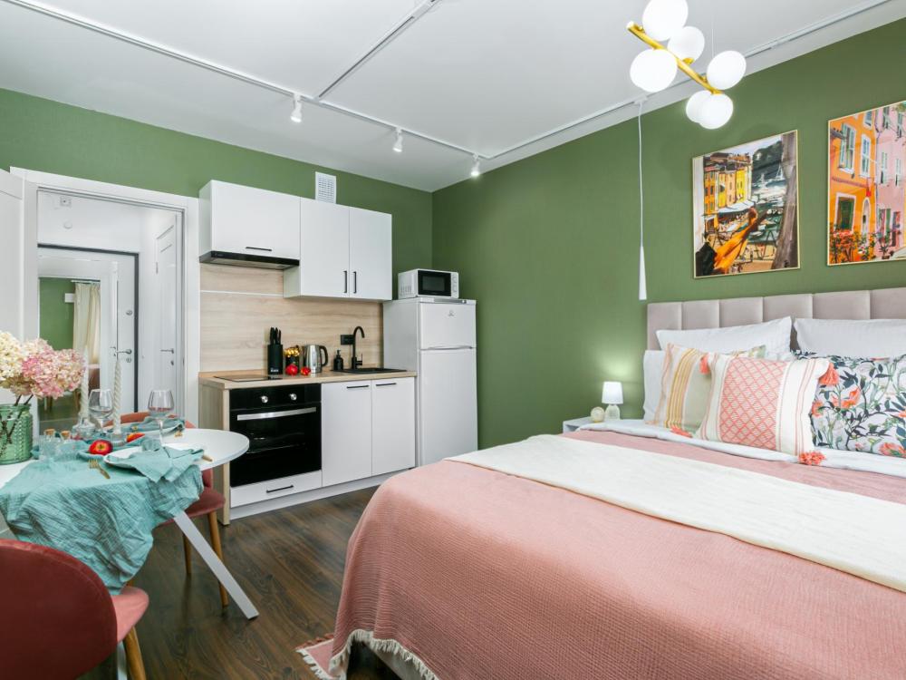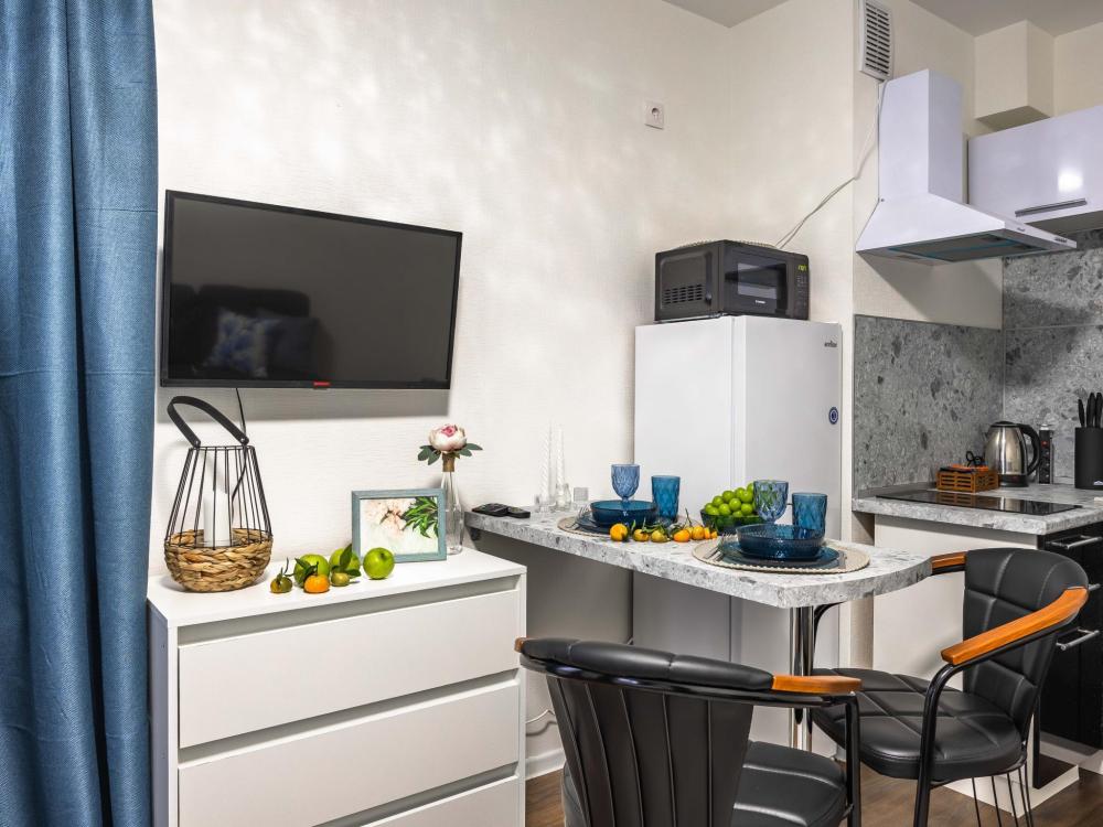 В апартаментах имеется все необходимое для комфортного проживания. Отличная двуспальная кровать 1600*2000 с ортопедическим матрасом, раскладушка. Кухня со всей необходимой техникой и аксессуарами, чайник. Дополнительно предоставляется набор полотенец и комплект постельного белья. Есть парогенератор, ванные принадлежности, фен, высокоскоростной интернет. Для комфорта гостей предусмотрен телевизор со смарт ТВ и умная колонка Алиса.