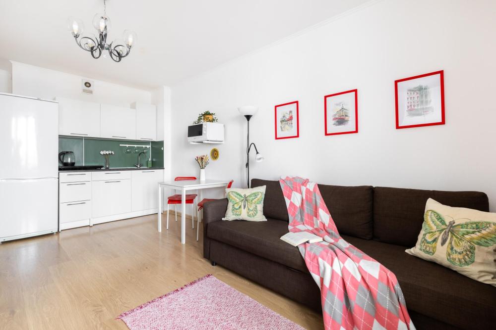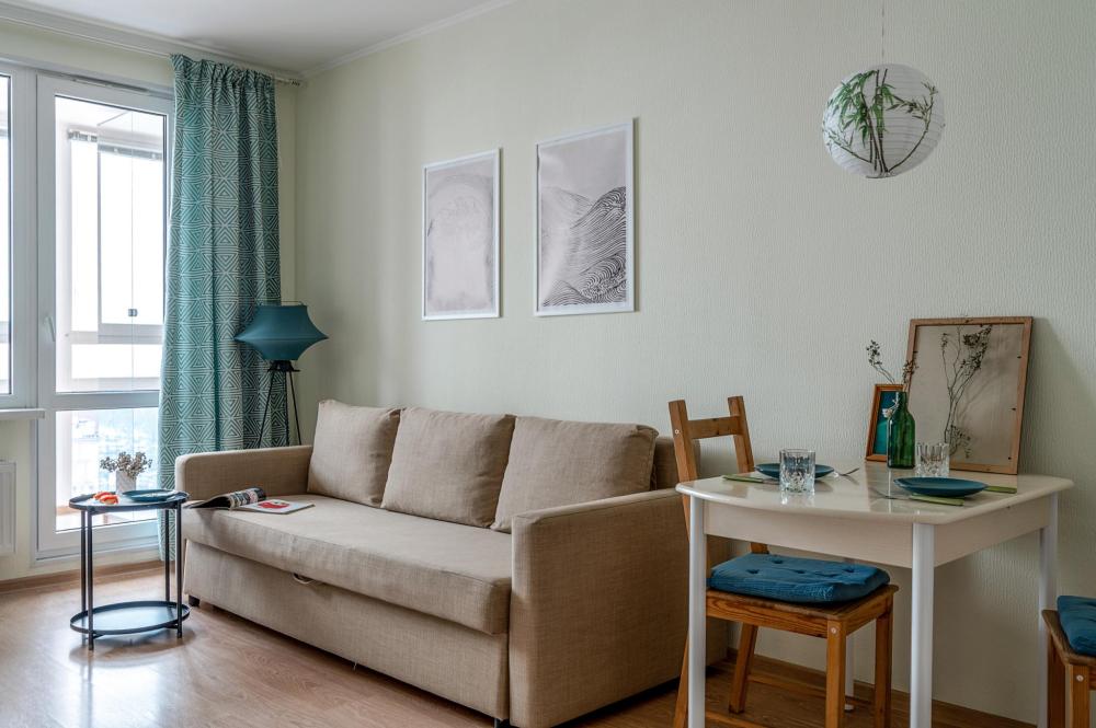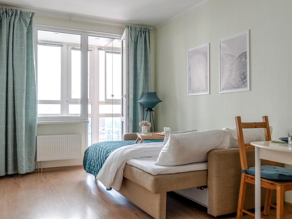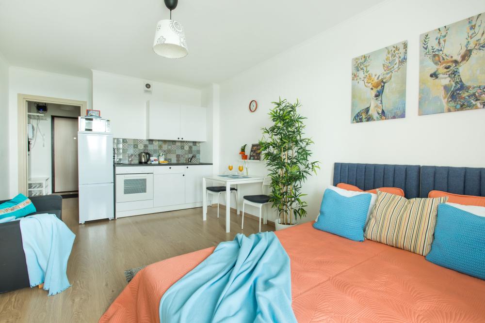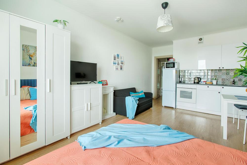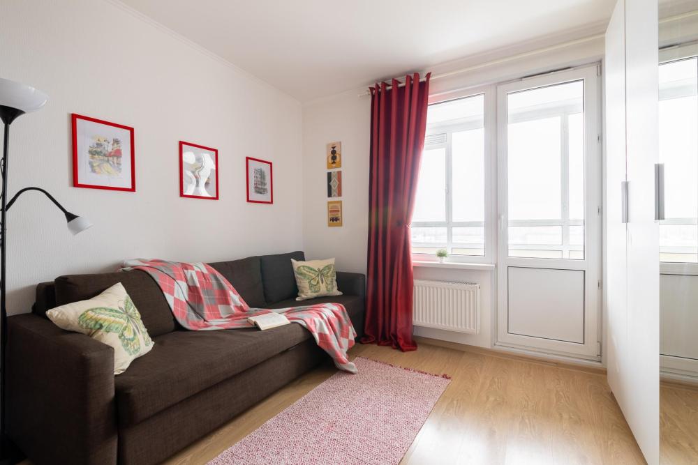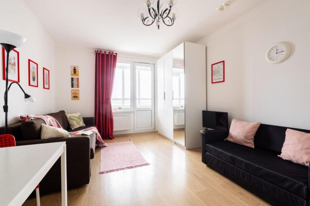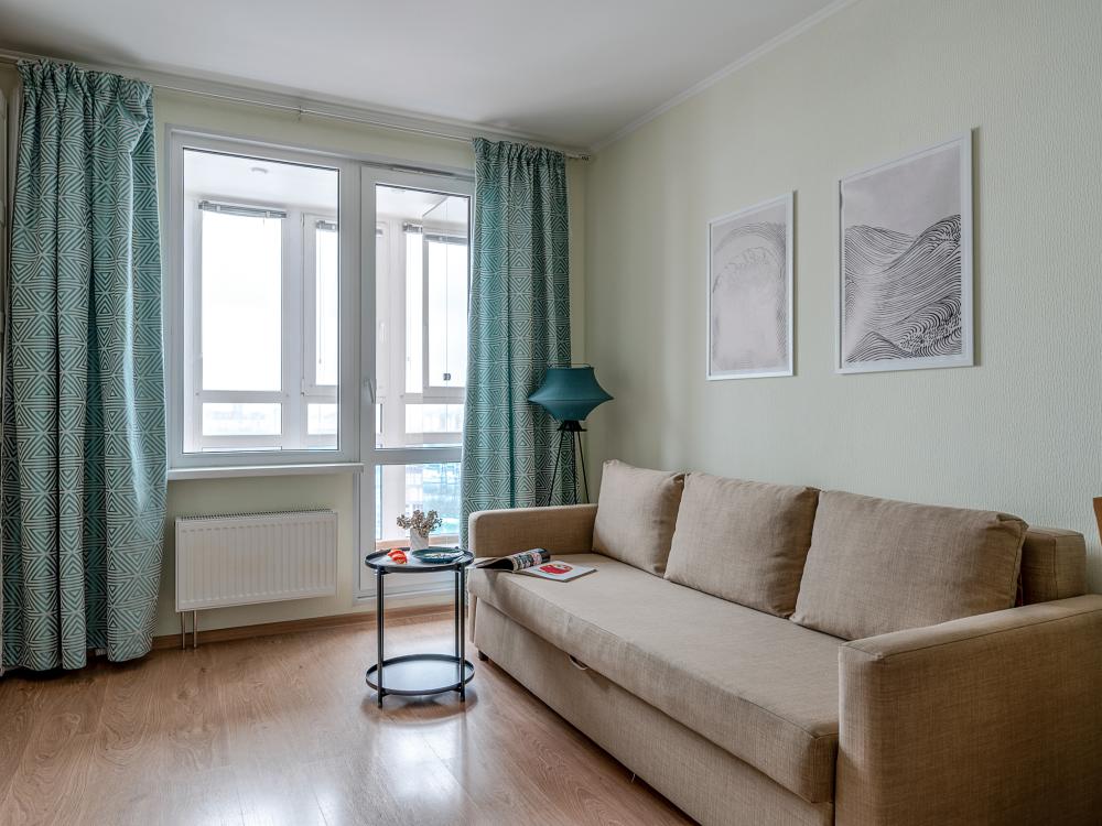 СПАЛЬНЫЕ МЕСТА: ?️1-5 гостей: диван-кровать Икеа140×200+ диван-кровать Икеа 120×200 + одно дополнительное место по запросу (мягкая раскладушка) ?УДОБСТВА: WiFi, TV, стиральная машина, холодильник, индукционная плита, СВЧ, чайник, посуда, хлопковое постельное белье, полотенца, моющие средства и принадлежности для личной гигиены, утюг, фен, уютная лоджия с панорамными видами на город и реку Охта
