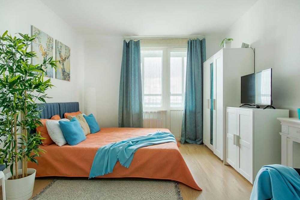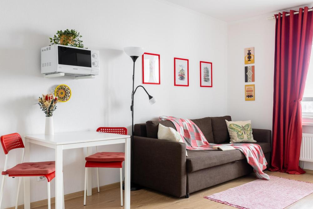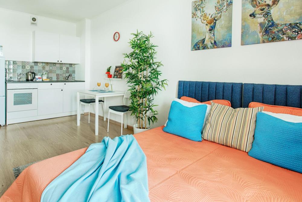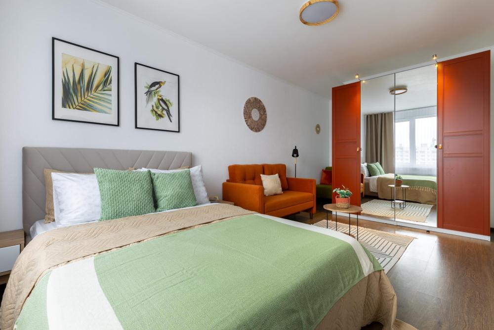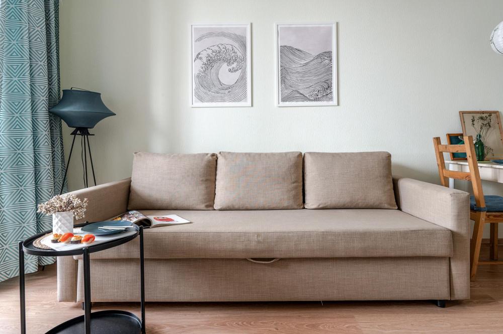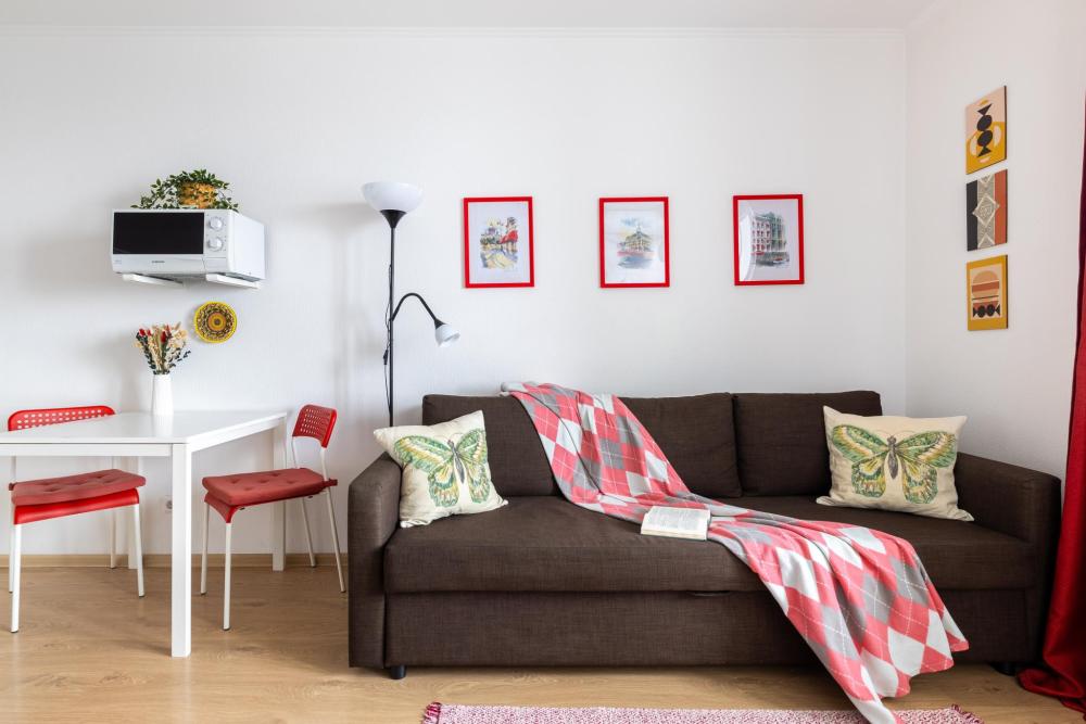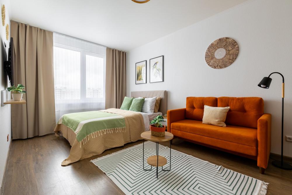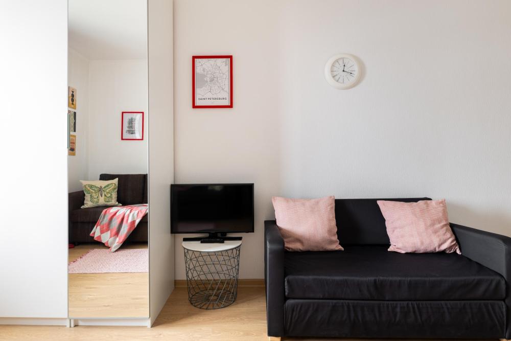 СПАЛЬНЫЕ МЕСТА: ?️1-5 гостей: диван-кровать Икеа140×200+ диван-кровать Икеа 120×200 + одно дополнительное место по запросу (мягкая раскладушка) ?УДОБСТВА: WiFi, TV, стиральная машина, холодильник, индукционная плита, СВЧ, чайник, посуда, хлопковое постельное белье, полотенца, моющие средства и принадлежности для личной гигиены, утюг, фен, уютная лоджия с панорамными видами на город и реку Охта
