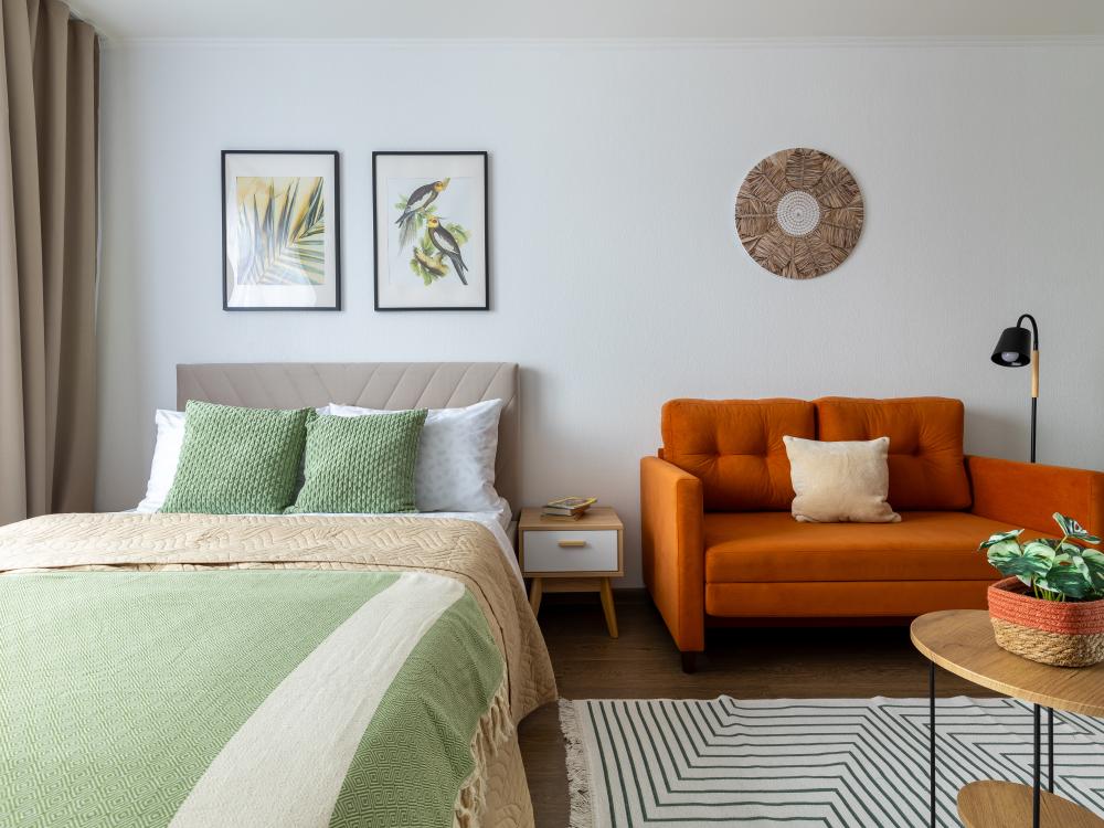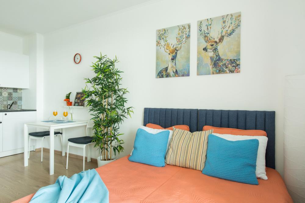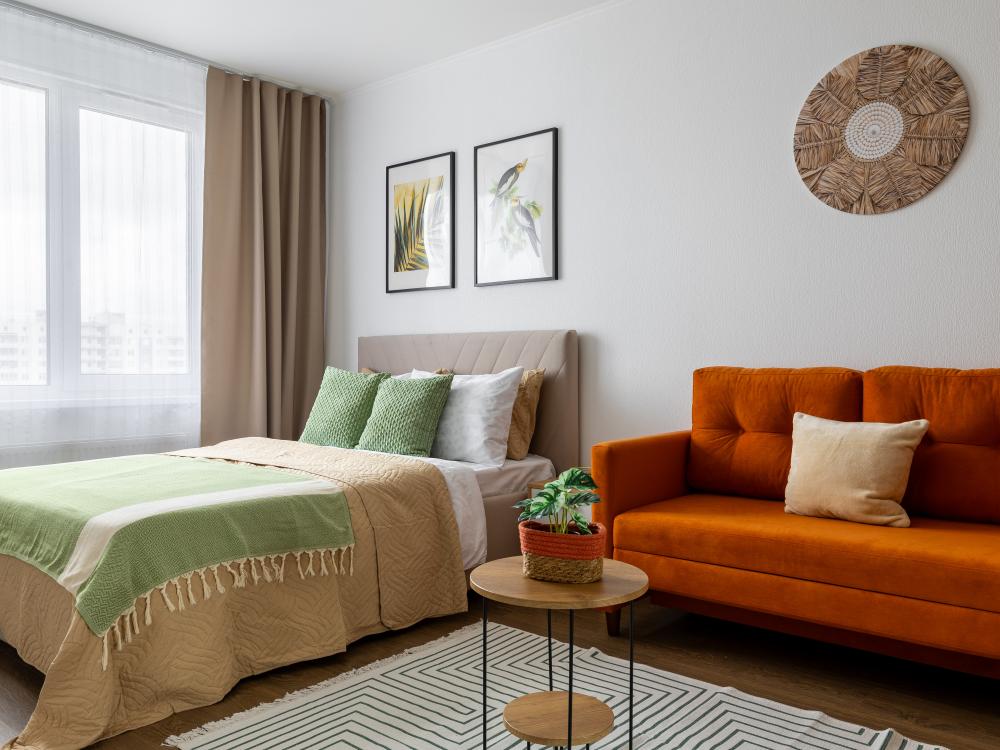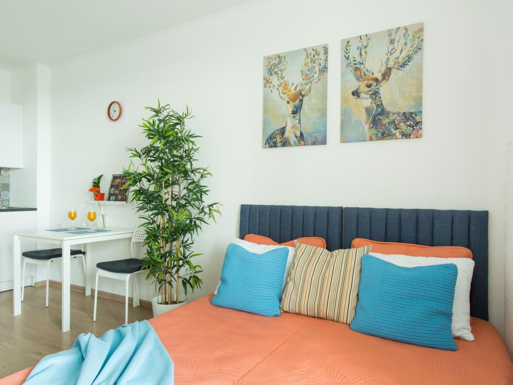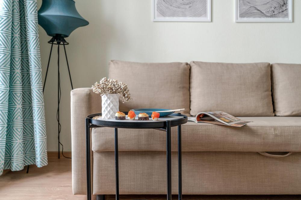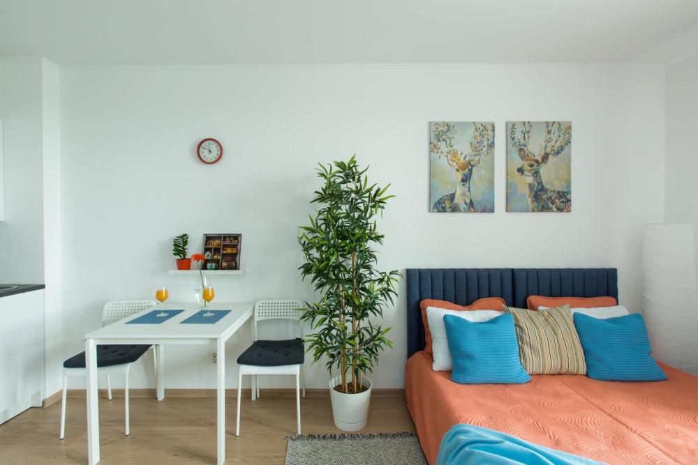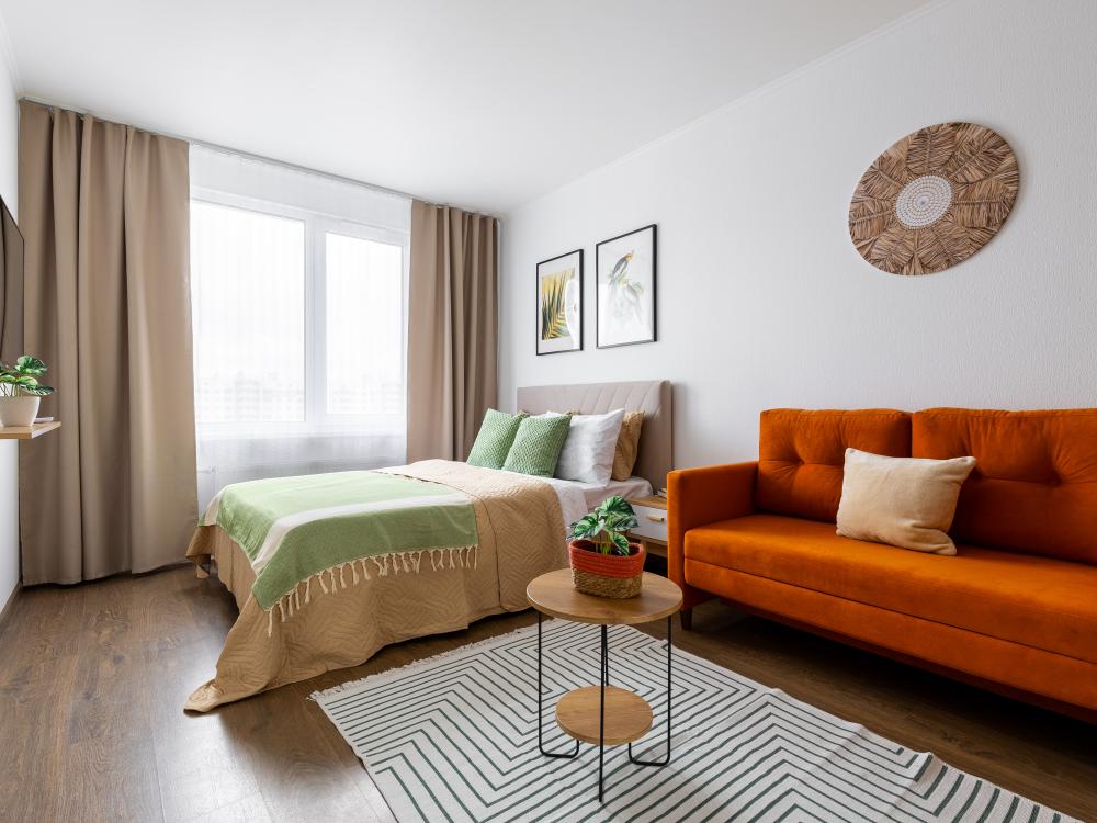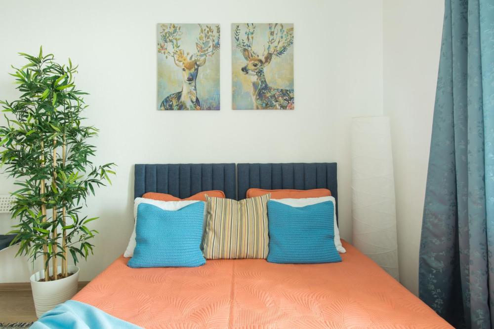 СПАЛЬНЫЕ МЕСТА: ?️1-5 гостей: диван-кровать Икеа140×200+ диван-кровать Икеа 120×200 + одно дополнительное место по запросу (мягкая раскладушка) ?УДОБСТВА: WiFi, TV, стиральная машина, холодильник, индукционная плита, СВЧ, чайник, посуда, хлопковое постельное белье, полотенца, моющие средства и принадлежности для личной гигиены, утюг, фен, уютная лоджия с панорамными видами на город и реку Охта