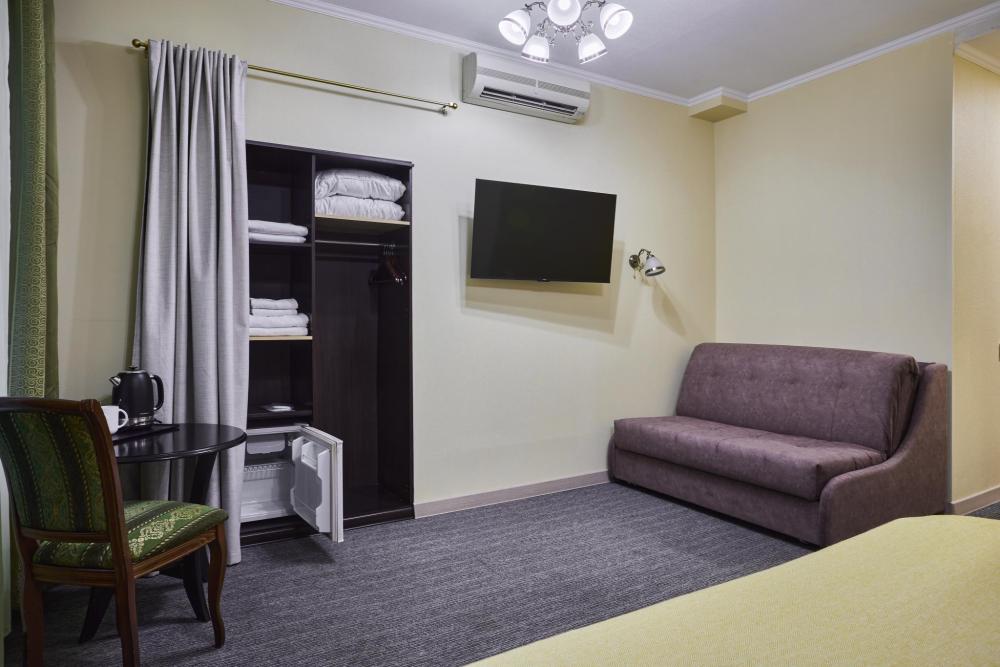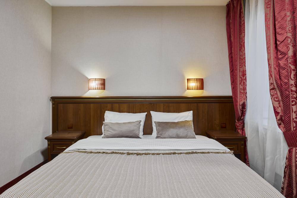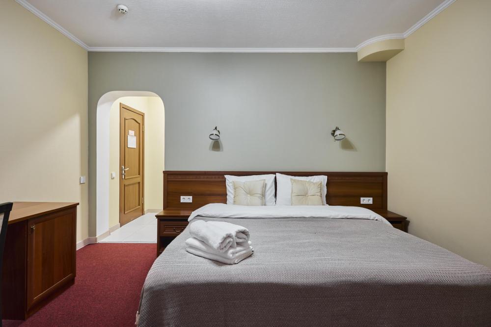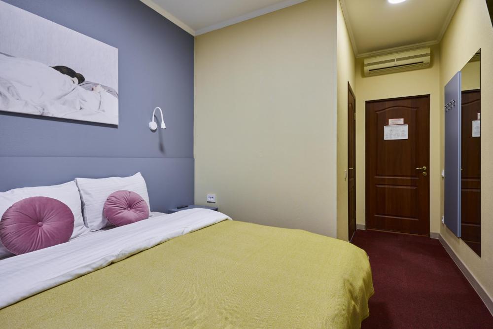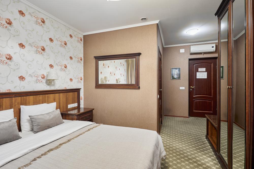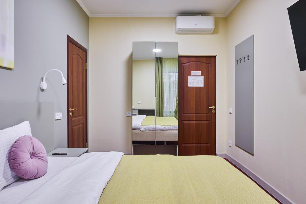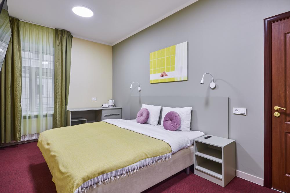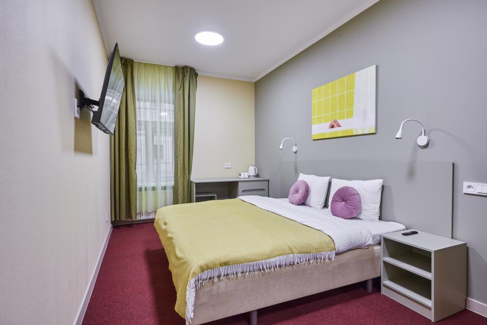 Двухместная комната категории "Комфорт" с широкой двуспальной кроватью или двумя одноместными кроватями. В распоряжении гостей собственная ванная комната. Номер оборудован кондиционером, феном, телевизором, холодильником и чайным набором. Все комнаты располагаются на 3 этаже.