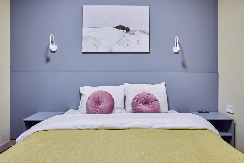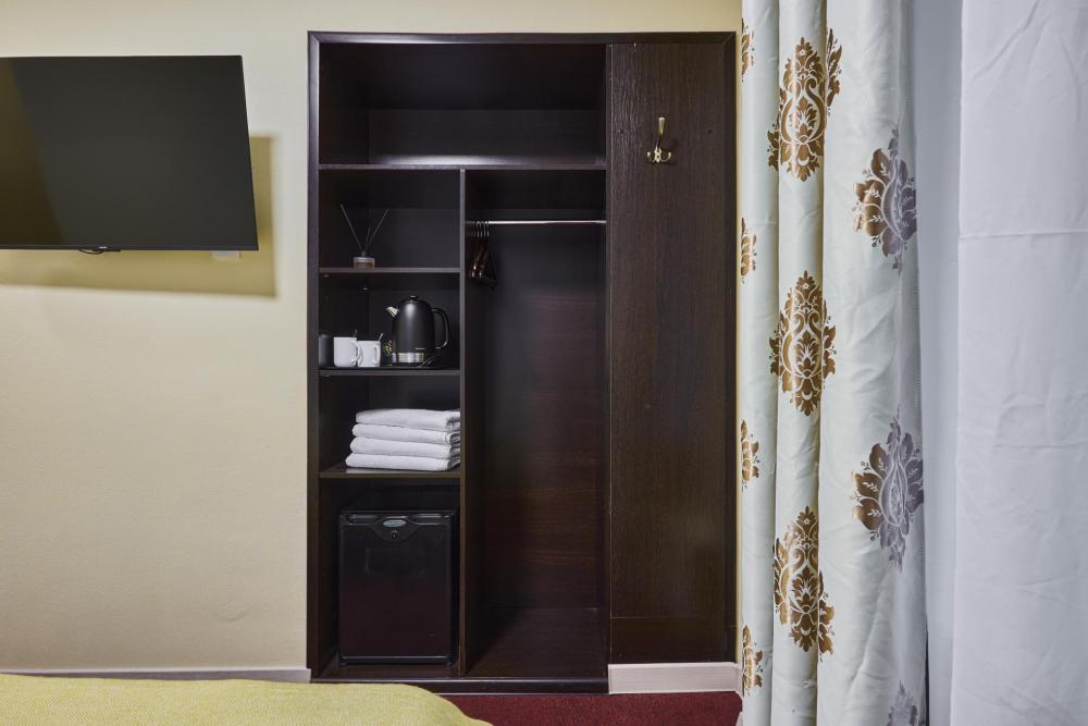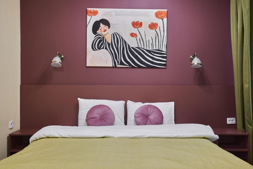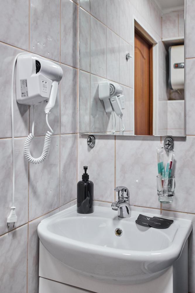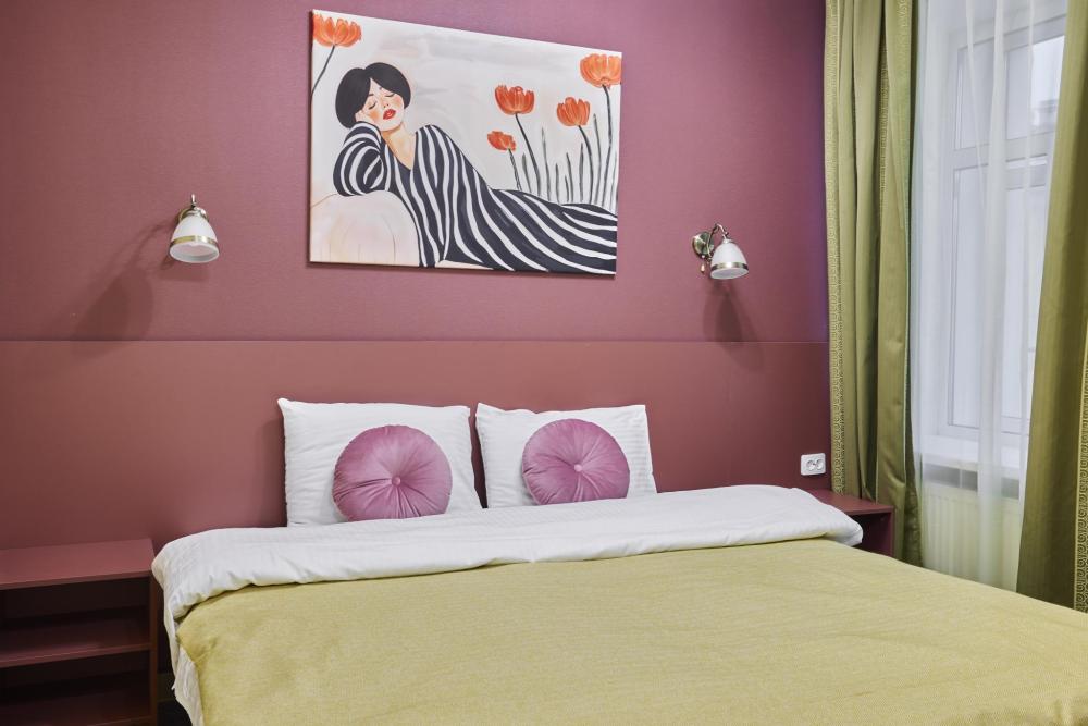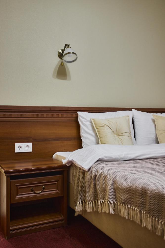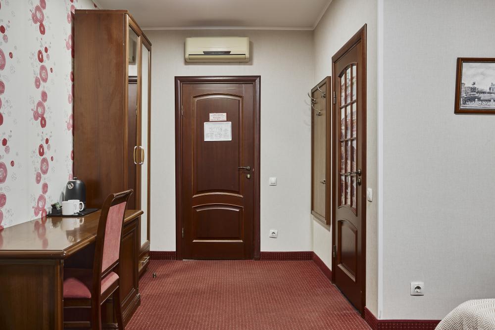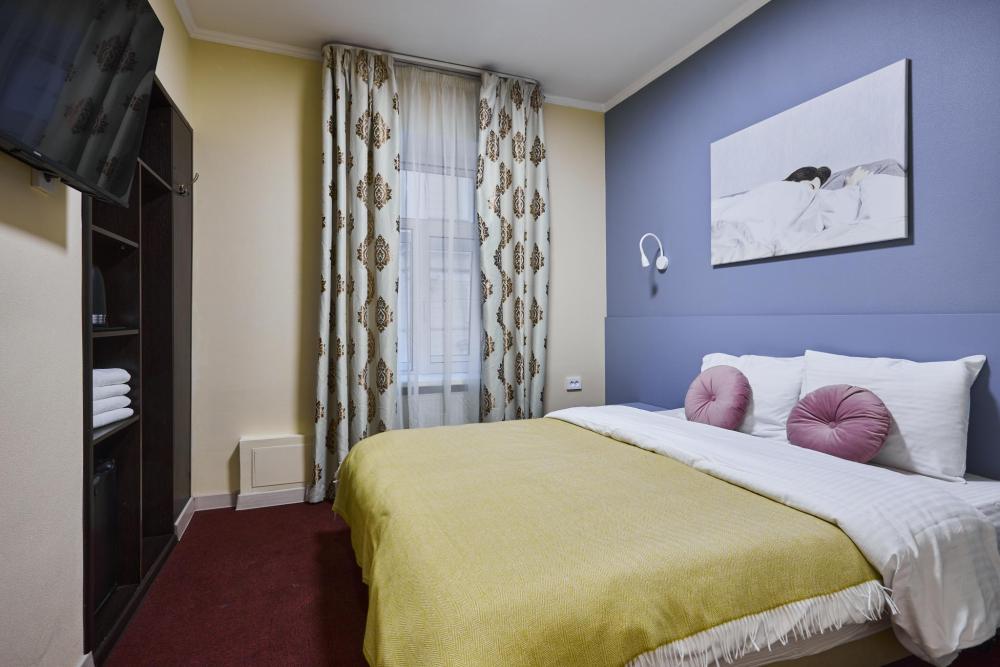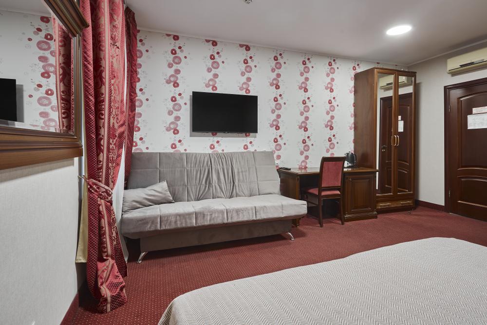 Двухместная комната категории "Комфорт" с широкой двуспальной кроватью или двумя одноместными кроватями. В распоряжении гостей собственная ванная комната. Номер оборудован кондиционером, феном, телевизором, холодильником и чайным набором. Все комнаты располагаются на 3 этаже.
