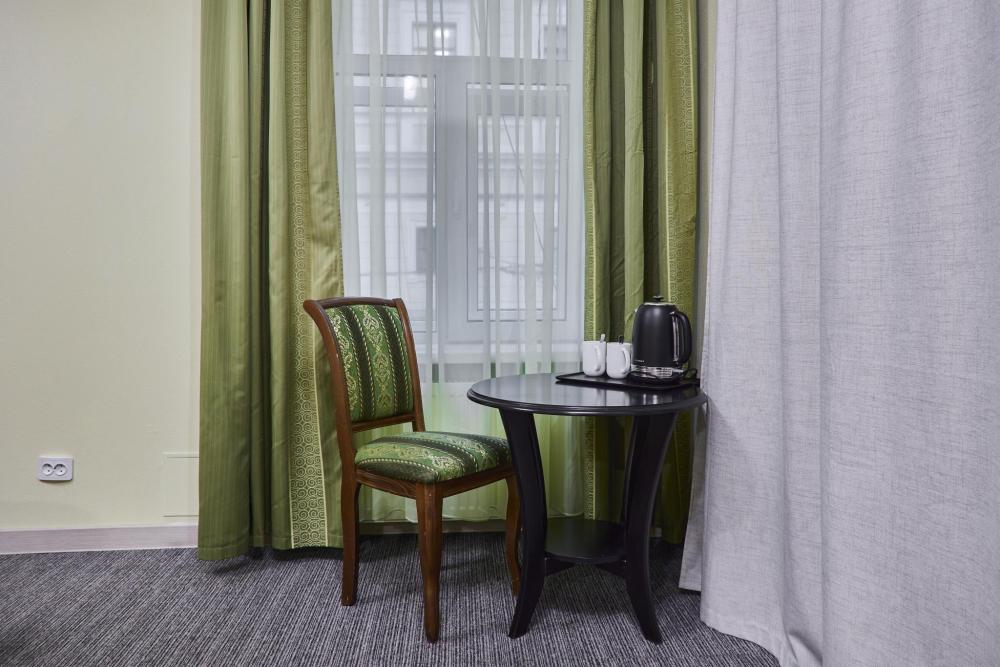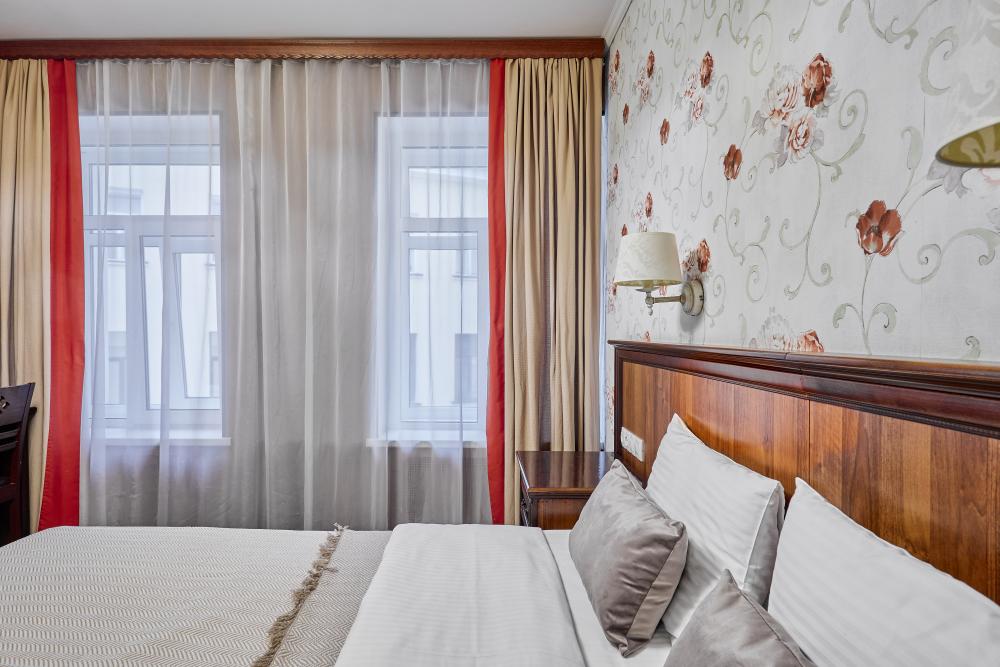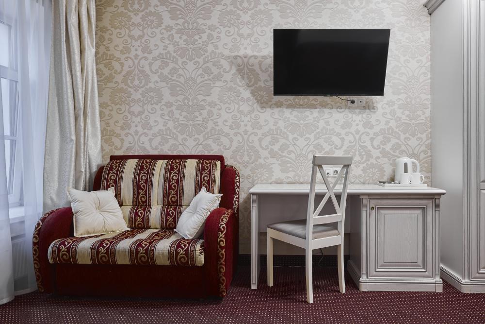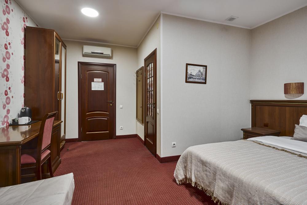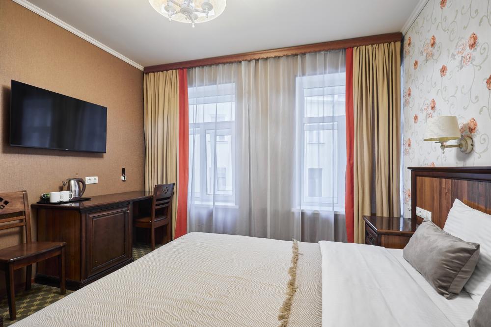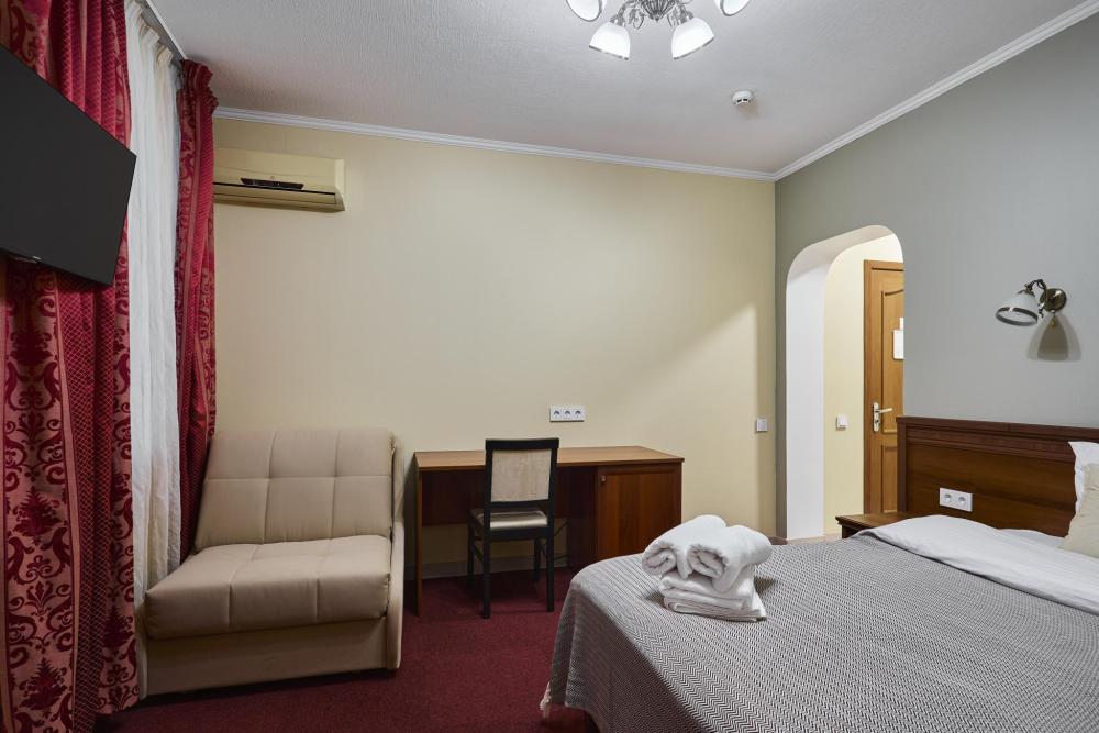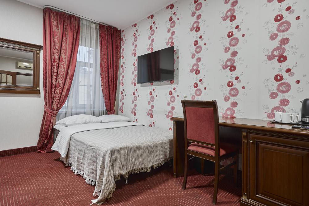 Стандартная одноместная комната с односпальной кроватью. В распоряжении гостей собственная ванная комната. Номер оборудован кондиционером, феном, телевизором и холодильником. Окна всех комнат выходят на Гончарную улицу.