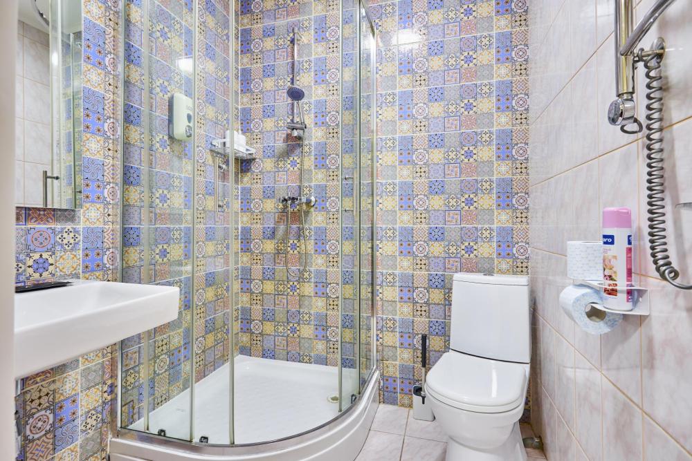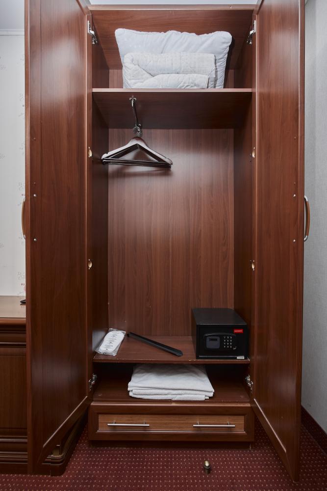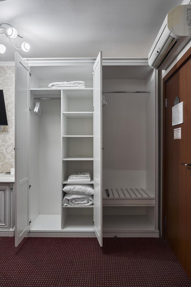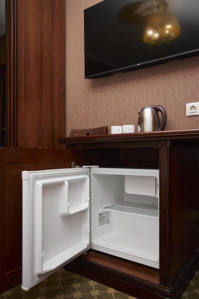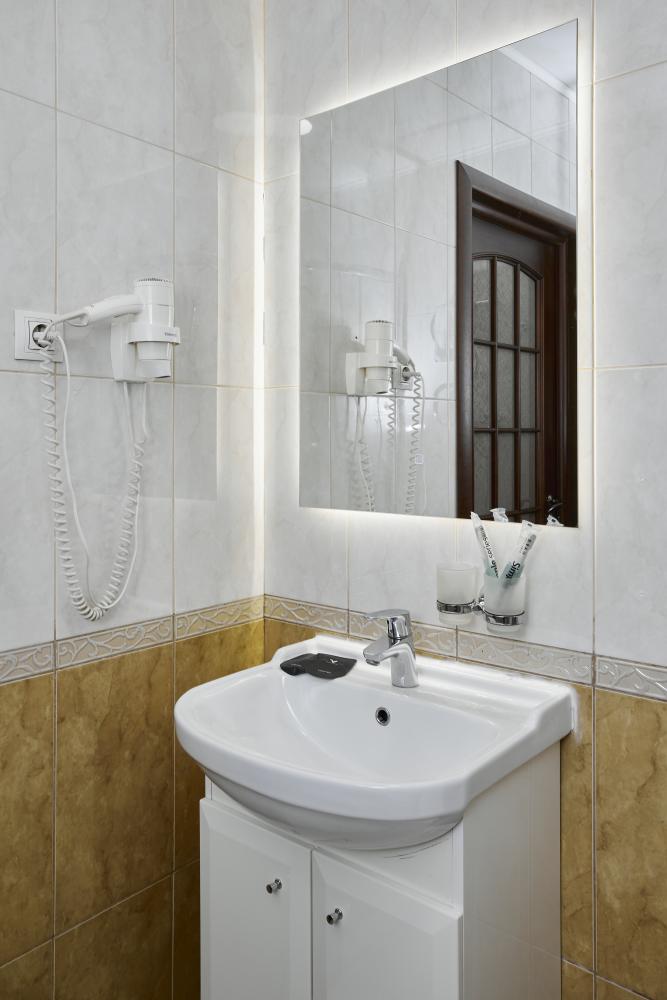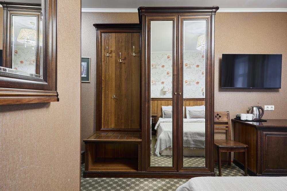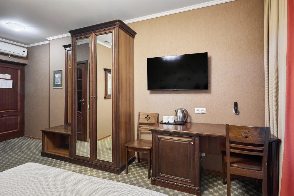 Стандартная одноместная комната с односпальной кроватью. В распоряжении гостей собственная ванная комната. Номер оборудован кондиционером, феном, телевизором и холодильником. Окна всех комнат выходят на Гончарную улицу.