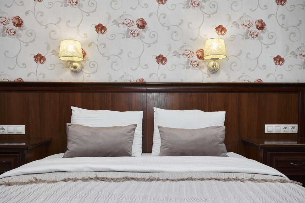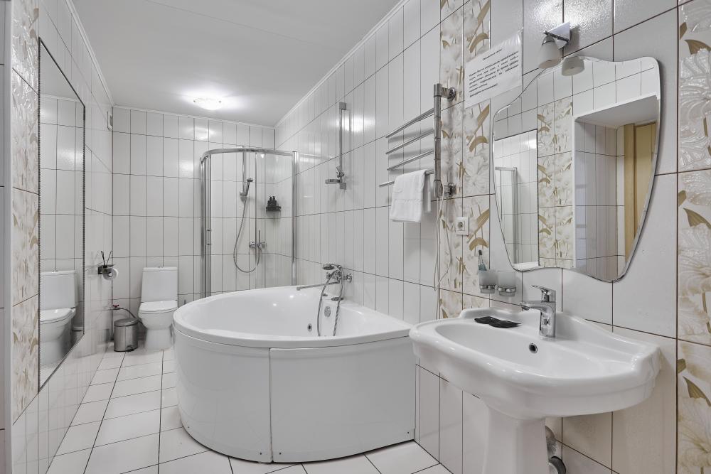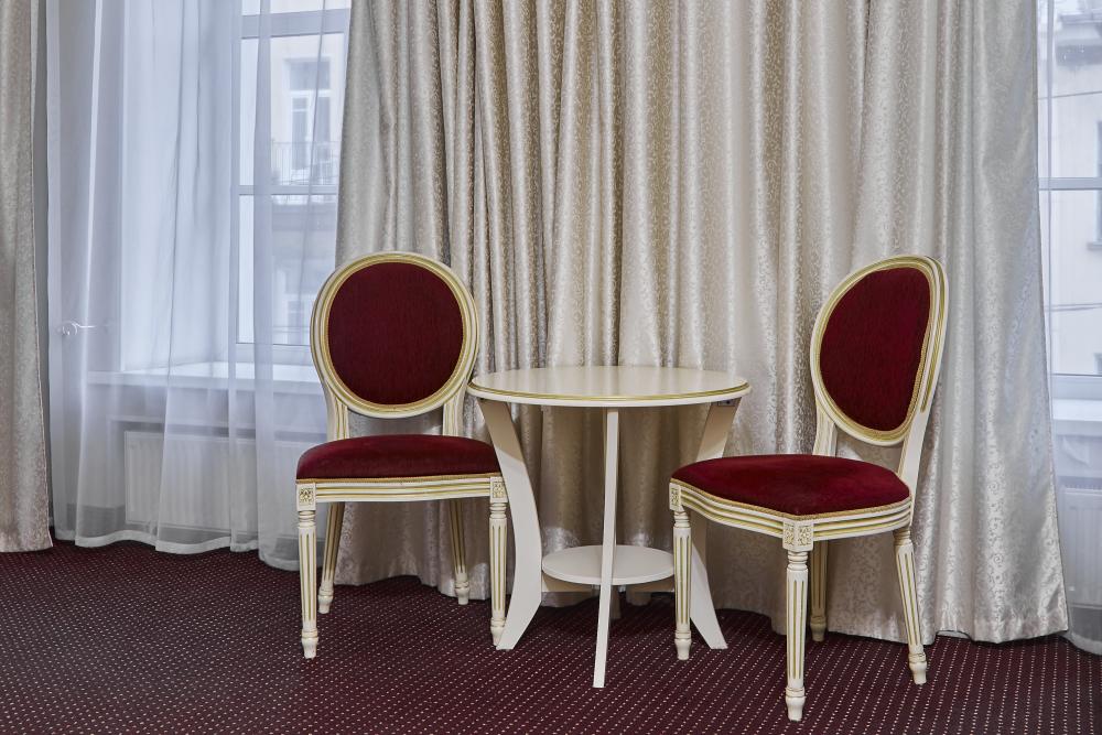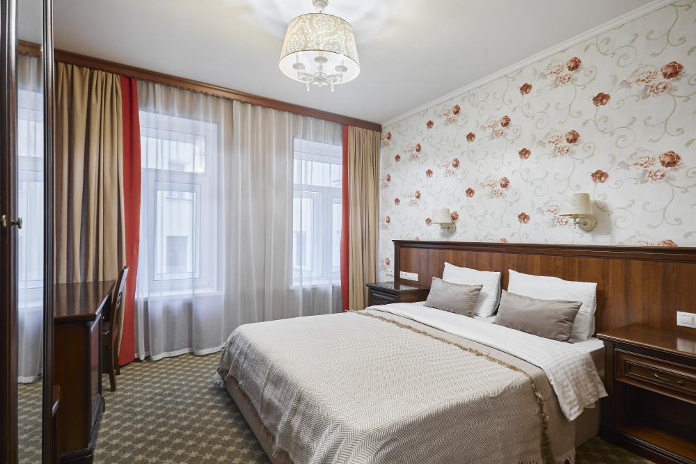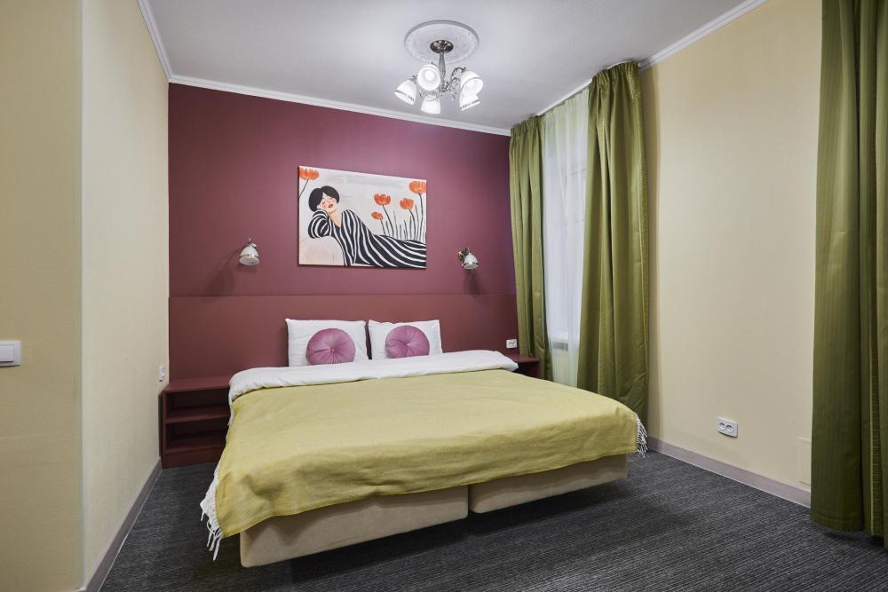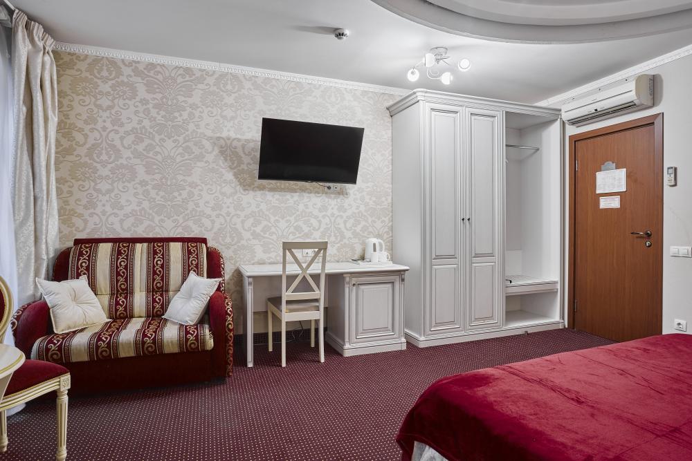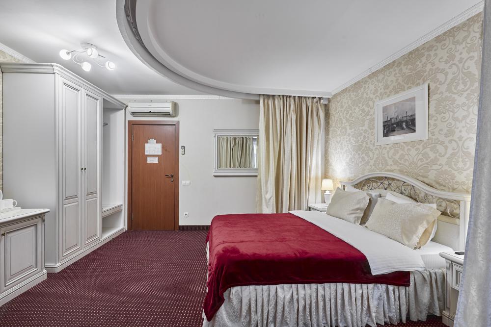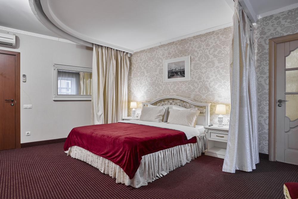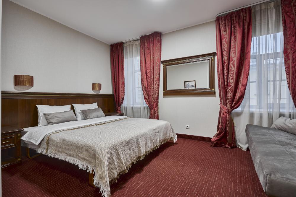 Комната "Делюкс" с широкой двуспальной кроватью идеально подойдет для романтического уикенда. В распоряжении гостей собственная ванная комната с гидромассажной ванной. Оборудована кондиционером, феном, телевизором и чайником. Окна выходят на Гончарную улицу. Располагается на 3 этаже.