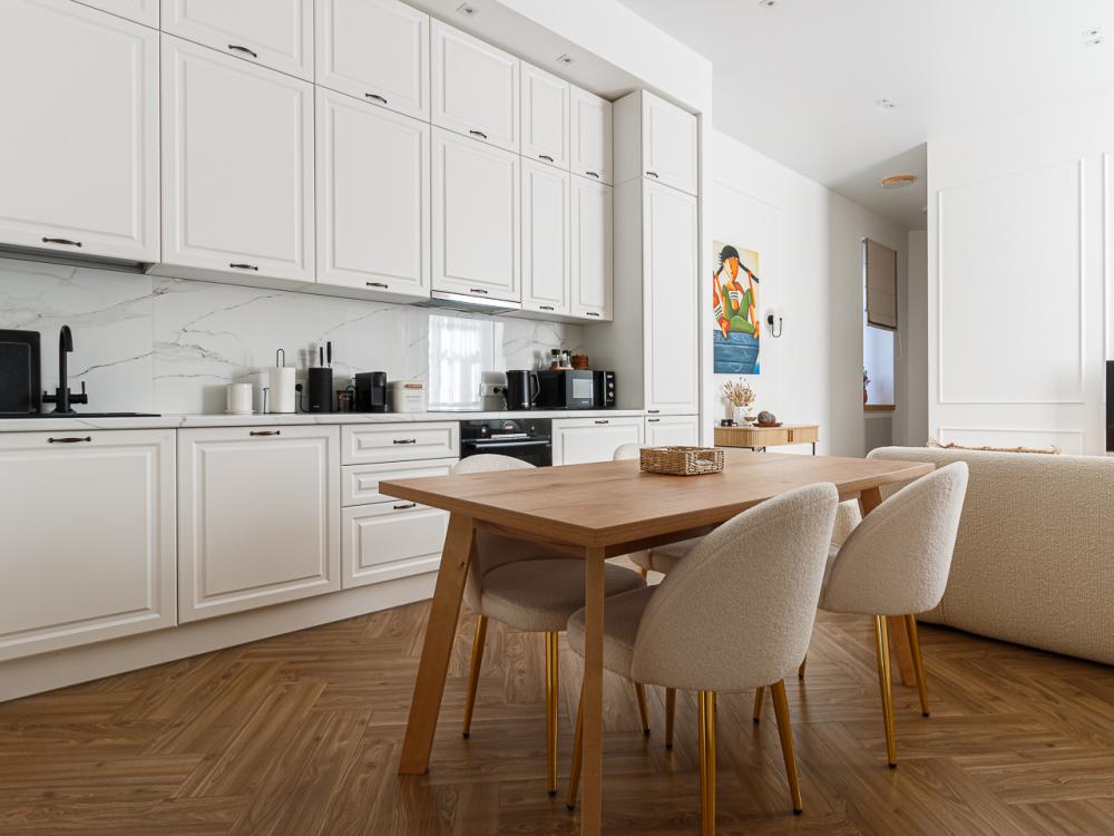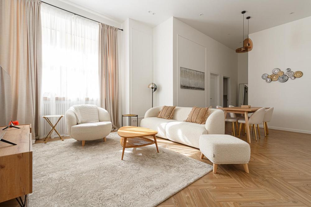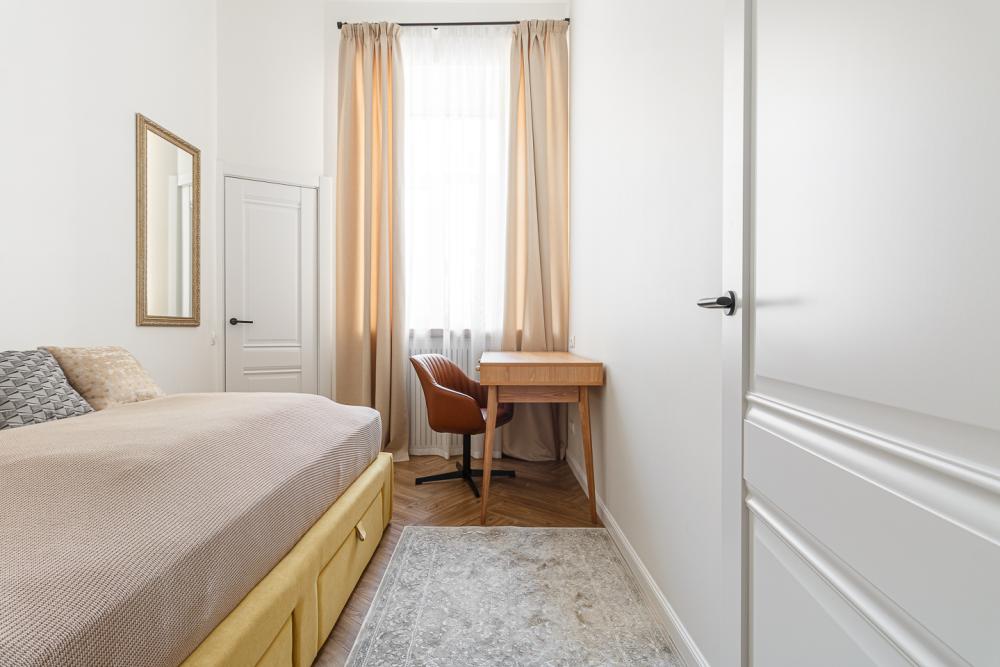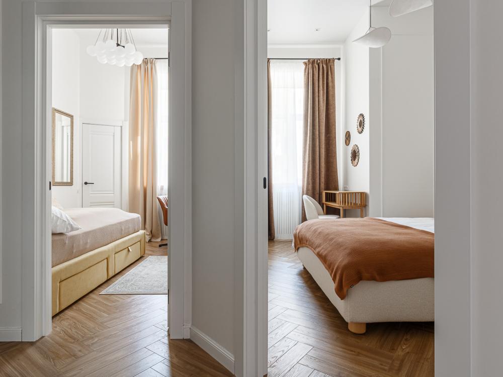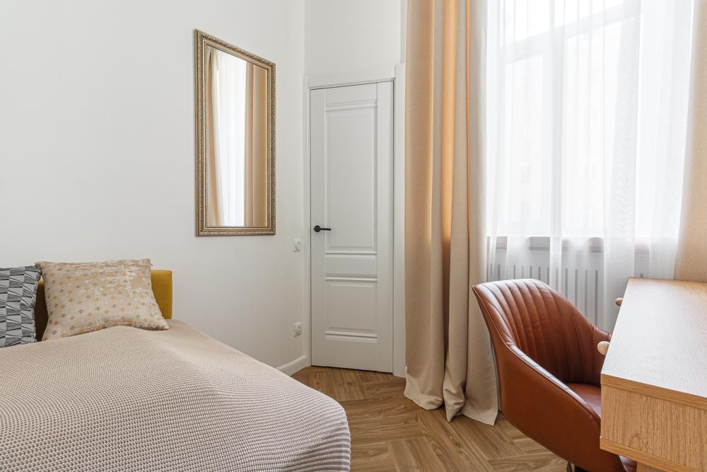 Большая, уютная и светлая квартира (кухня-гостиная) с двумя отдельными спальнями / комнатами. Локация. Квартира расположена в тихом центре Санкт-Петербурга. В пешей доступности Таврический и Некрасовский сады (10 минут пешком), метро Чернышевская и пл. Восстания (15 минут пешком). В самом доме, и вокруг него, расположено много продуктовых магазинов, ресторанов и кафе. Окна квартиры выходят в тихий, просторный, светлый и закрытый внутренний двор. Парковочного места нет. Но, вдоль дома имеются платные парковочные места. Описание. Общая площадь квартиры 82.6 м2. Высота потолков 3.5 м. В квартире только что завершен дизайнерский ремонт. Квартира расположена на втором этаже (лифта нет). В квартире новая мебель. Кухня полностью оборудована бытовой техникой (включая и посудомоечную машину). Стиральная машина установлена в отдельной бытовой комнате / кладовке. Всего в квартире 4 спальных места. Размеры спальных мест: Двуспальная кровать в большой спальне: ширина — 160 см, длина — 200 см. Полуторная кровать в маленькой спальне: ширина — 120 см, длина — 200 см. Односпальный диван в гостиной: ширина — 60 см, длина — 170 см. В маленькой комнате имеется рабочее место и маленький гардероб. Также, в квартире предусмотрена отдельная, просторная гардеробная комната. Санузел раздельный: Отдельно – туалет. Отдельно – ванная комната с просторной душевой. Имеется бойлер. Напор воды в квартире очень хороший.