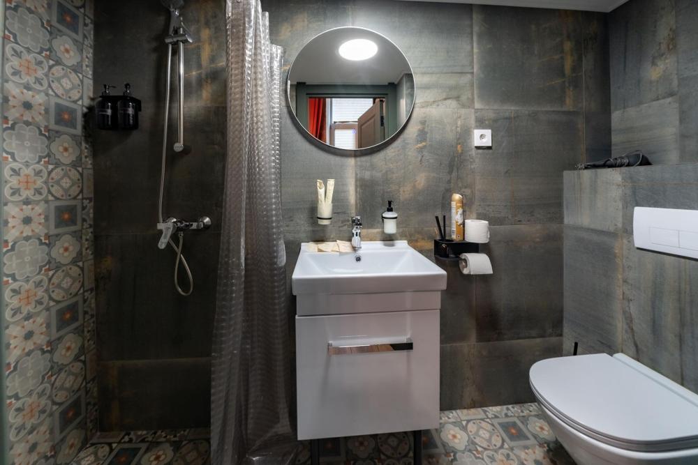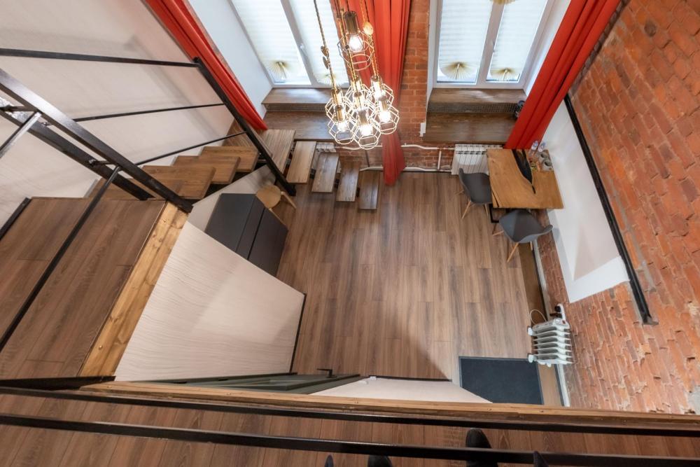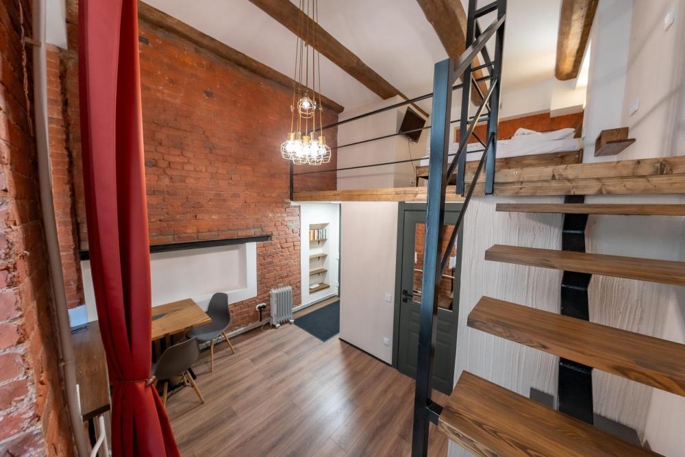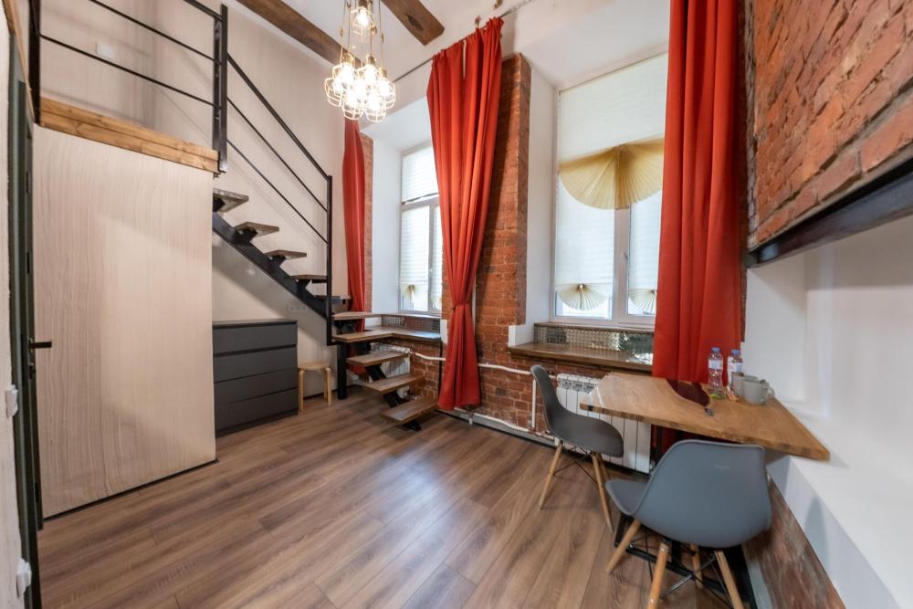 Двухуровневая студия на 1 этаже площадью 16-20 м² с высокими потолками и большими окнами. Высота потолка на втором уровне 170 см. Для Вашего удобства студии оборудованы двуспальными кроватями шириной 160 см. Также в студиях есть кресло, стол, стулья, зеркало, телевизор и чайный набор. Окна выходят в Керченский или Черноморский переулок. В ванной комнате для вас приготовлены полотенца, косметические и зубные наборы. Заселение бесконтактное, инструкции отправляются накануне заезда.