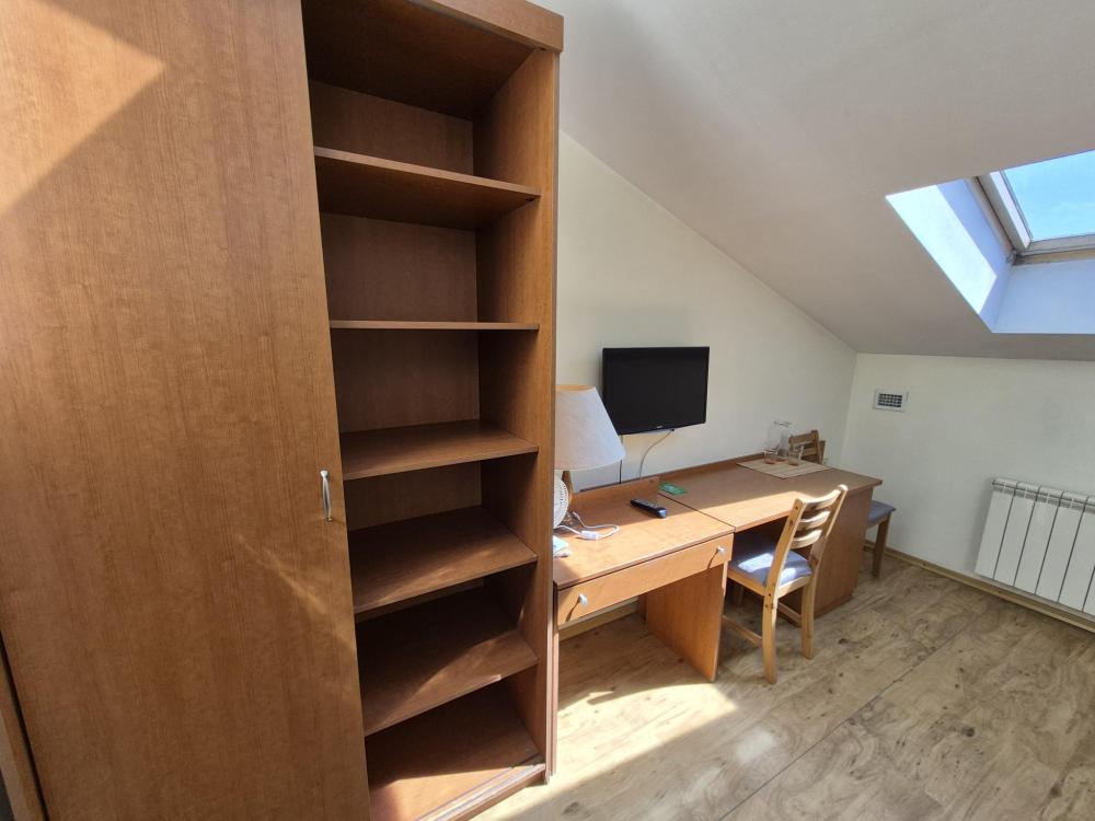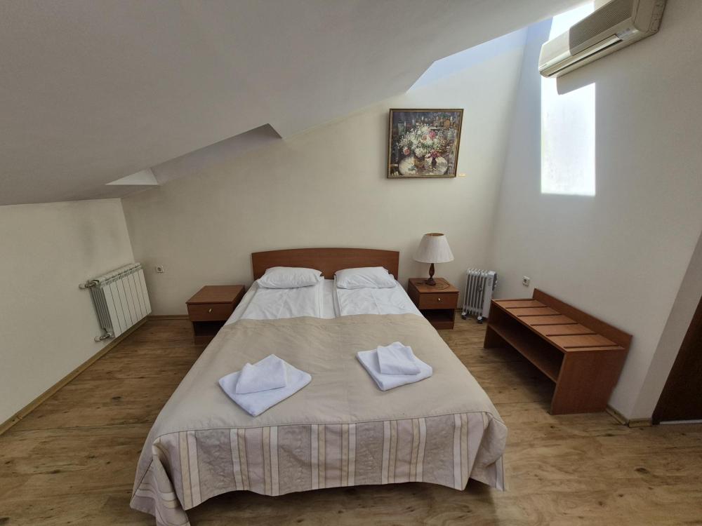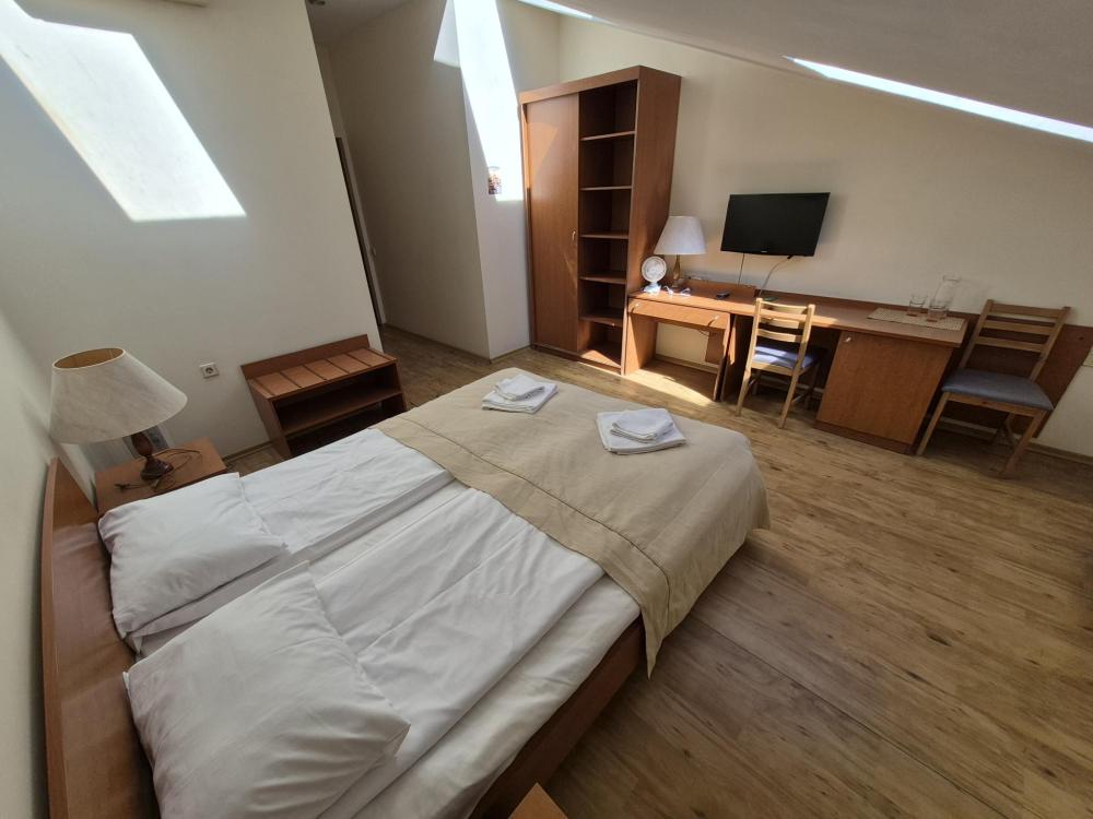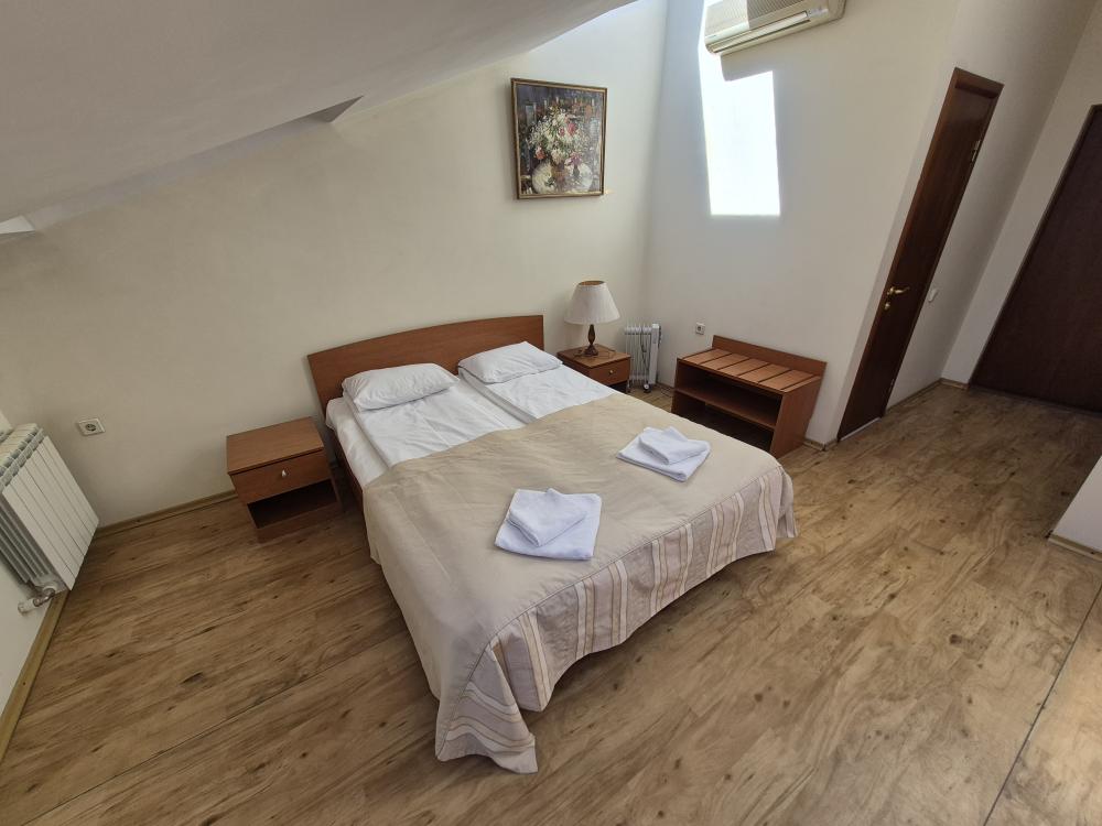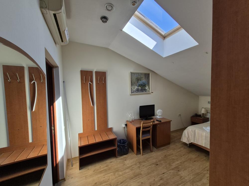 Компактная комната с продуманной планировкой. Двуспальная кровать, личный санузел с душем, холодильник и вместительный шкаф создают атмосферу домашнего уюта. Естественный свет проникает через мансардные окна, добавляя помещению особый шарм. Общая кухня-столовая для самостоятельного использования. Гостиничные услуги не оказываются.