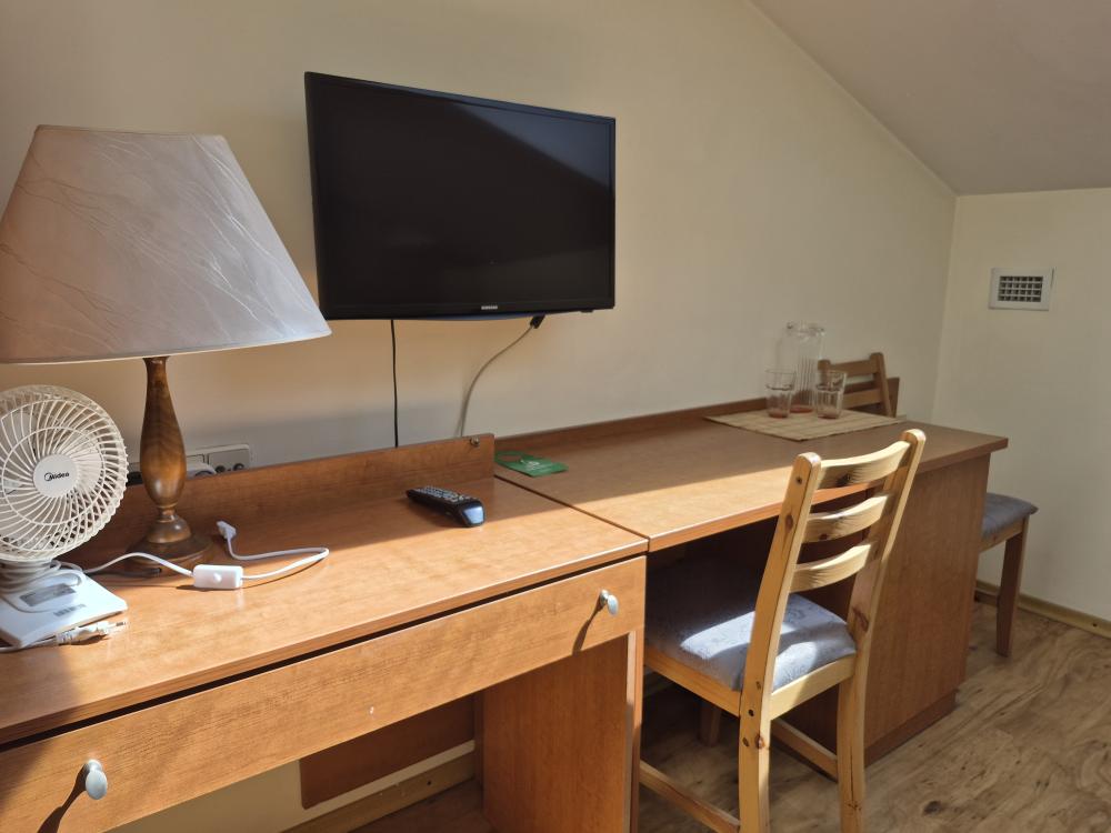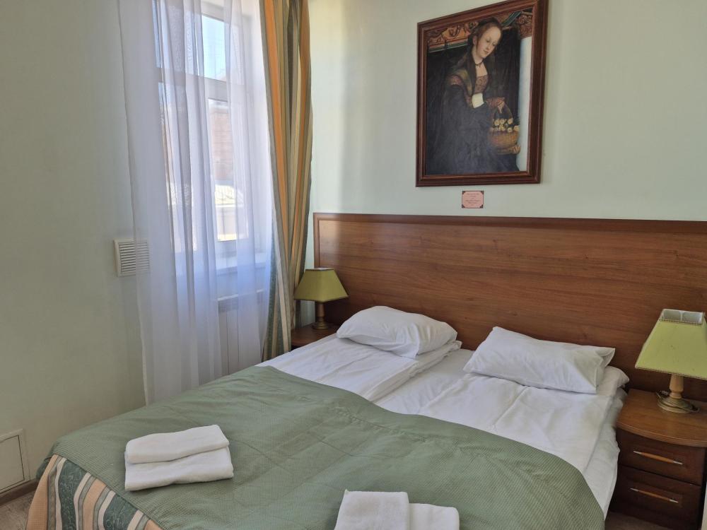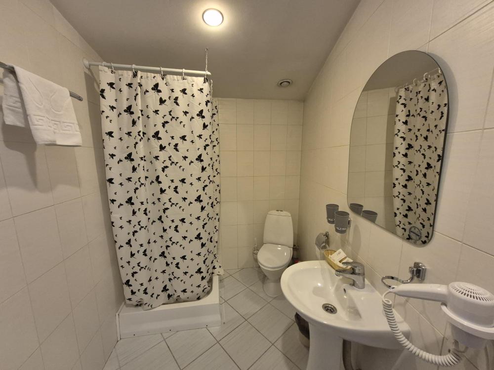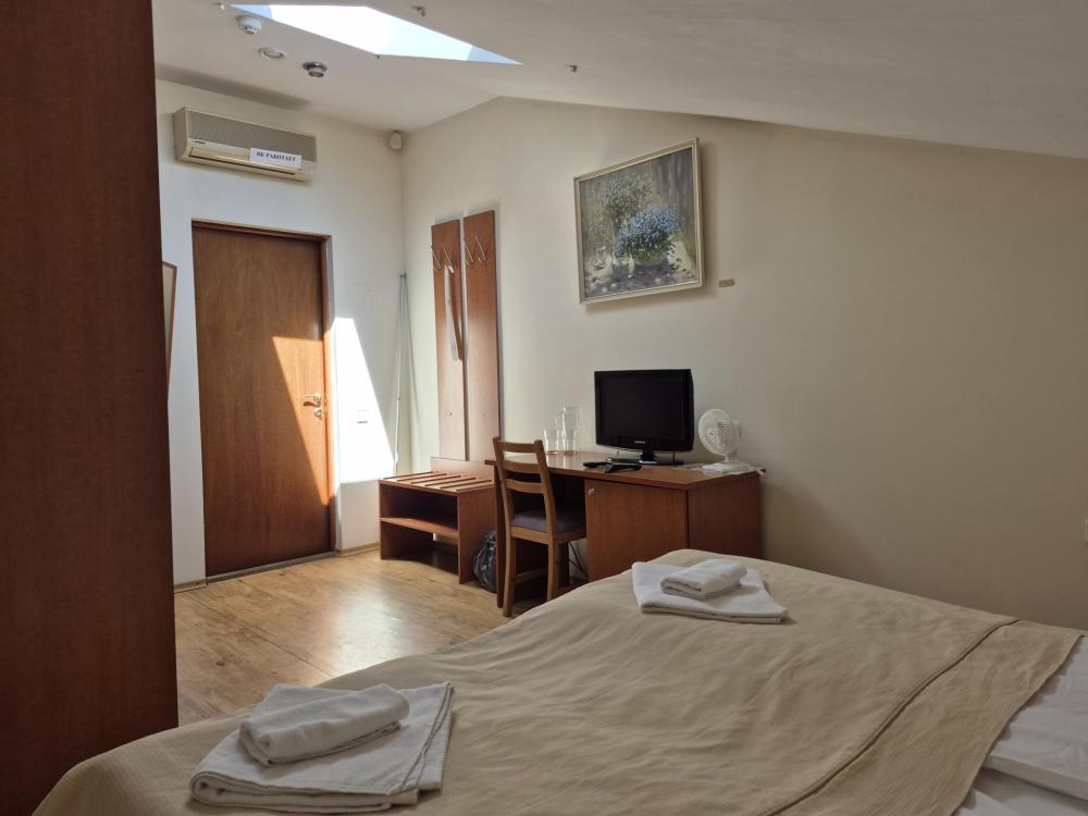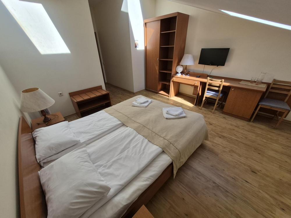 Компактная комната с продуманной планировкой. Двуспальная кровать, личный санузел с душем, холодильник и вместительный шкаф создают атмосферу домашнего уюта. Естественный свет проникает через мансардные окна, добавляя помещению особый шарм. Общая кухня-столовая для самостоятельного использования. Гостиничные услуги не оказываются.