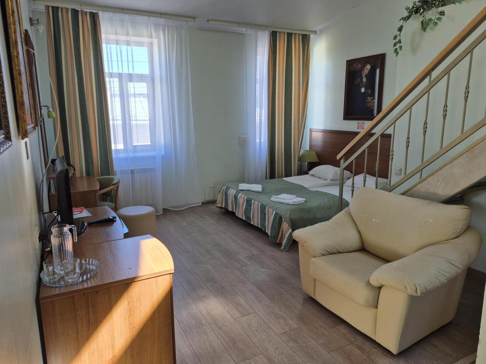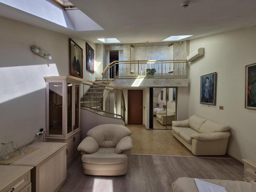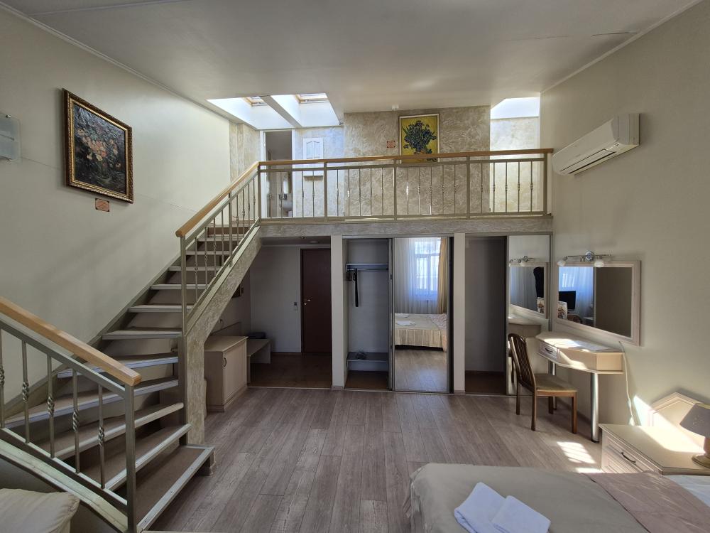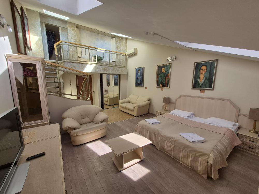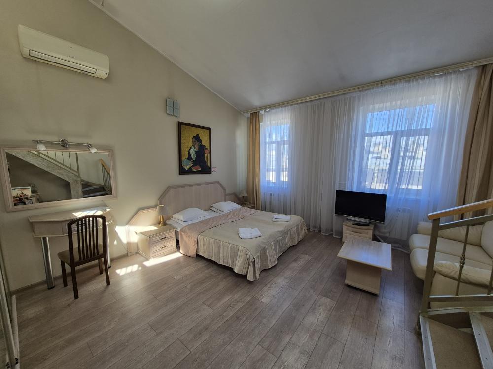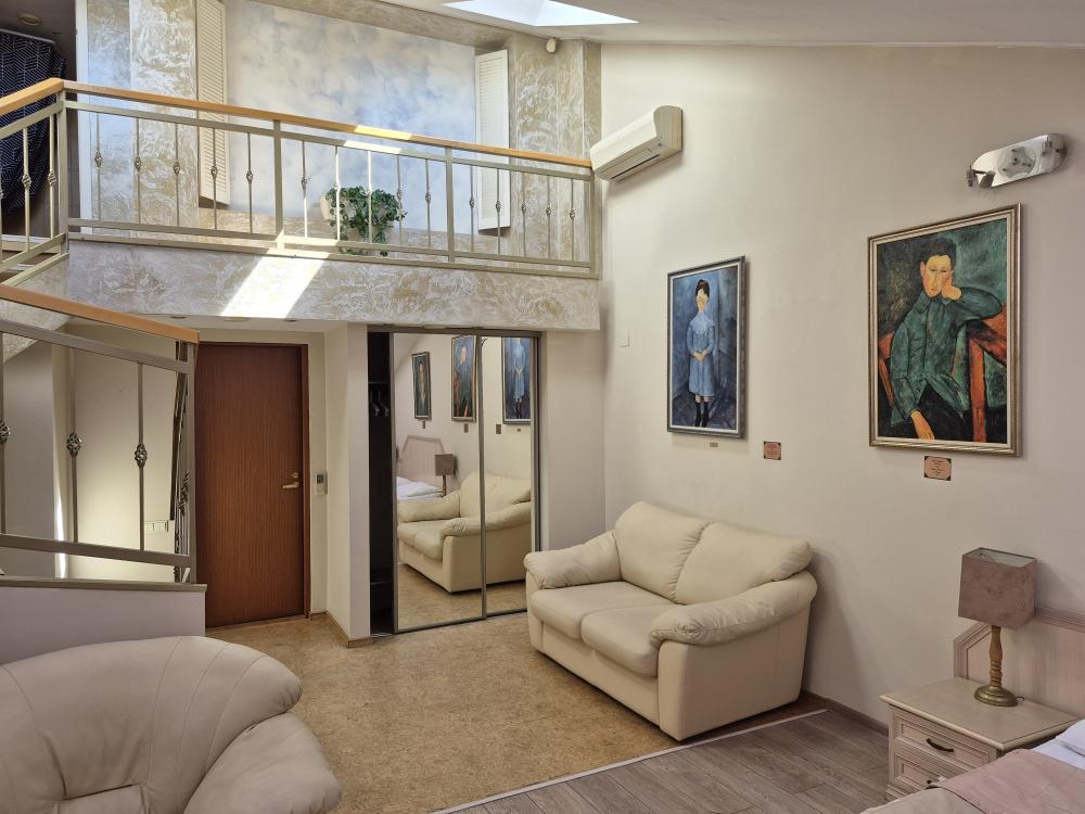Двухуровневая комната с высоким потолком и продуманной зоной для отдыха и работы. На первом уровне — просторная жилая зона с двуспальной кроватью, удобным диваном и креслом, где можно расслабиться после насыщенного дня или провести неформальную встречу. Кондиционер, холодильник и рукотворные репродукции картин маслом создают атмосферу, где деловой подход встречается с вниманием к деталям. Общая кухня-столовая для самостоятельного использования. Гостиничные услуги не оказываются.