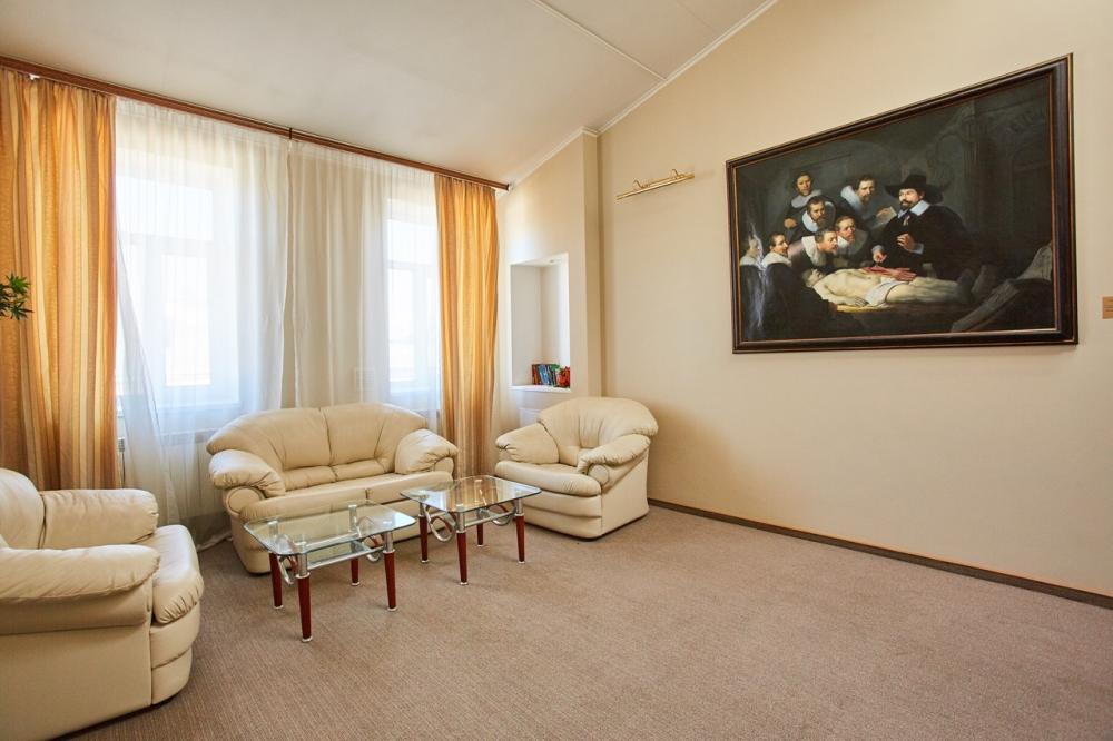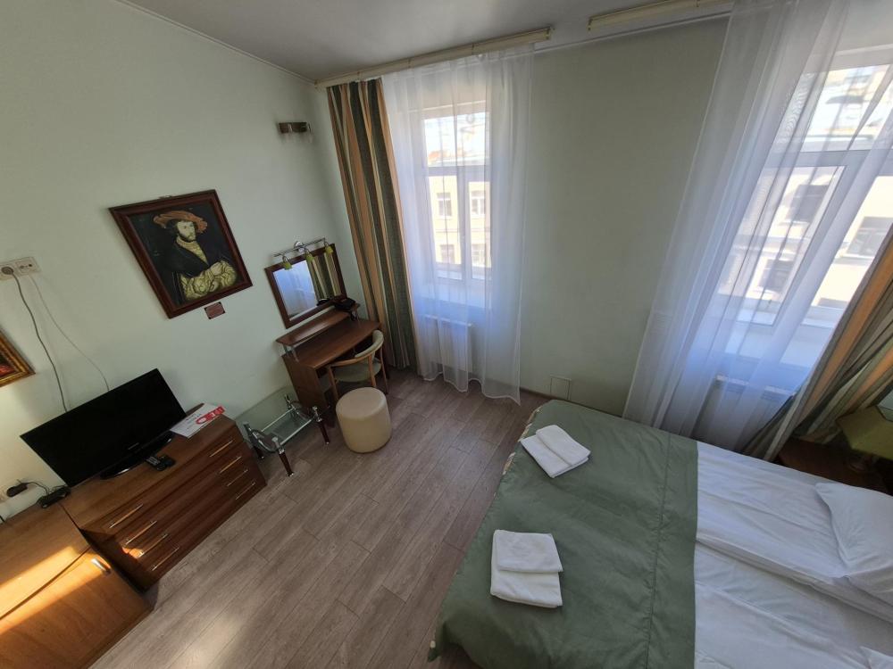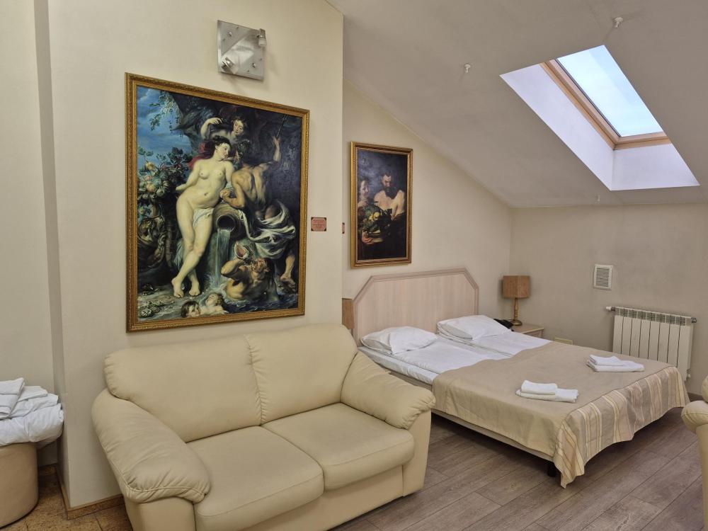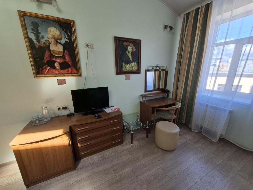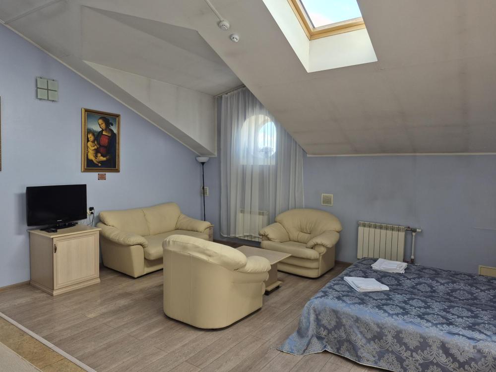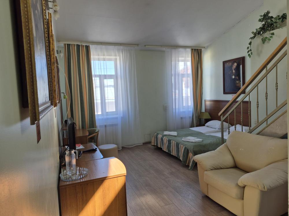 Двухуровневая комната с высоким потолком и продуманной зоной для отдыха и работы. На первом уровне — просторная жилая зона с двуспальной кроватью, удобным диваном и креслом, где можно расслабиться после насыщенного дня или провести неформальную встречу. Кондиционер, холодильник и рукотворные репродукции картин маслом создают атмосферу, где деловой подход встречается с вниманием к деталям. Общая кухня-столовая для самостоятельного использования. Гостиничные услуги не оказываются.