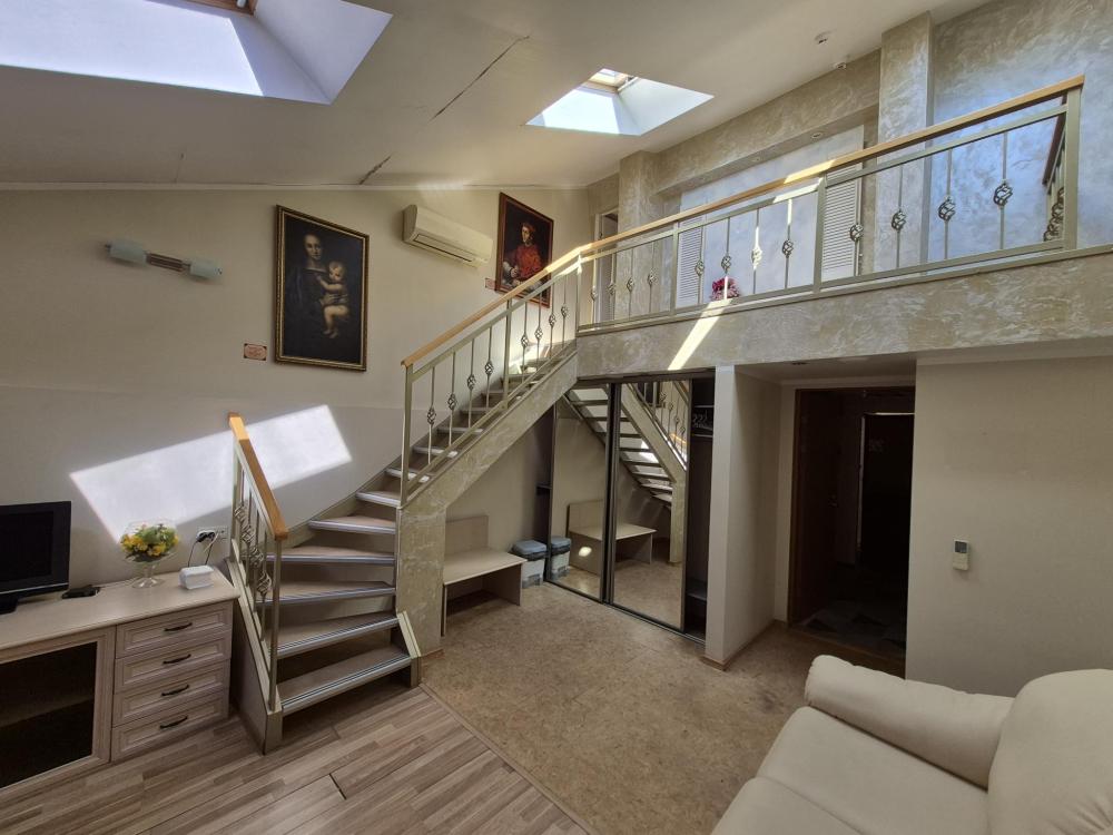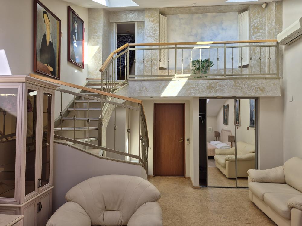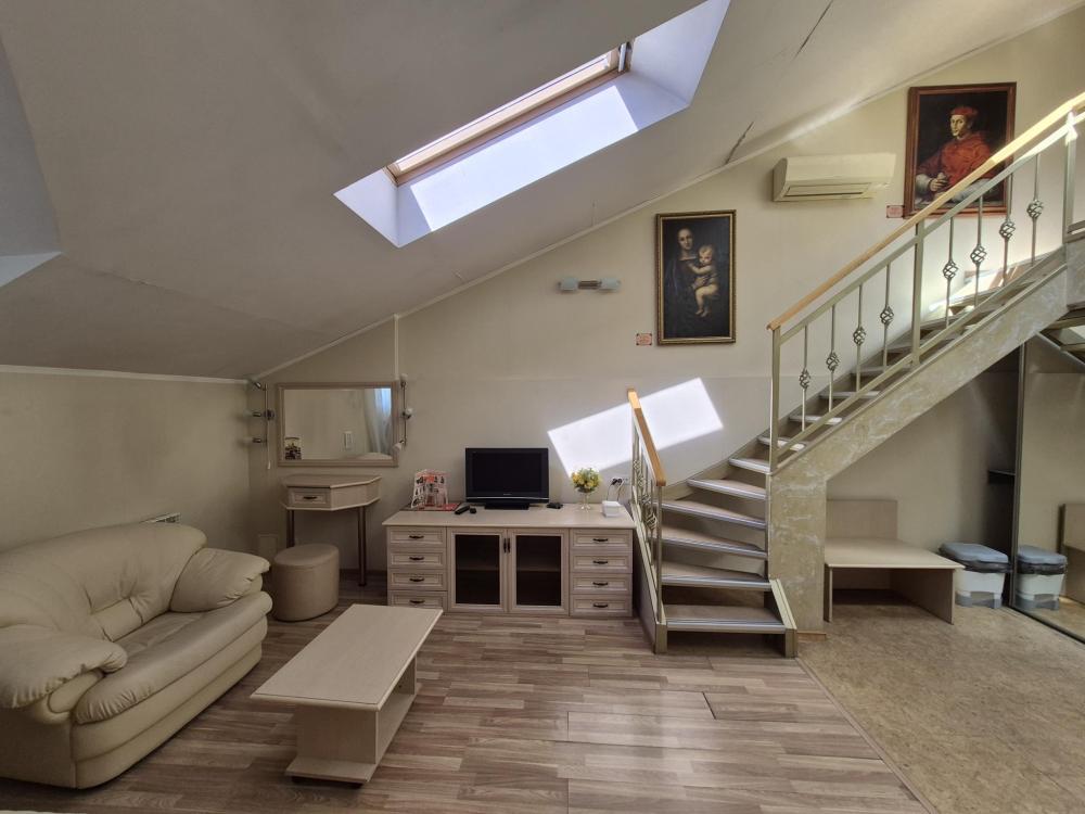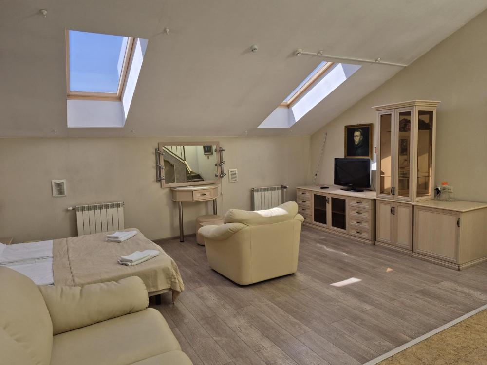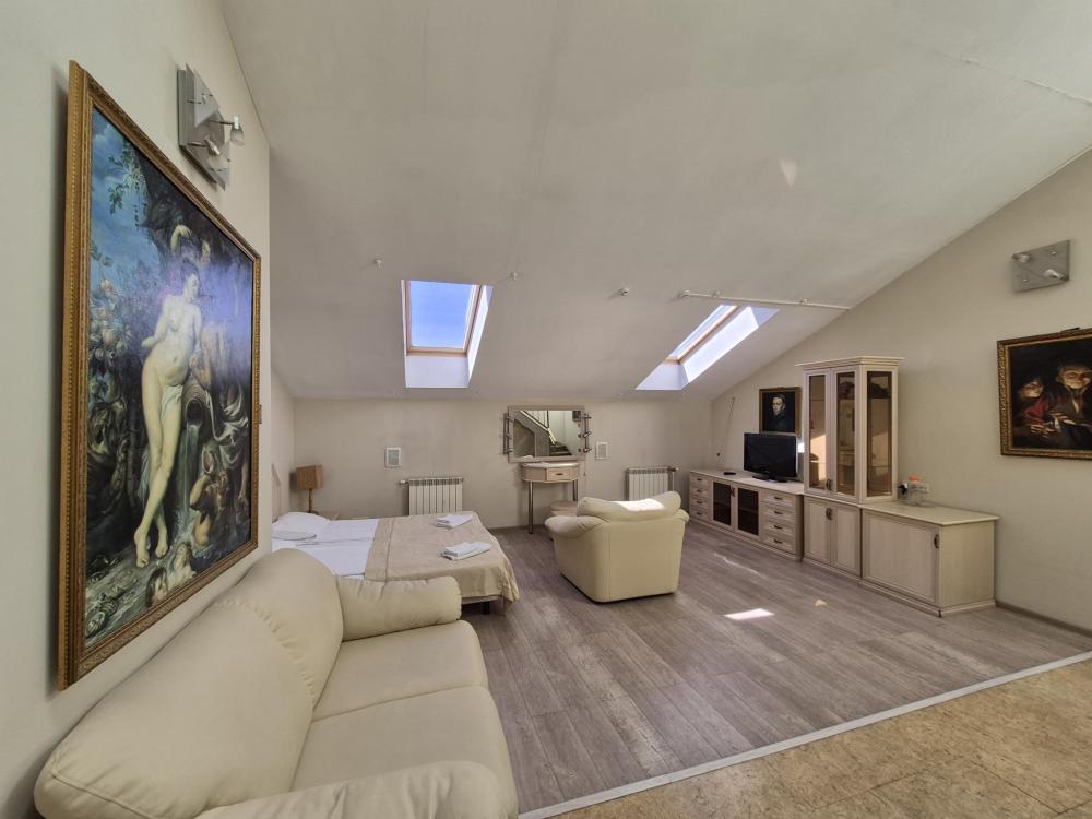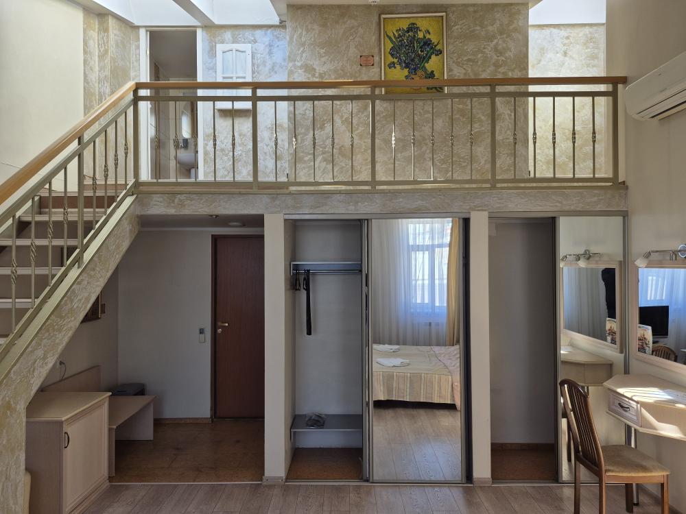 Впечатляющий пятиметровый потолок и двухуровневая планировка создают ощущение простора и свободы. Жилая зона на первом уровне располагает к отдыху, а санузел на втором уровне обеспечивает приватность. Кондиционер поддерживает комфортный микроклимат в любое время года, а репродукции картин маслом добавляют интерьеру художественный акцент. Мансардные окна наполняют комнату светом и создают особую атмосферу. Общая кухня-столовая для самостоятельного использования. Гостиничные услуги не оказываются.