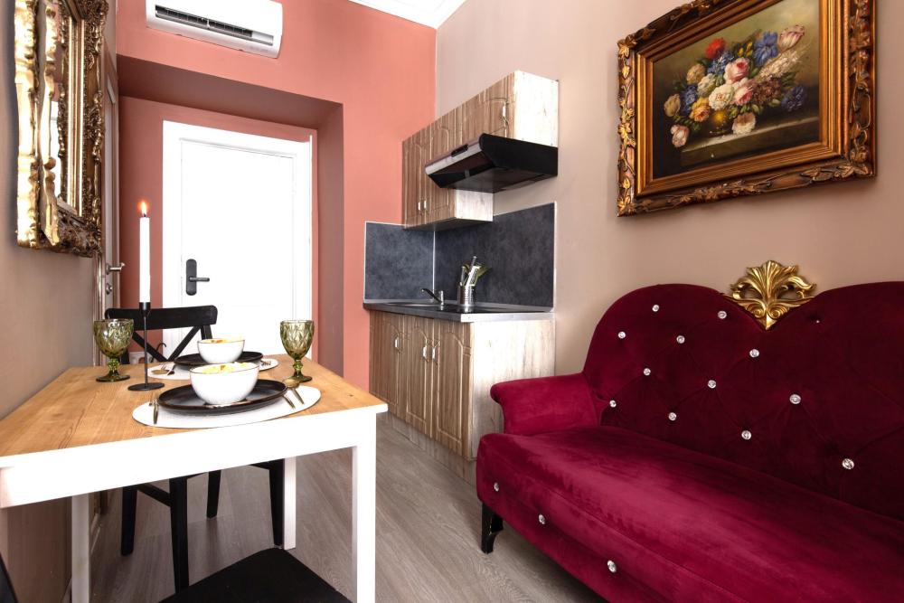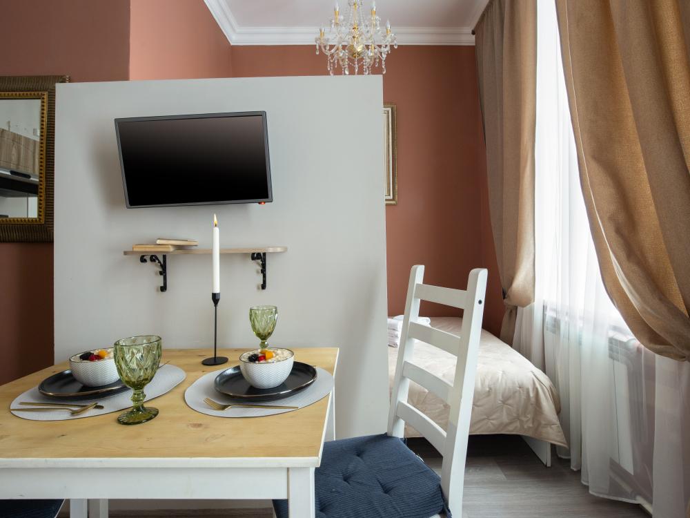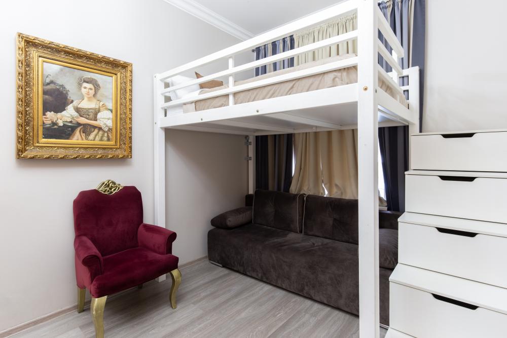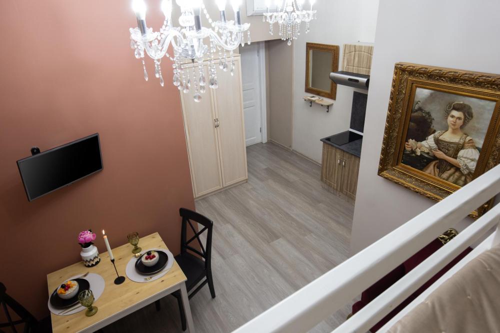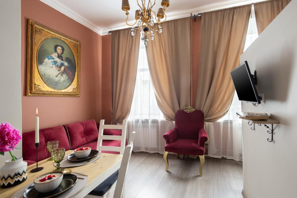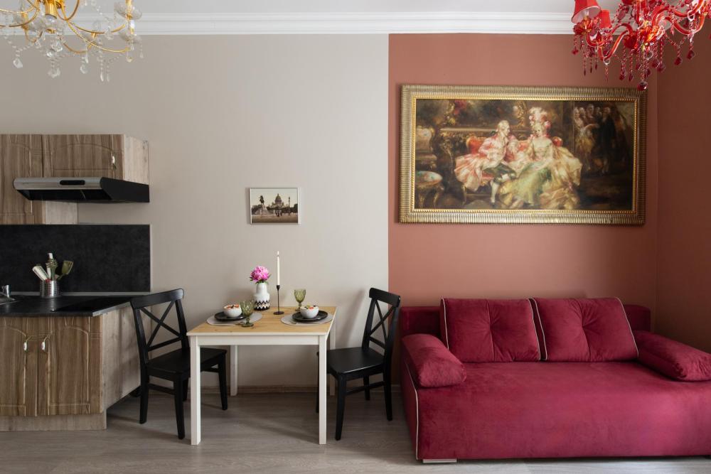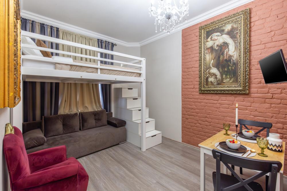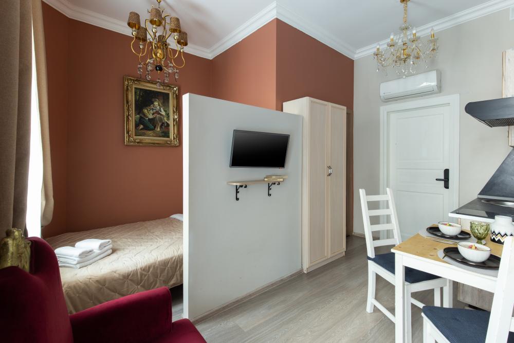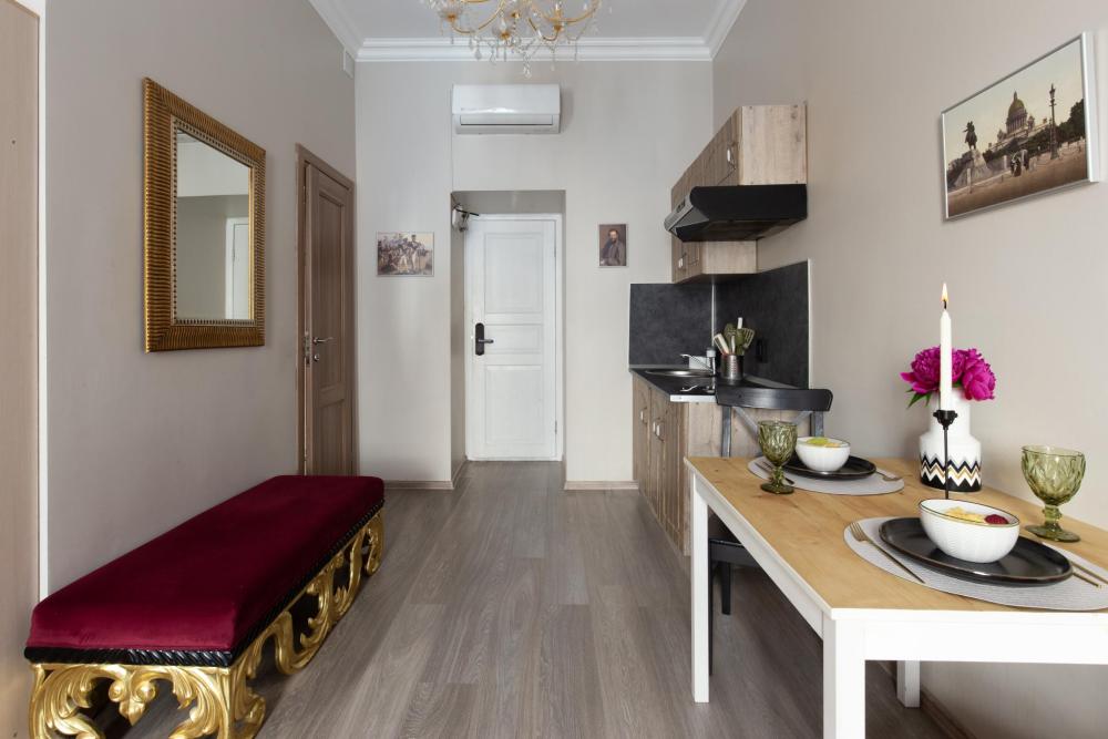 Апартаменты-студия выполнены в современном классическом стиле и дополнены элементами декора. Окна апартаментов выходят в тихий двор. Квартира-студия максимально функциональная: имеет выделенную спальную зону с удобной двухспальной кроватью. Также, в студии сделана гостиная зона с диваном-кроватью и TV с плоским экраном, мини-кухня с посудой и техникой для приготовления пищи, санузел с душем и туалетом. Несмотря на то, что в Петербурге жаркое лето длится недолго, мы предусмотрели полноценные кондиционеры для Вашего комфорта. Вас порадует множество удобных мелочей. Двор закрывается на автоматические ворота-калитку. Вокруг множество атмосферных кафе, бистро, ресторанов, магазинов, в том числе работающих круглосуточно; хорошая кондитерская. Ближайшее метро - 3 минут пешком. Пешие прогулки к культовым достопримечательностям: Казанский и Исаакиевский соборы, Дворцовая площадь, Эрмитаж. Метро 3 мин. пешком.