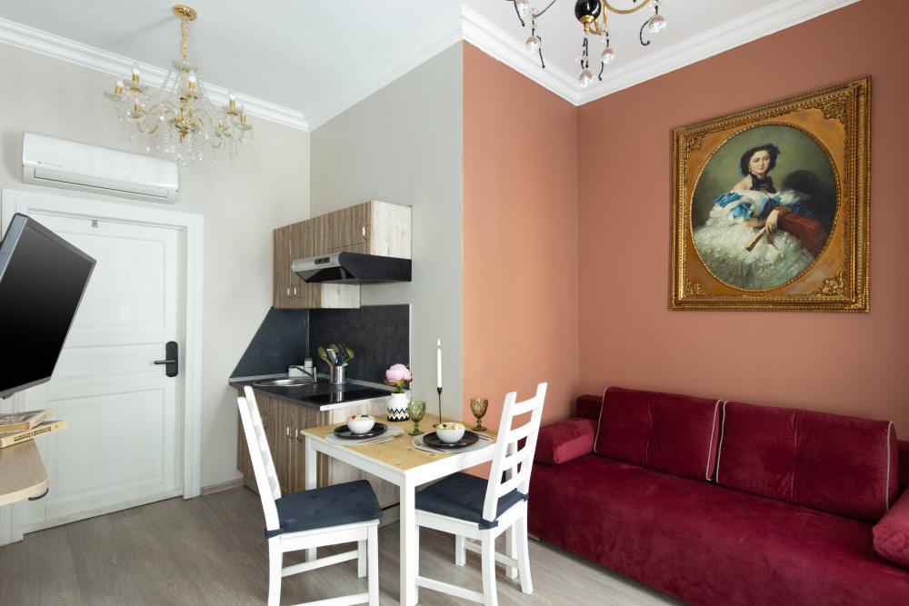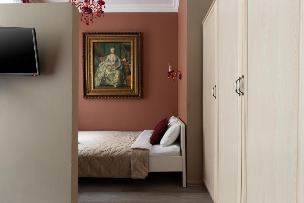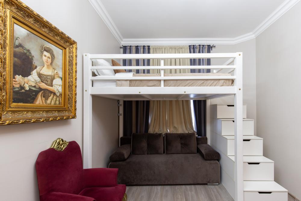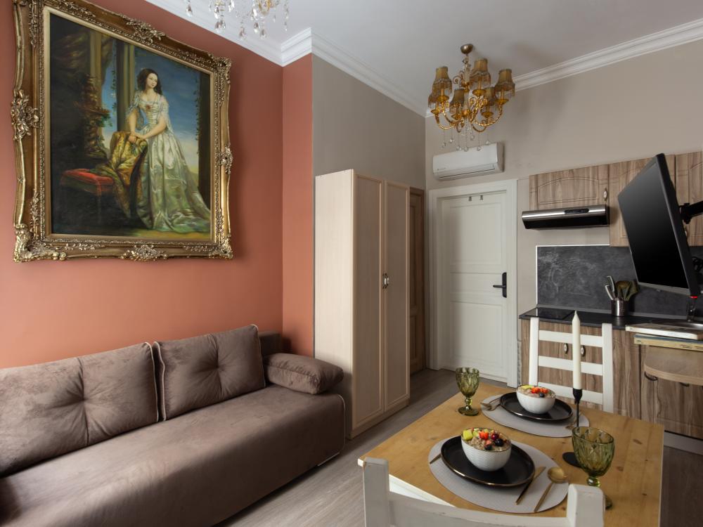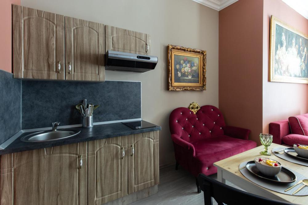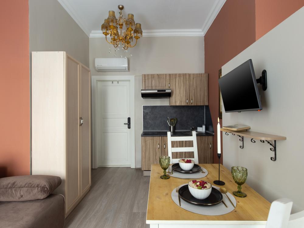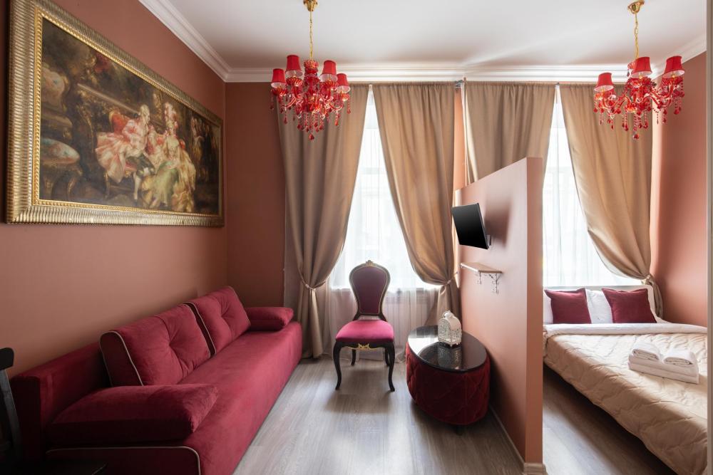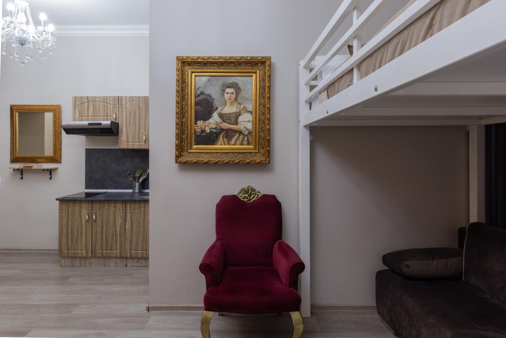 Апартаменты-студия выполнены в современном классическом стиле и дополнены элементами декора. Окна апартаментов выходят в тихий двор. Квартира-студия максимально функциональная: имеет выделенную спальную зону с удобной двухспальной кроватью. Также, в студии сделана гостиная зона с диваном-кроватью и TV с плоским экраном, мини-кухня с посудой и техникой для приготовления пищи, санузел с душем и туалетом. Несмотря на то, что в Петербурге жаркое лето длится недолго, мы предусмотрели полноценные кондиционеры для Вашего комфорта. Вас порадует множество удобных мелочей. Двор закрывается на автоматические ворота-калитку. Вокруг множество атмосферных кафе, бистро, ресторанов, магазинов, в том числе работающих круглосуточно; хорошая кондитерская. Ближайшее метро - 3 минут пешком. Пешие прогулки к культовым достопримечательностям: Казанский и Исаакиевский соборы, Дворцовая площадь, Эрмитаж. Метро 3 мин. пешком.