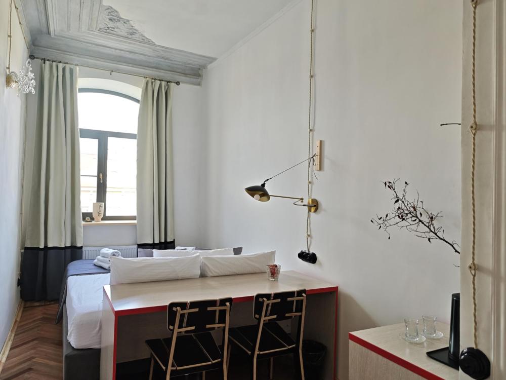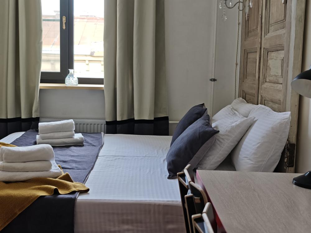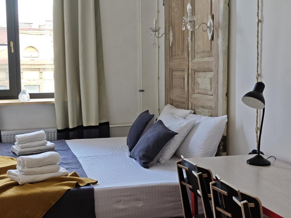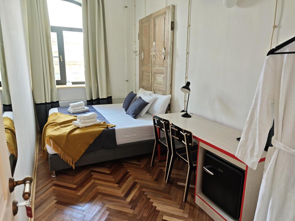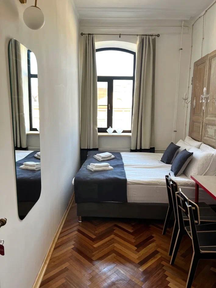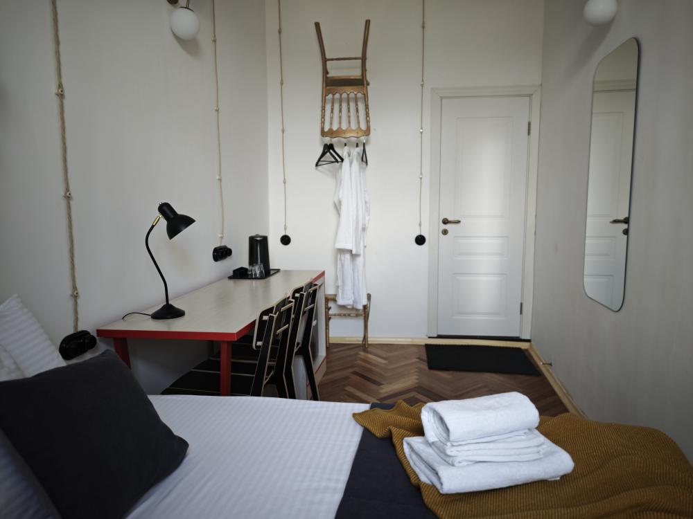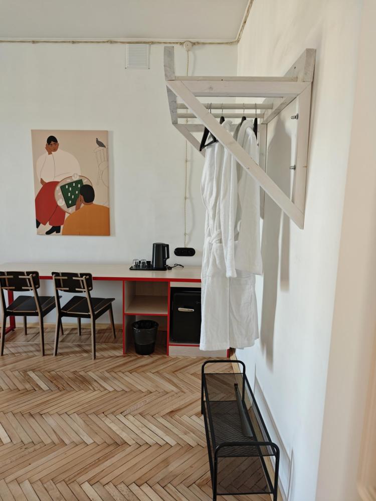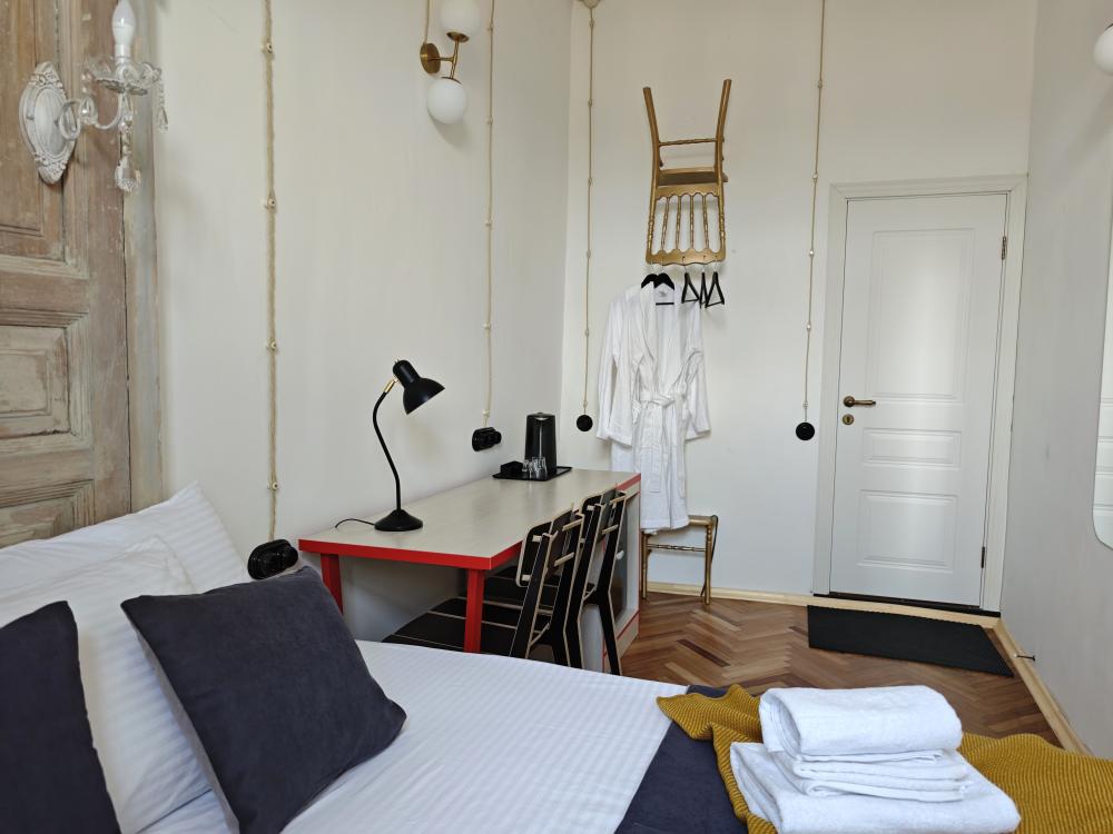 Уютная комната для 2 гостей, оборудованная всем необходимым для комфортного проживания. В комнате: двуспальная или 2 односпальные кровати, чайник, мини-холодильник. Гостям предоставляются халаты, полотенца и постельное белье. Санузел и душевые общие. Комнаты расположены на 5 этаже без лифта.