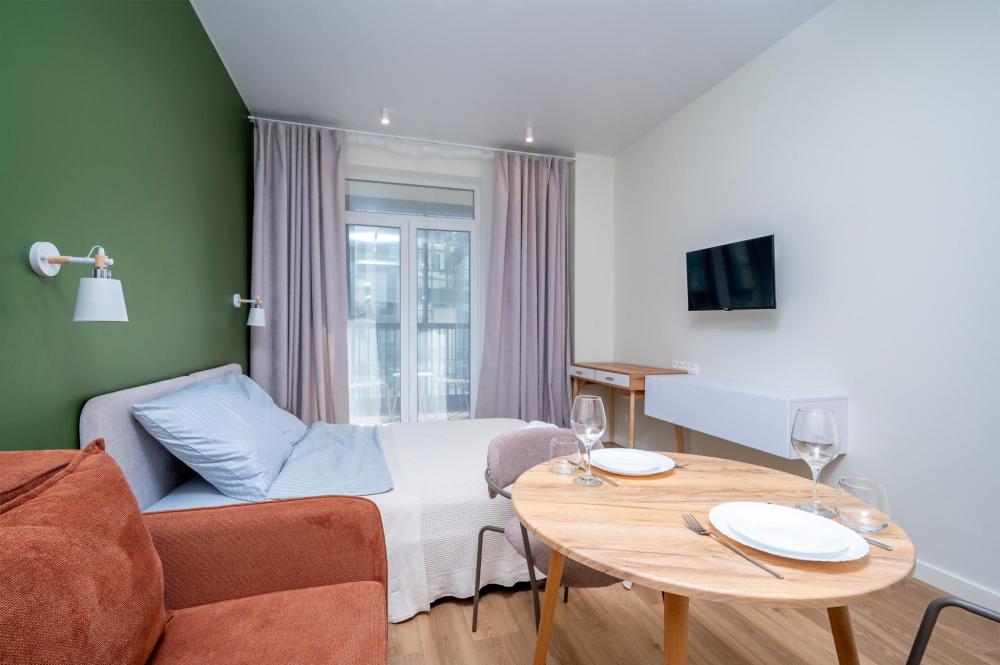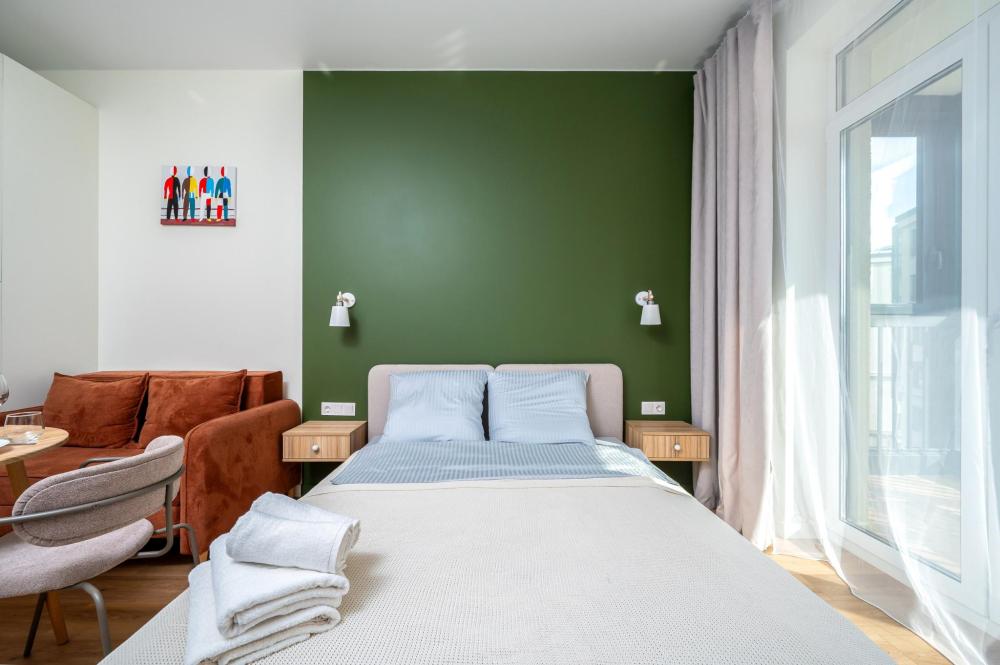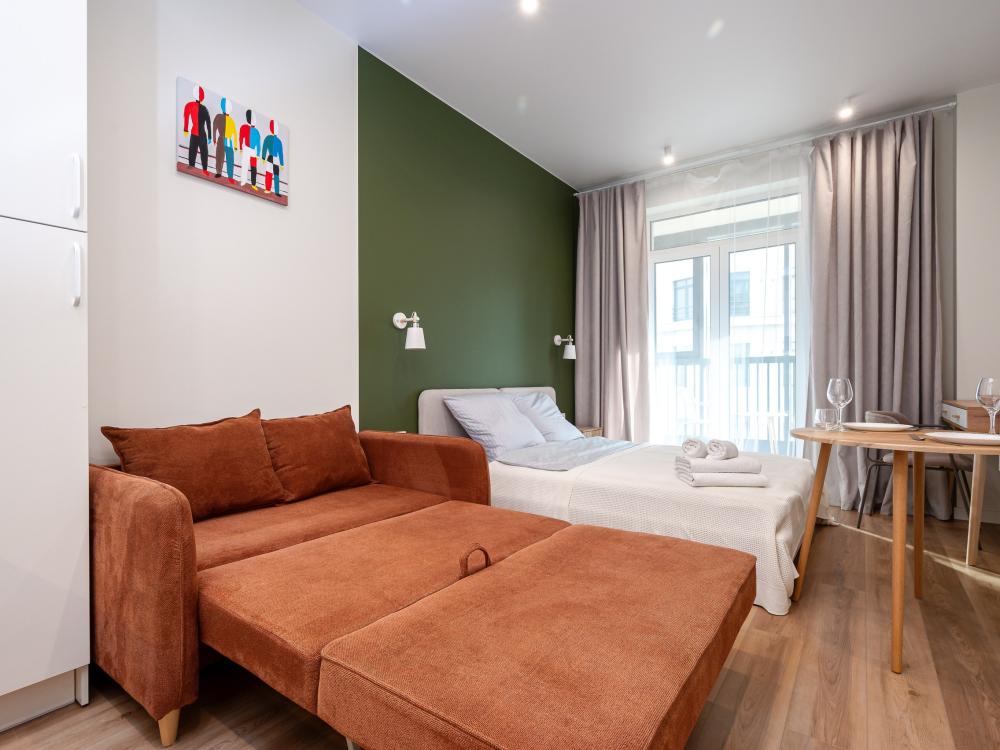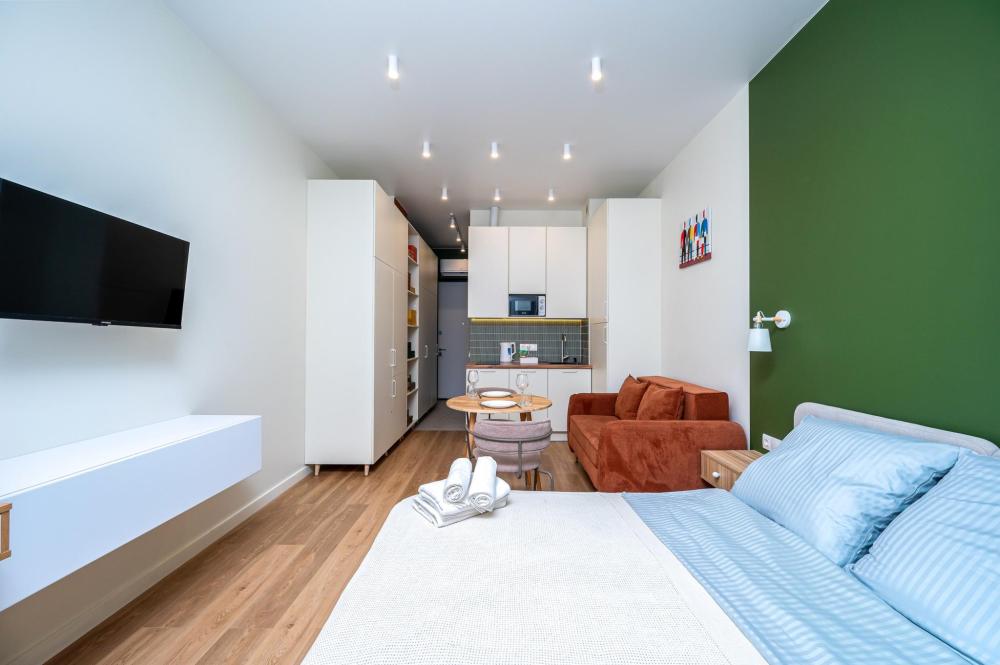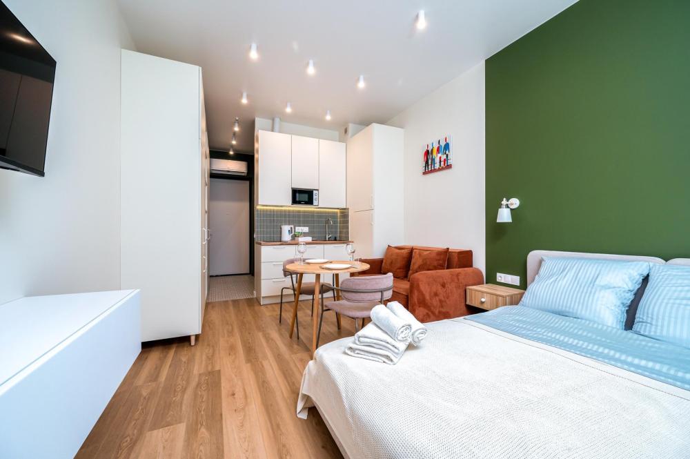 Комфортное размещение для 4 человек: двуспальная кровать (140х200) и раскладной диван (120х190). Квартира полностью соответствует всем фото. В кухонной зоне: посудомоечная машина, микроволновая печь, холодильник, чайник, посуда и столовые приборы. Чай, кофе, сахар, соль, конфеты. В ванной комнате: туалет, душ, стиральная машина, фен, утюг, набор гигиенических средств, тапочки, полотенца для ног, рук и тела на каждого гостя. В местах отдыха: постельное белье на каждого гостя, ЖК телевизор со Smart TV, высокоскоростной Wi-Fi в номере бесплатно, кондиционер, шторы блэкаут, рабочее места с дополнительным освещением, зеркало в полный рост.
