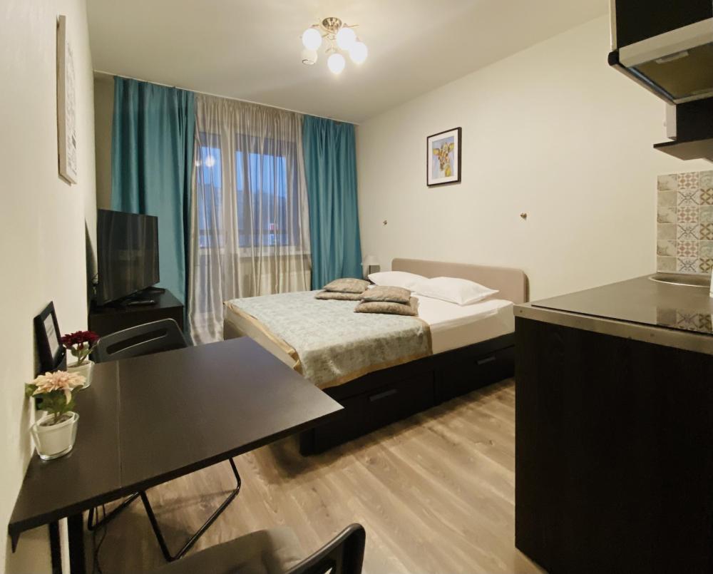 Апартаменты расположены недалеко от центра. Рядом находятся: гипермаркет "Перекресток", большая наземная бесплатная парковка и платная подземная, через дорогу большой и красивый парк Лесотехнической академии, на первом этаже комплекса - ресторан Лесопилка, СПА-комплекс с тренажёрным залом, бассейном, сауной. Во дворе оборудованная детская площадка. Рядом автозаправка и автомойка. Студия оборудована всем необходимым для комфортного проживания: телевизор, быстрый wi-fi, кухня (варочная поверхность, микроволновая печь, чайник, холодильник, посуда), санузел с ванной, стиральная машина, гладильные принадлежности, фен, шкафы. В студии двуспальная кровать, которая при желании трансформируется в две односпальные, есть обеденный стол и рабочее место. Утеплённый балкон с креслами. Проживание с животными возможно по предварительной договоренности, за отдельную плату, взимается обязательный депозит за сохранность имущества, при выезде возвращается.