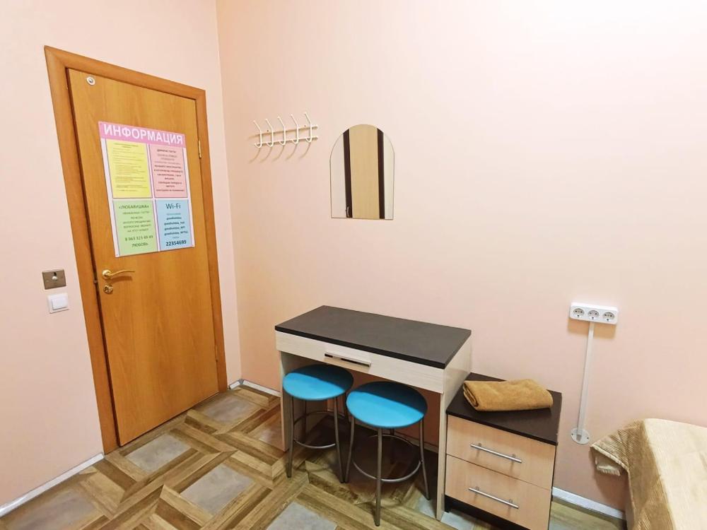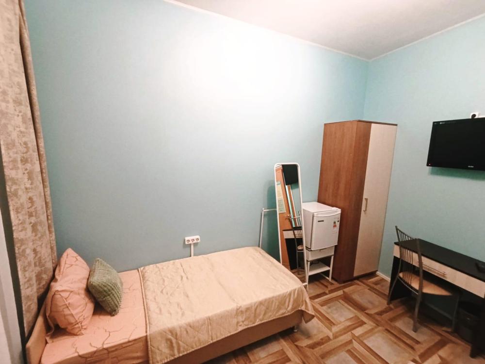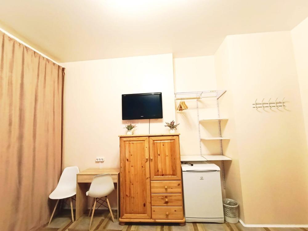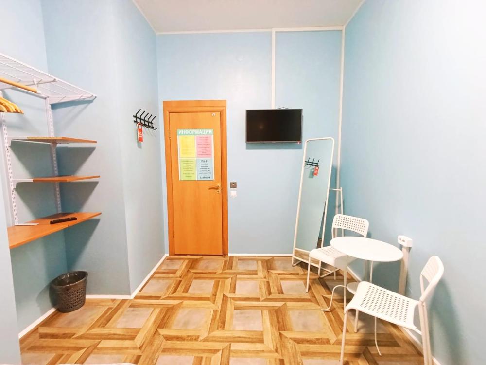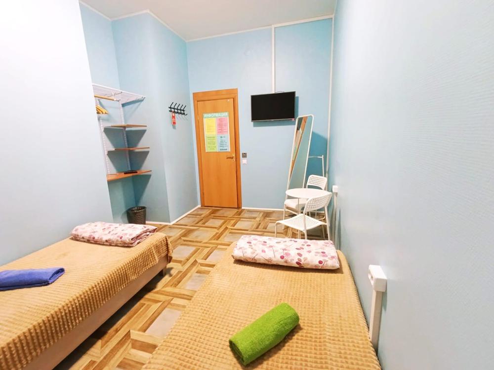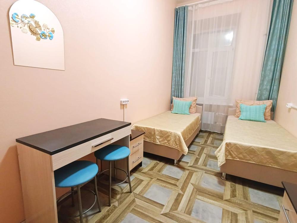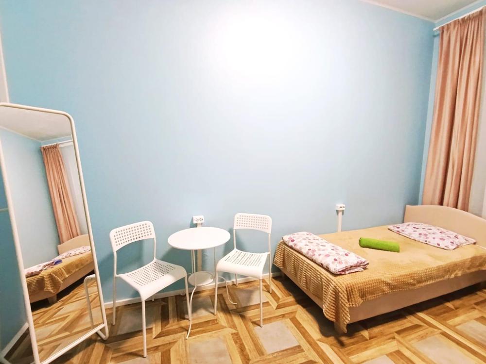 Двухместная комната с двумя раздельными кроватями. В комнате есть гардеробная настенная система для вещей, зеркало, стол и стулья, телевизор. Для гостей оборудованы общие санузлы и душевые: 3 санузла и 2 душевые на 7 комнат. В большой общей кухне-гостиной есть все необходимое: два холодильника, электрическая панель, микроволновая печь, тостер, термопот, посуда для приготовления и принятия пищи, чай, кофе, какао, фильтр для воды. Также в общем доступе есть гладильная доска, утюг, стиральная машина, фены.