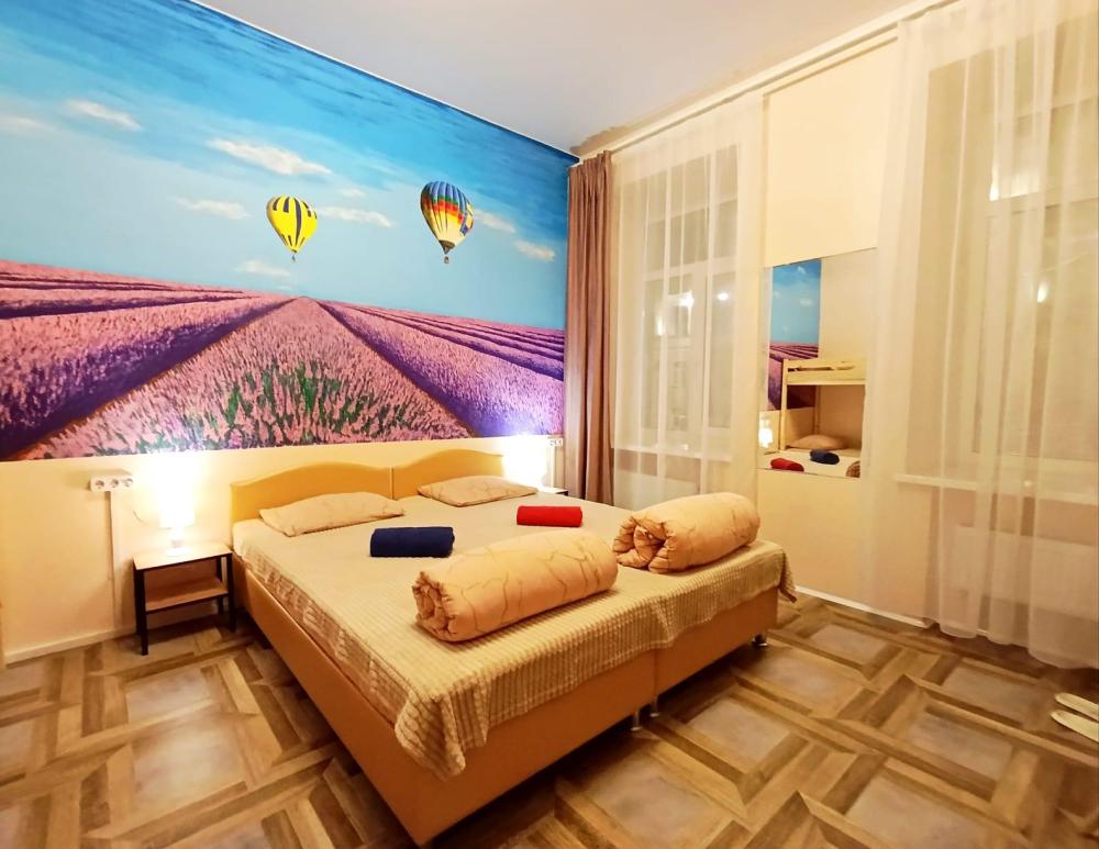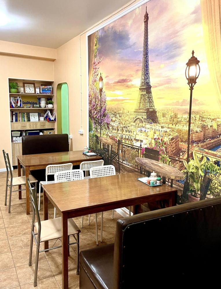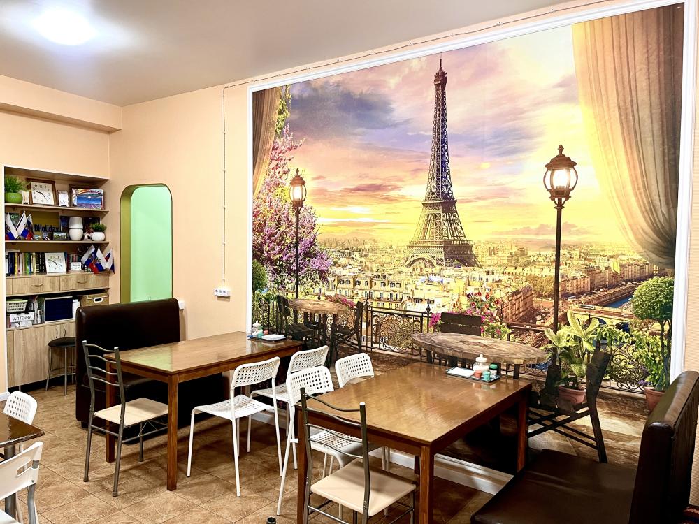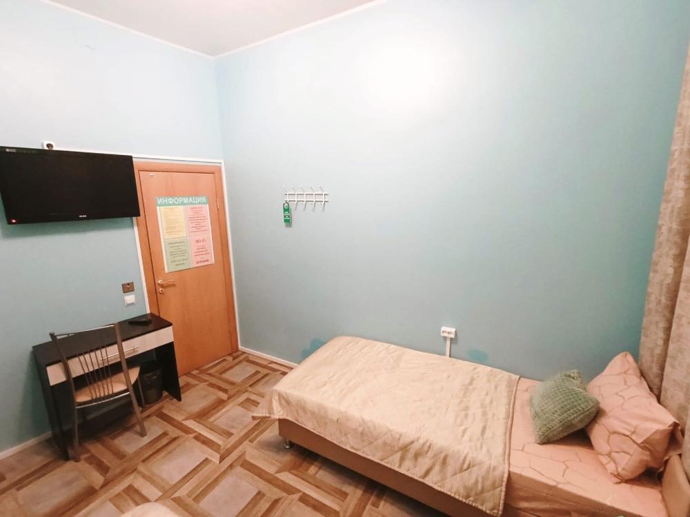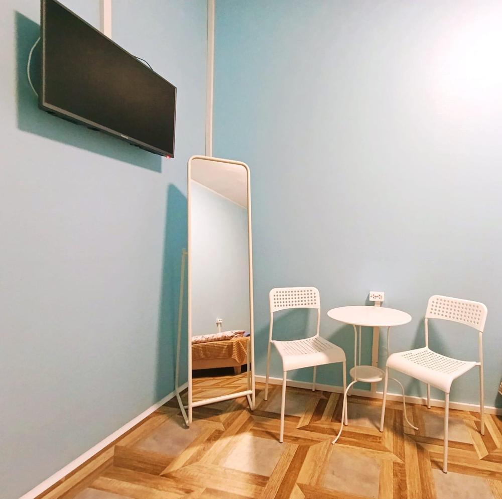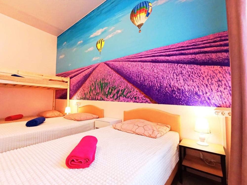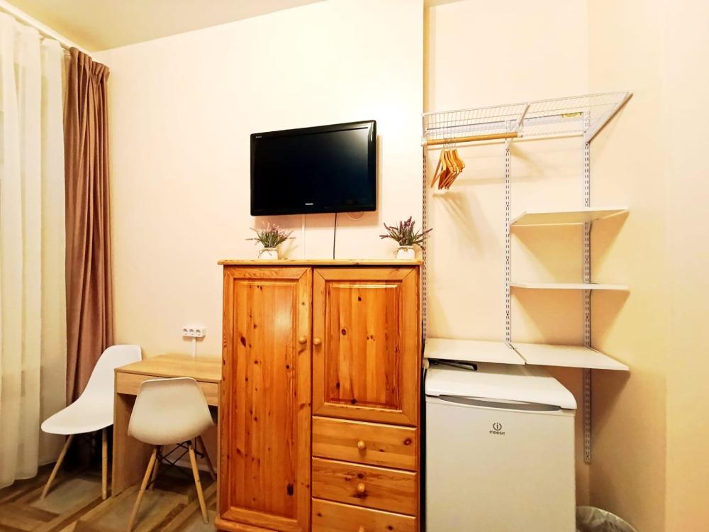 Двухместная комната с двумя раздельными кроватями. В комнате есть гардеробная настенная система для вещей, зеркало, стол и стулья, телевизор. Для гостей оборудованы общие санузлы и душевые: 3 санузла и 2 душевые на 7 комнат. В большой общей кухне-гостиной есть все необходимое: два холодильника, электрическая панель, микроволновая печь, тостер, термопот, посуда для приготовления и принятия пищи, чай, кофе, какао, фильтр для воды. Также в общем доступе есть гладильная доска, утюг, стиральная машина, фены.