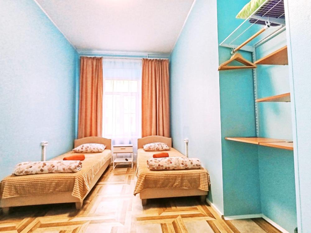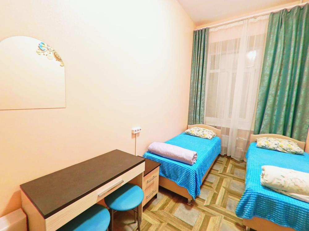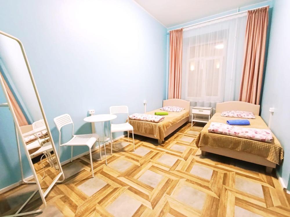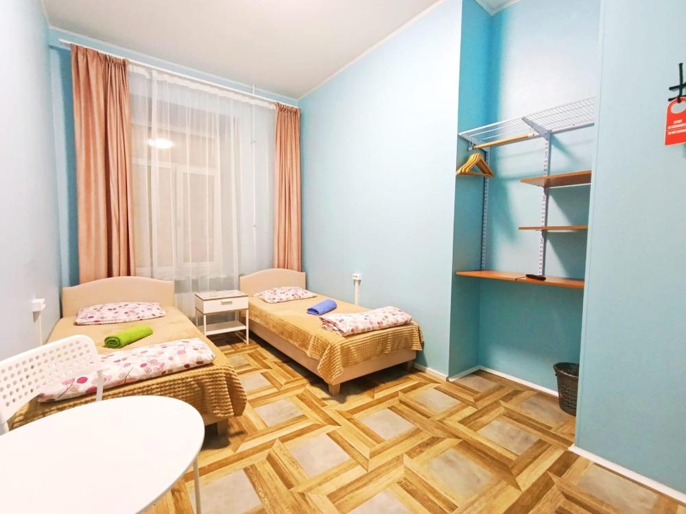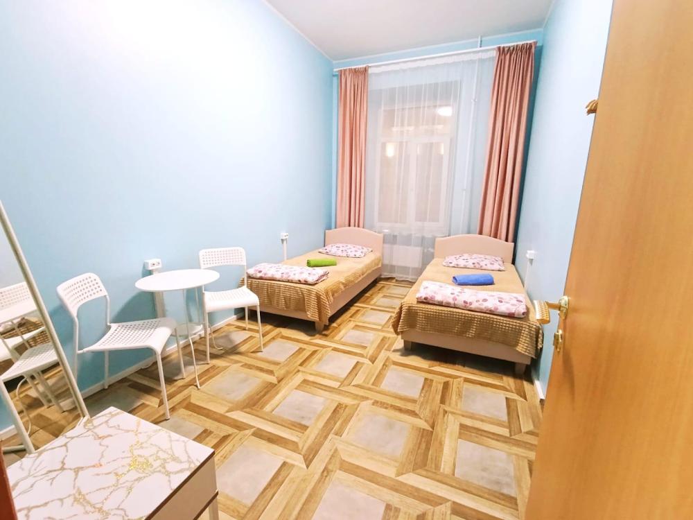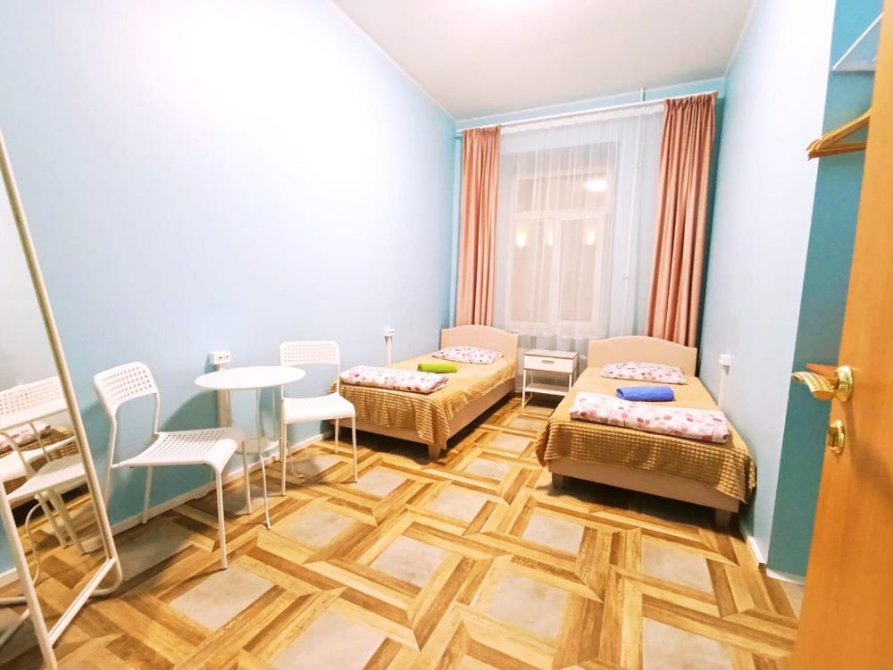 Уютная двухместная комната с двумя раздельными кроватями. В комнате есть шкаф и комод для вещей, зеркало, светильник, стол и табуретки. Для гостей оборудованы общие санузлы и душевые: 3 санузла и 2 душевые на 7 комнат. В большой общей кухне-гостиной есть все необходимое: два холодильника, электрическая панель, микроволновая печь, тостер, термопот, посуда для приготовления и принятия пищи, чай, кофе, какао. Также в общем доступе есть гладильная доска, утюг, стиральная машина, фены.