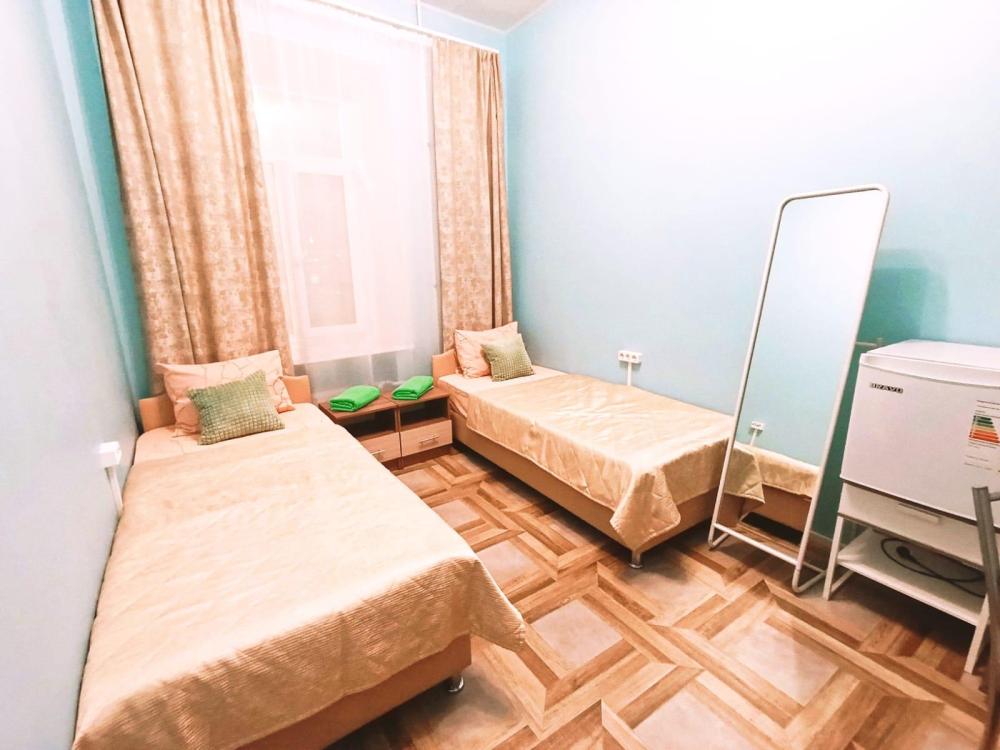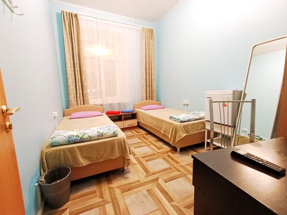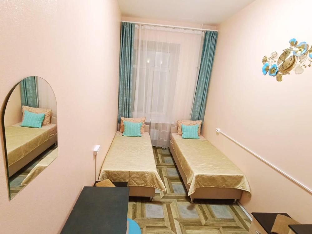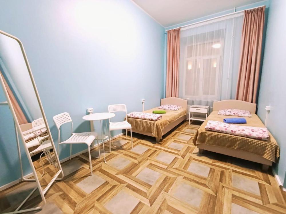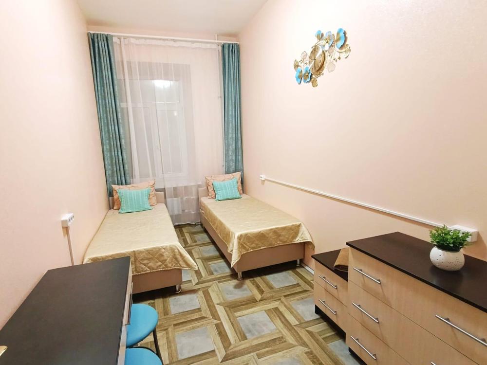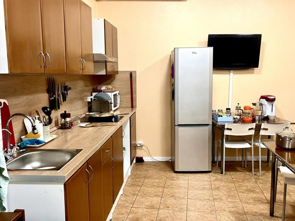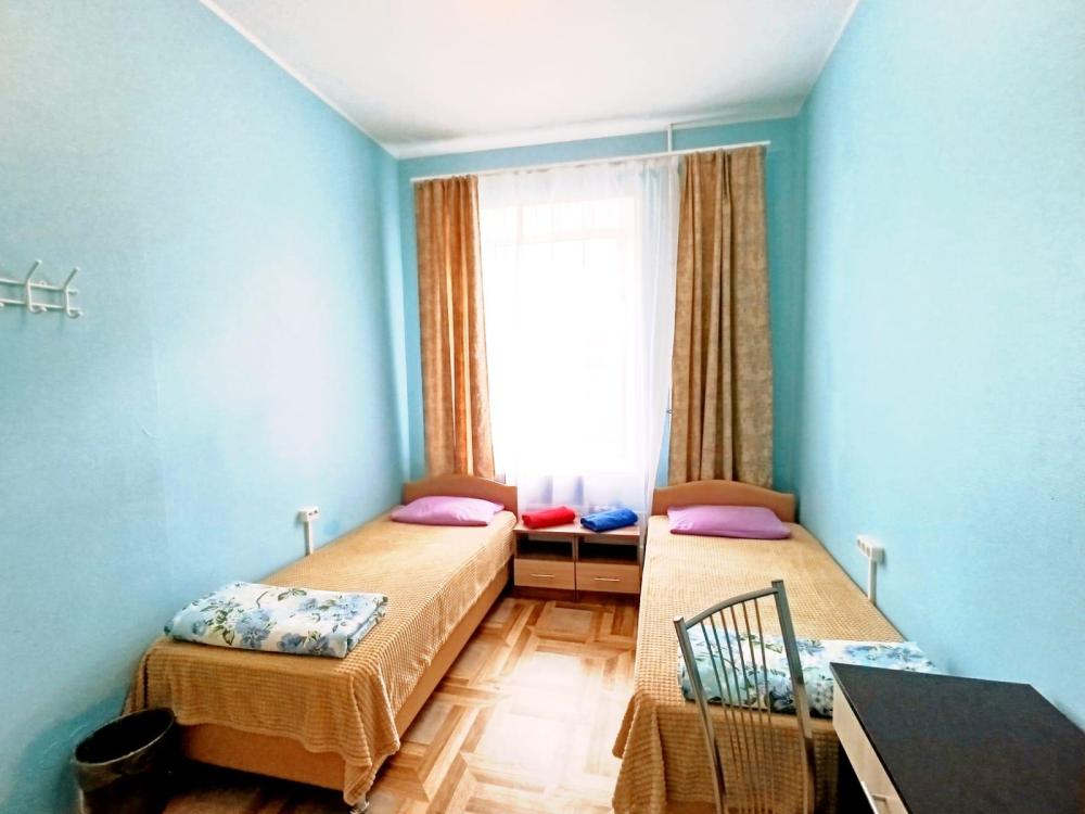 Уютная двухместная комната с двумя раздельными кроватями. В комнате есть шкаф и комод для вещей, зеркало, светильник, стол и табуретки. Для гостей оборудованы общие санузлы и душевые: 3 санузла и 2 душевые на 7 комнат. В большой общей кухне-гостиной есть все необходимое: два холодильника, электрическая панель, микроволновая печь, тостер, термопот, посуда для приготовления и принятия пищи, чай, кофе, какао. Также в общем доступе есть гладильная доска, утюг, стиральная машина, фены.