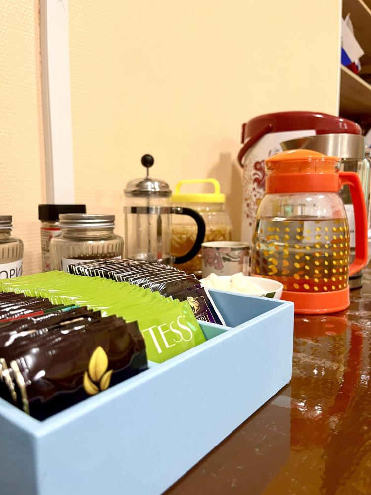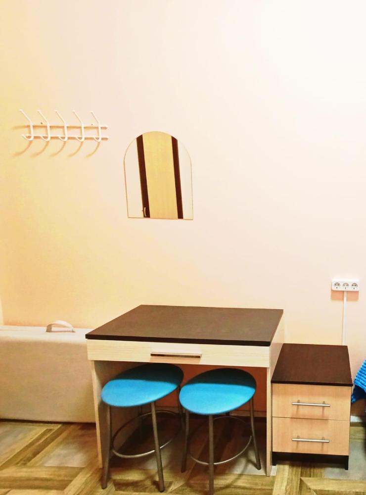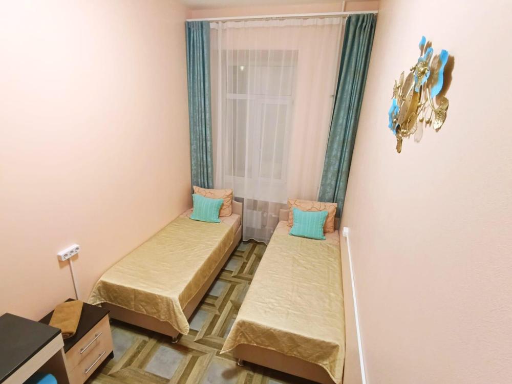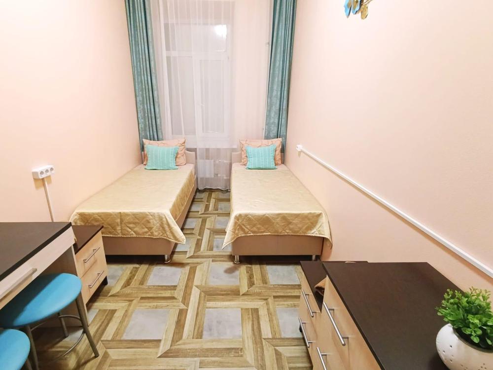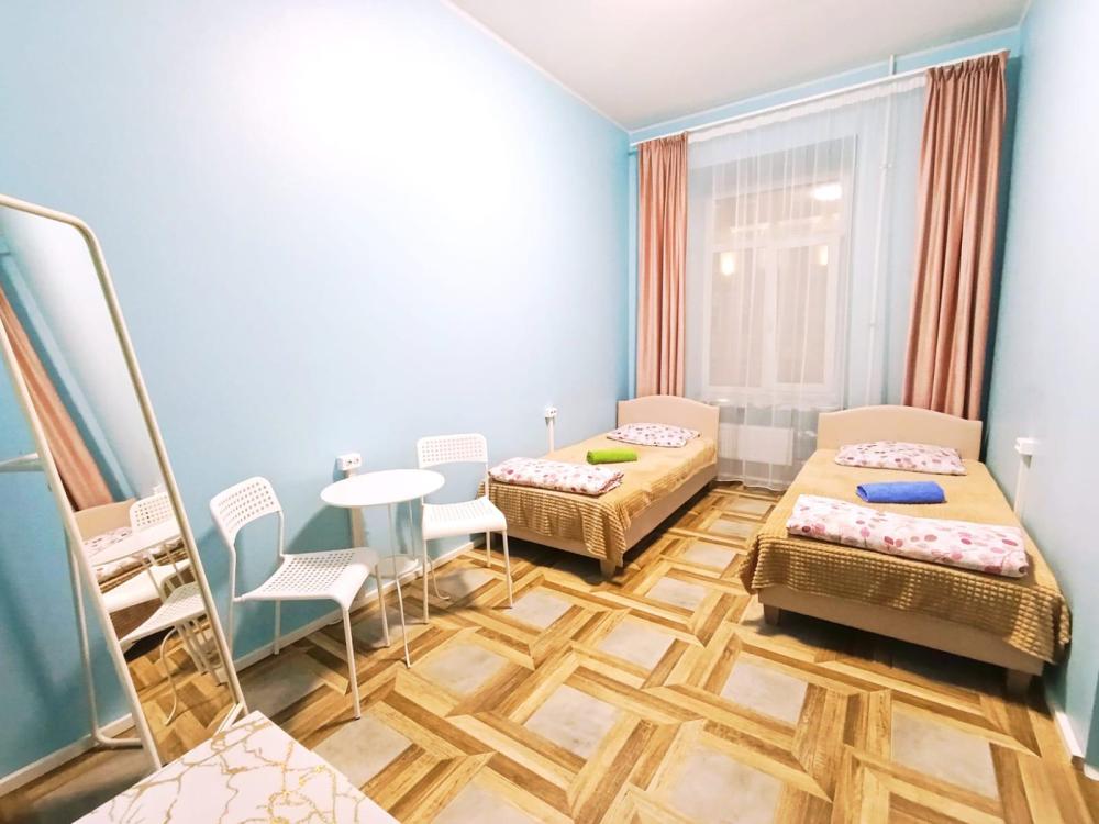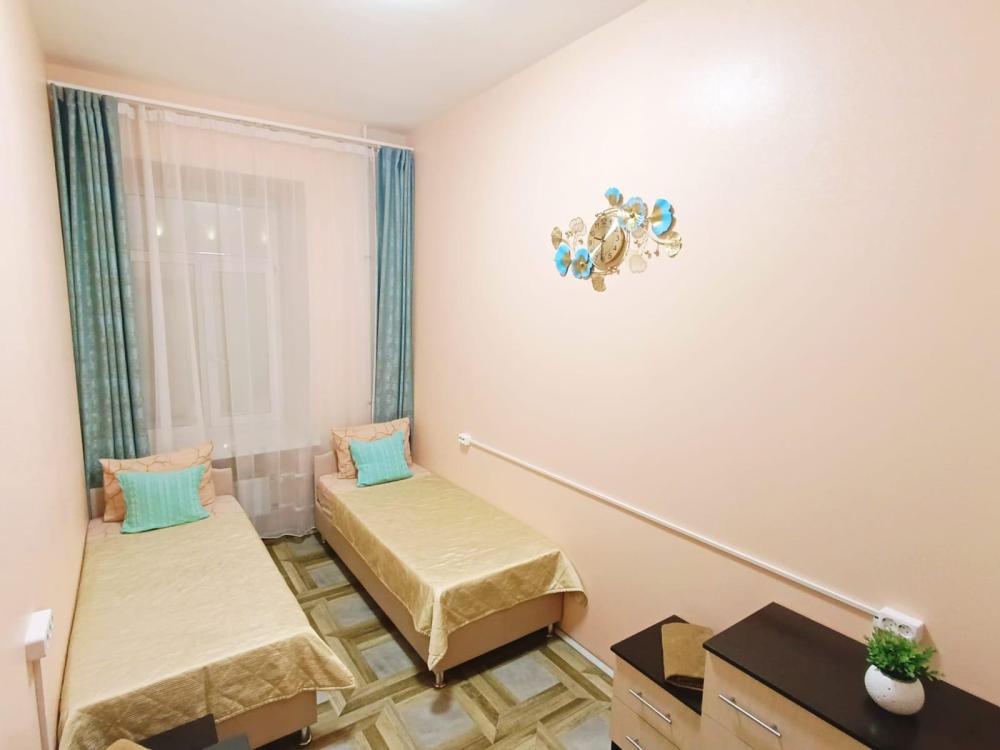 Уютная двухместная комната с двумя раздельными кроватями. В комнате есть шкаф и комод для вещей, зеркало, светильник, стол и табуретки. Для гостей оборудованы общие санузлы и душевые: 3 санузла и 2 душевые на 7 комнат. В большой общей кухне-гостиной есть все необходимое: два холодильника, электрическая панель, микроволновая печь, тостер, термопот, посуда для приготовления и принятия пищи, чай, кофе, какао. Также в общем доступе есть гладильная доска, утюг, стиральная машина, фены.