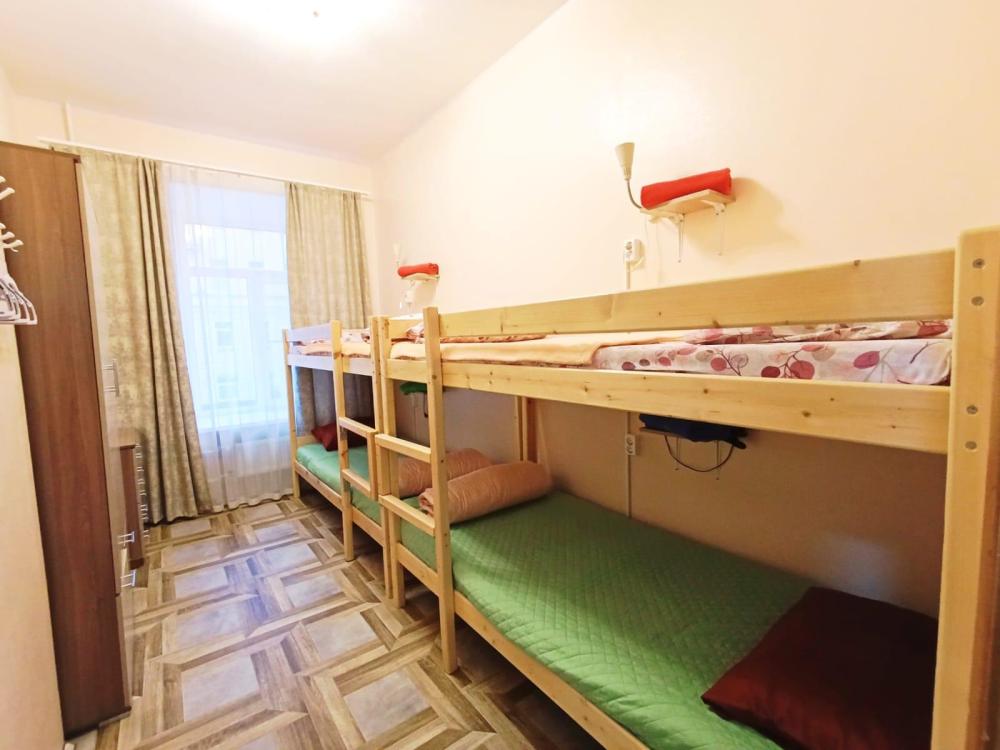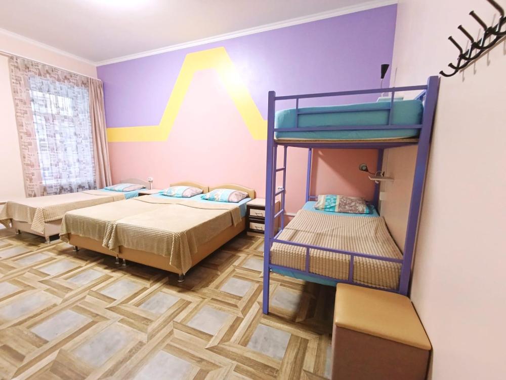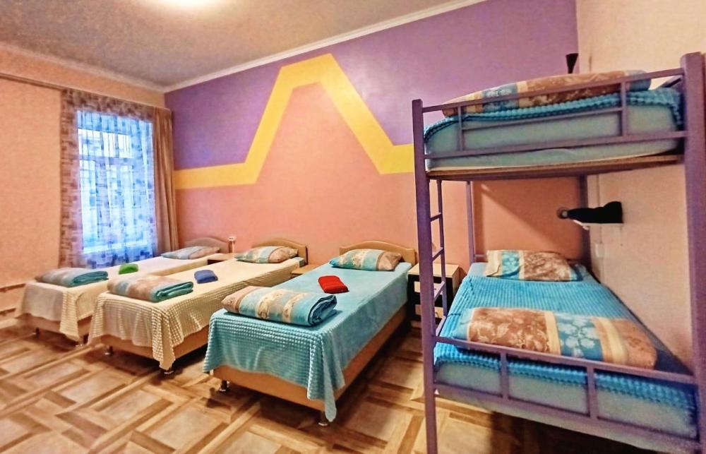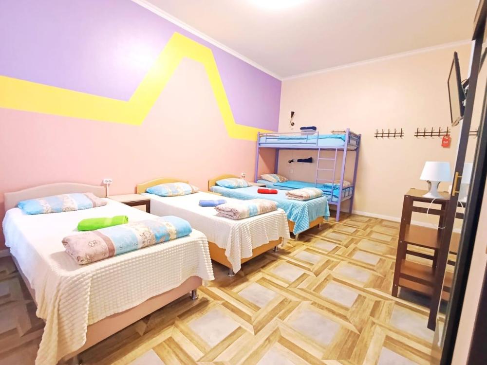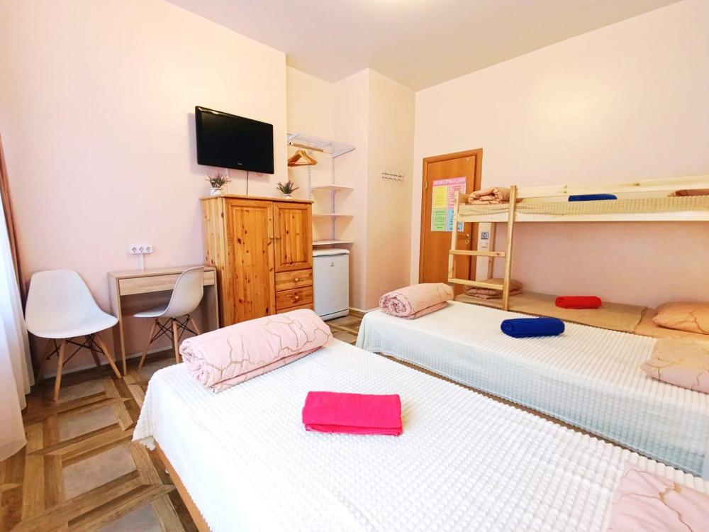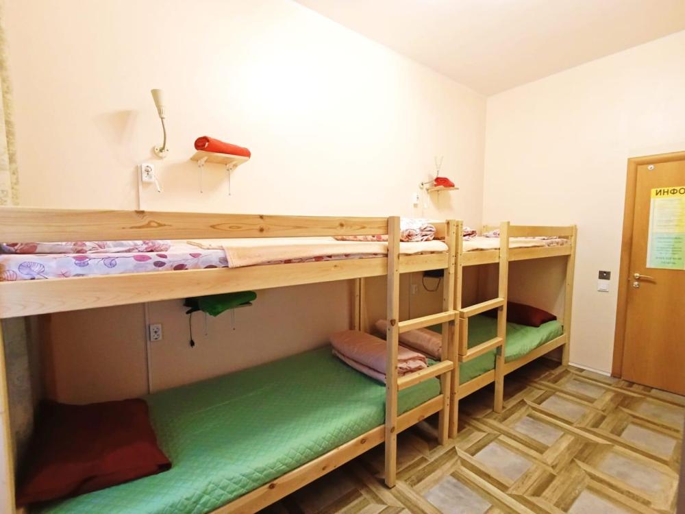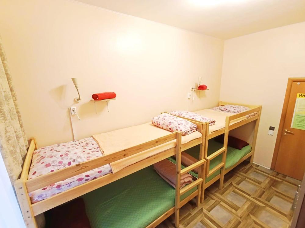 4-х местная стандартная комната, идеально подходящая, как для большой семьи, так и для дружной компании. В комнате есть 2 двухъярусные деревянные кровати 90х200 см, комфортные матрасы, подушки гречишные с ортопедическим эффектом, комод, стеллаж и настенная вешалка для вещей, зеркало, стол и стулья. Для гостей оборудованы общие санузлы и душевые: 3 санузла и 2 душевые на 7 комнат. В большой общей кухне-гостиной есть все необходимое: два холодильника, электрическая панель, микроволновая печь, тостер, термопот, посуда для приготовления и принятия пищи, чай, кофе, какао. Также в общем доступе есть гладильная доска, утюг, стиральная машина, фены.