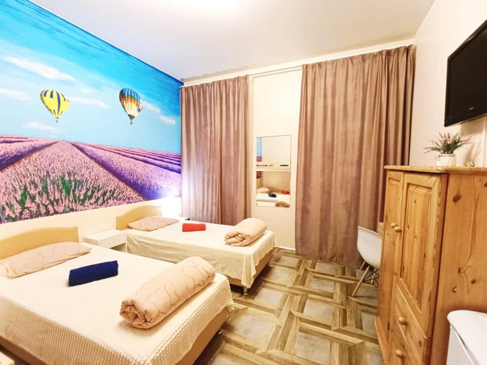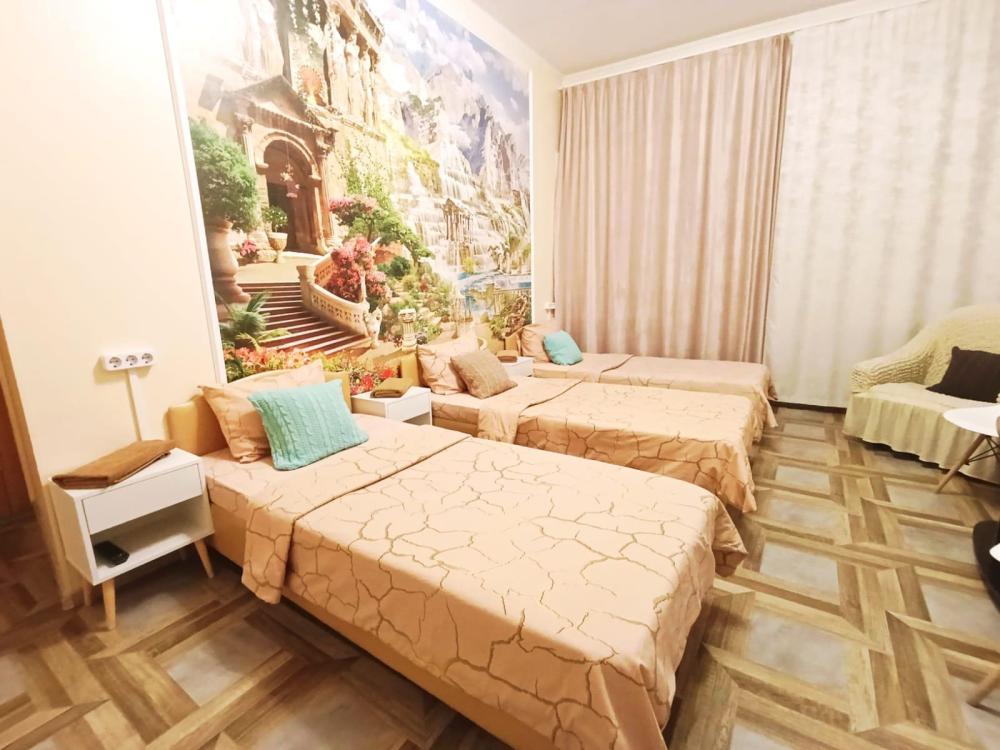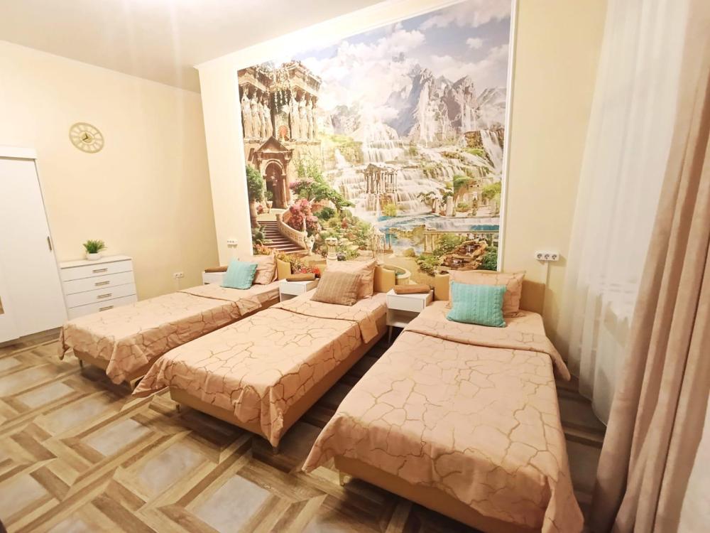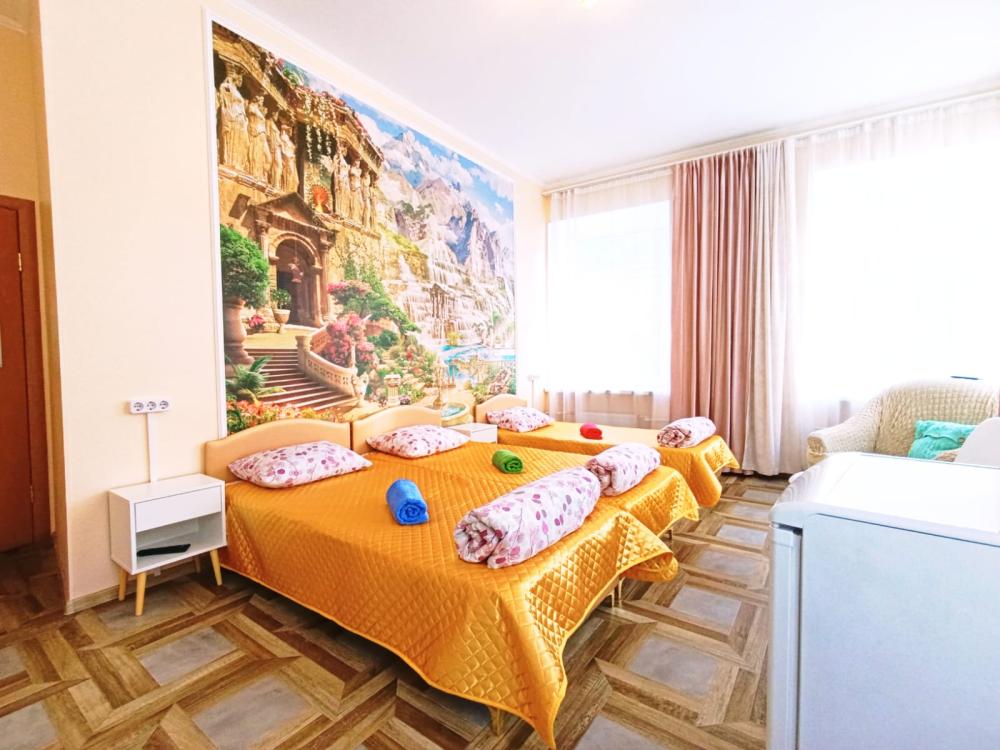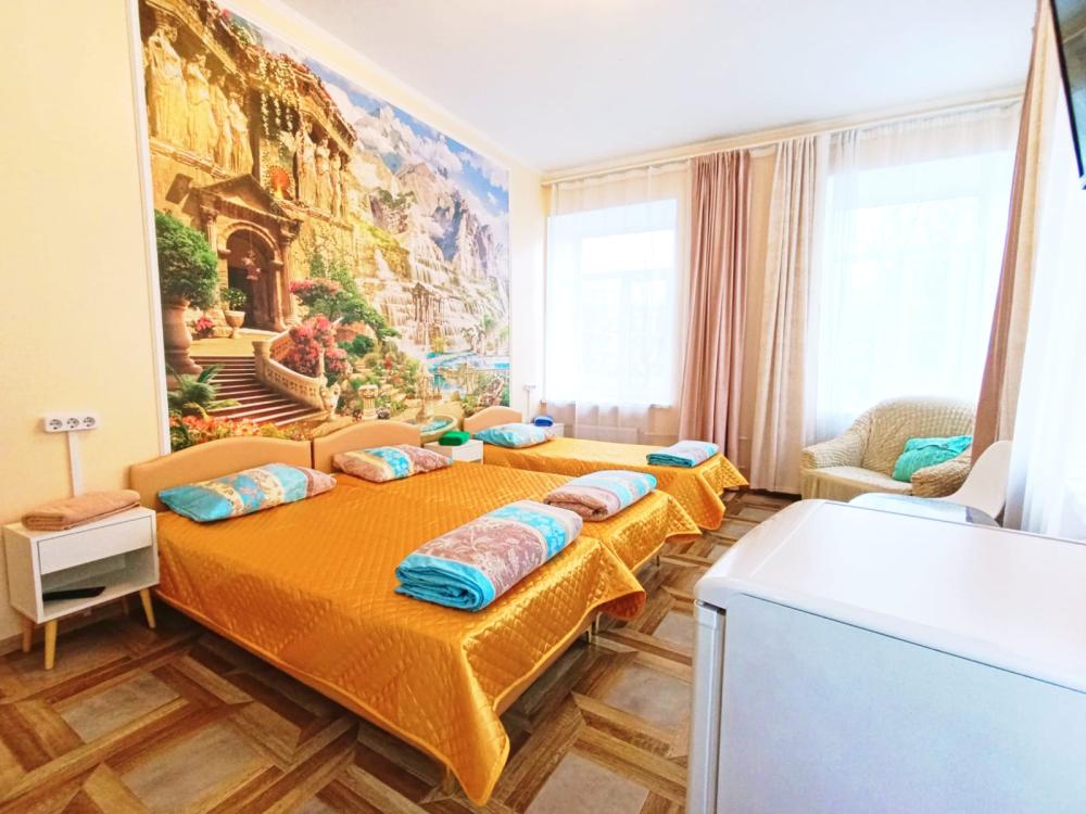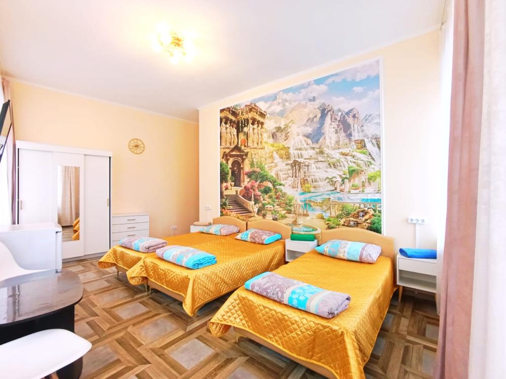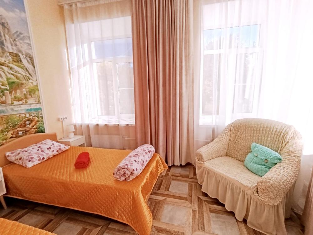 Большая 3- х местная видовая комната с 5 окнами. В комнате: 3 односпальные кровати, телевизор, шкаф-купе, комод для вещей, прикроватные тумбы, светильник, журнальный стол и стулья, телевизор и мини-холодильник. Для гостей оборудованы общие санузлы и душевые: 3 санузла из низ 2 душевые, совместно с туалетом и 1 туалет отдельный на 7 комнат. В большой общей кухне-гостиной есть все необходимое: два холодильника, электрическая панель, микроволновая печь, тостер, термопот, посуда для приготовления и принятия пищи, чай, кофе, какао. Также в общем доступе есть гладильная доска, утюг, стиральная машина, фены.