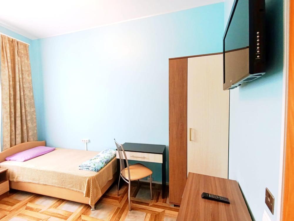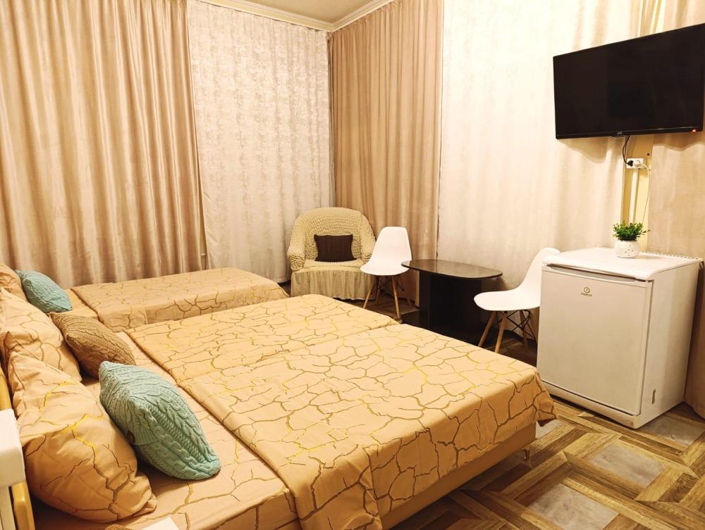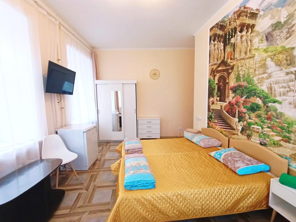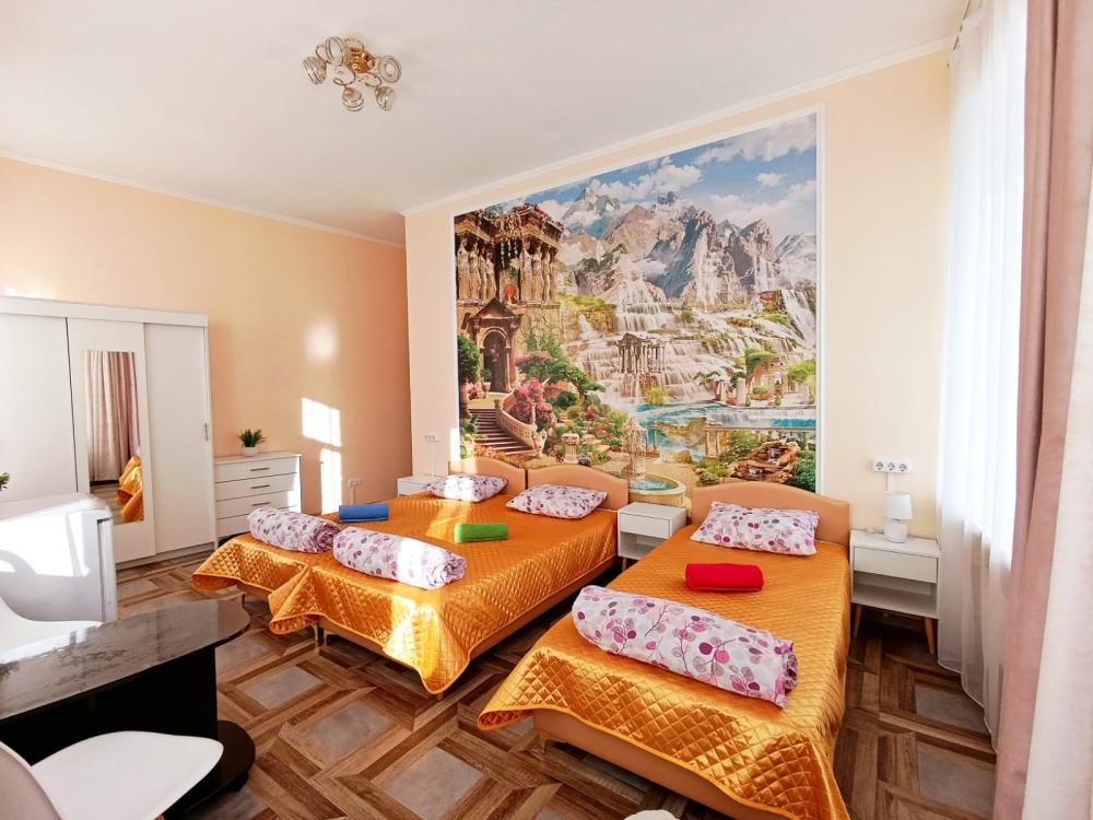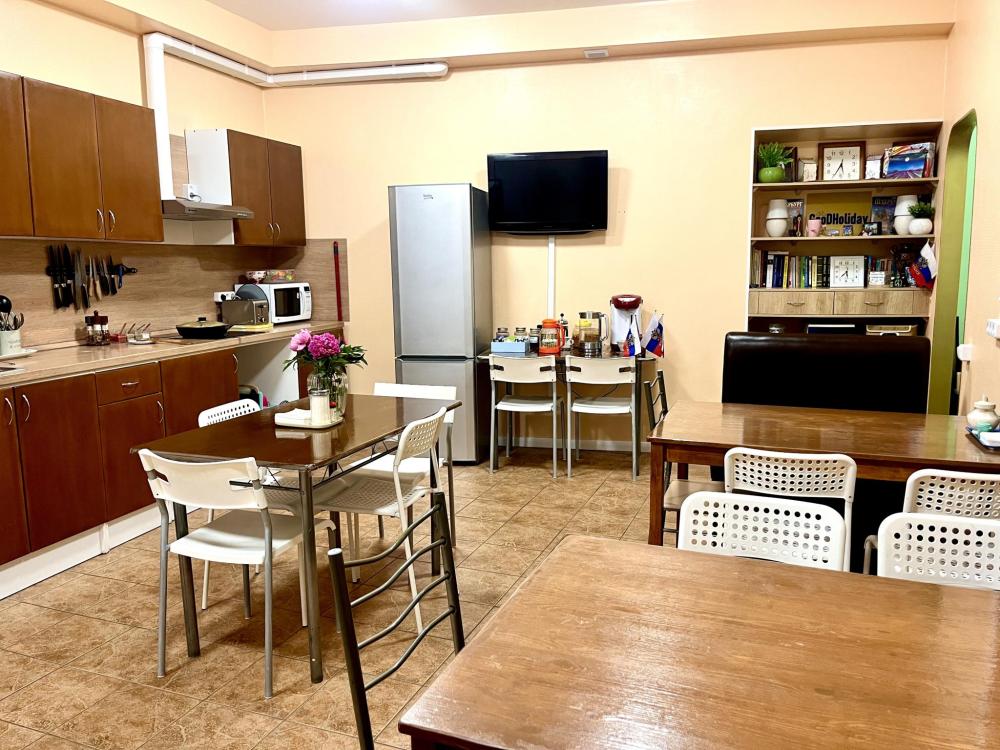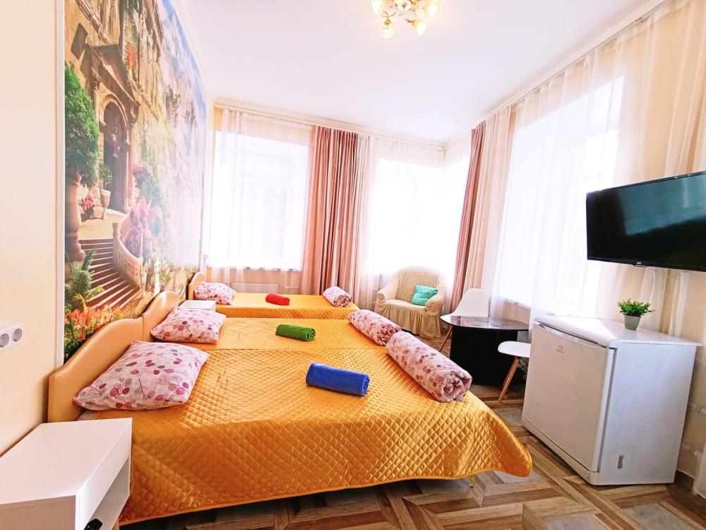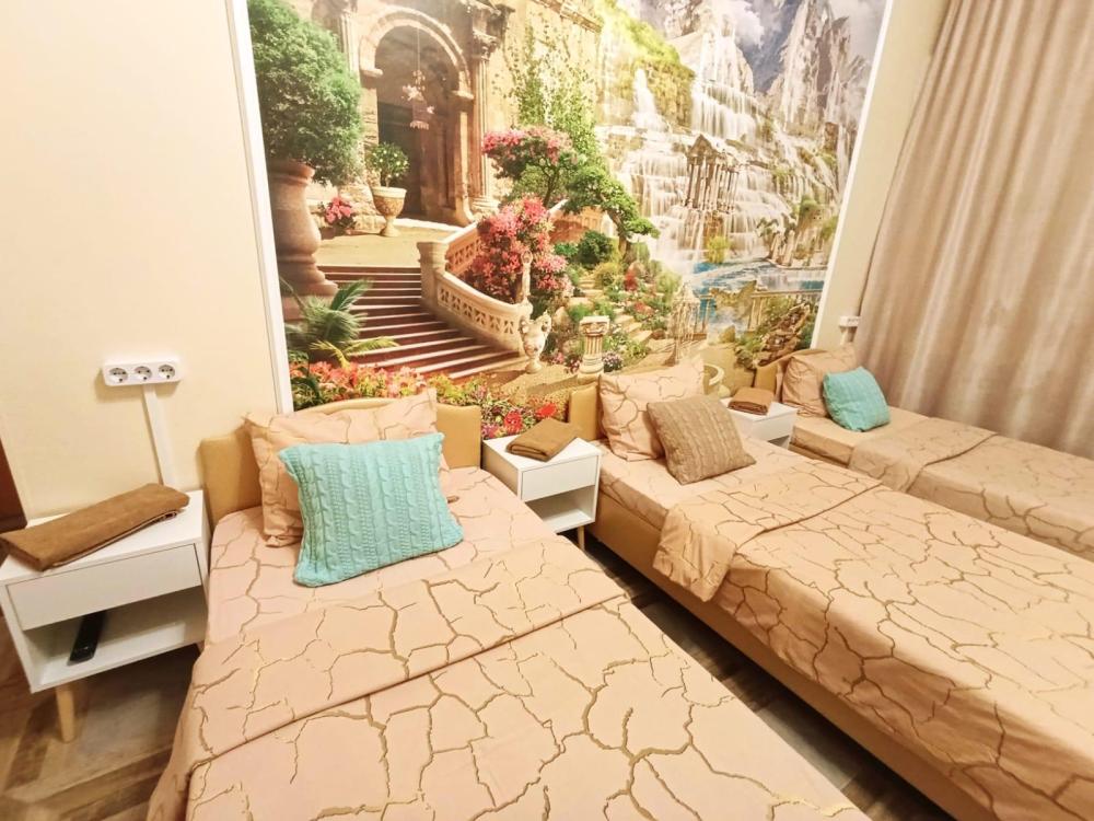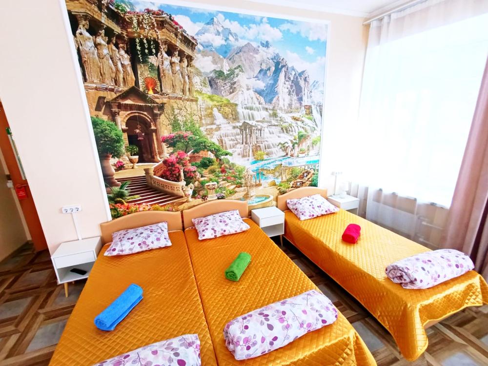 Большая 3- х местная видовая комната с 5 окнами. В комнате: 3 односпальные кровати, телевизор, шкаф-купе, комод для вещей, прикроватные тумбы, светильник, журнальный стол и стулья, телевизор и мини-холодильник. Для гостей оборудованы общие санузлы и душевые: 3 санузла из низ 2 душевые, совместно с туалетом и 1 туалет отдельный на 7 комнат. В большой общей кухне-гостиной есть все необходимое: два холодильника, электрическая панель, микроволновая печь, тостер, термопот, посуда для приготовления и принятия пищи, чай, кофе, какао. Также в общем доступе есть гладильная доска, утюг, стиральная машина, фены.