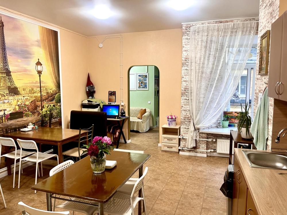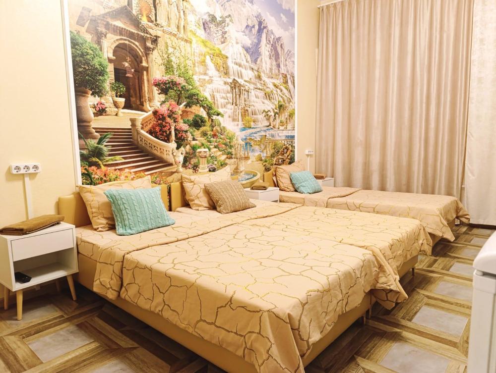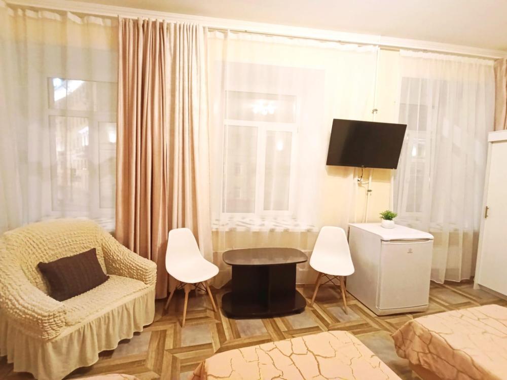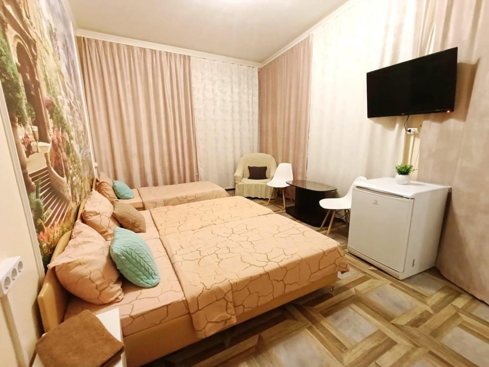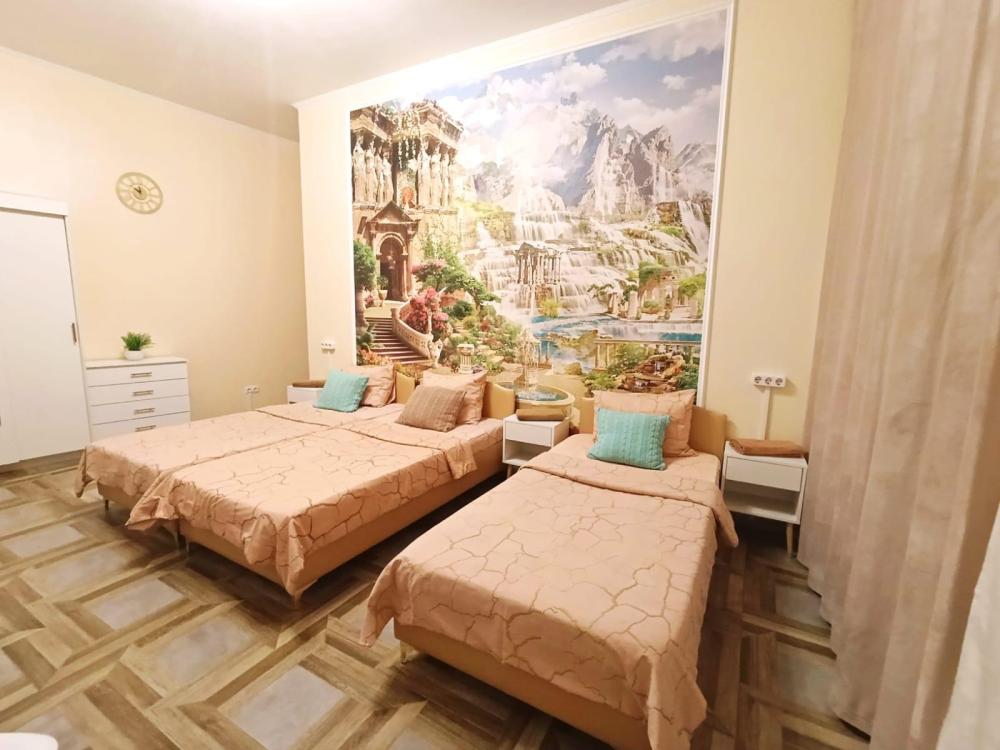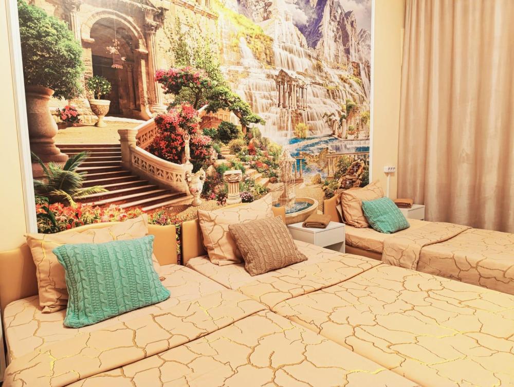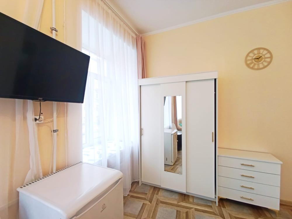 Большая 3- х местная видовая комната с 5 окнами. В комнате: 3 односпальные кровати, телевизор, шкаф-купе, комод для вещей, прикроватные тумбы, светильник, журнальный стол и стулья, телевизор и мини-холодильник. Для гостей оборудованы общие санузлы и душевые: 3 санузла из низ 2 душевые, совместно с туалетом и 1 туалет отдельный на 7 комнат. В большой общей кухне-гостиной есть все необходимое: два холодильника, электрическая панель, микроволновая печь, тостер, термопот, посуда для приготовления и принятия пищи, чай, кофе, какао. Также в общем доступе есть гладильная доска, утюг, стиральная машина, фены.