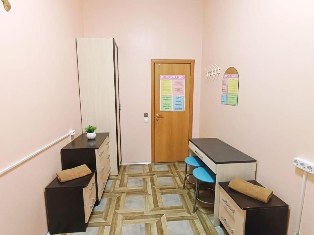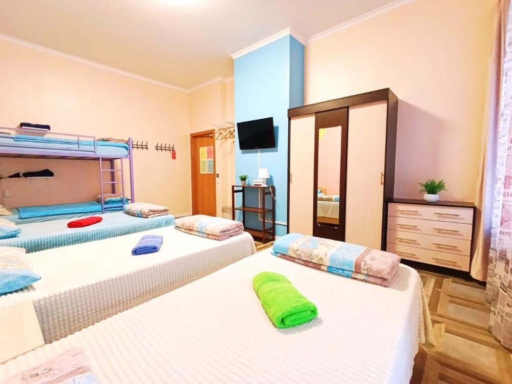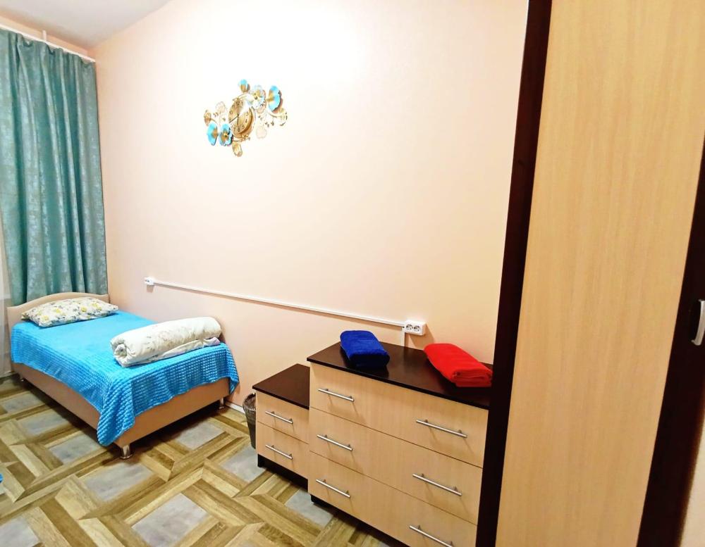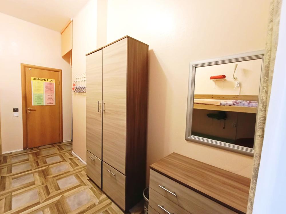 Просторная 5-ти местная комната, которая идельно подходит, как для большой семьи, так и для дружной компании. Наполнение комнаты: шкаф-купе, комод, гардеробная система и настенные вешалки для вещей, тумбочки прикроватные, телевизор, стеллаж. Для гостей оборудованы общие санузлы и душевые: 3 санузла и 2 душевые на 7 комнат. В большой общей кухне-гостиной есть все необходимое: два холодильника, электрическая панель, микроволновая печь, тостер, термопот, посуда для приготовления и принятия пищи, чай, кофе, какао. Также в общем доступе есть гладильная доска, утюг, стиральная машина, фены.