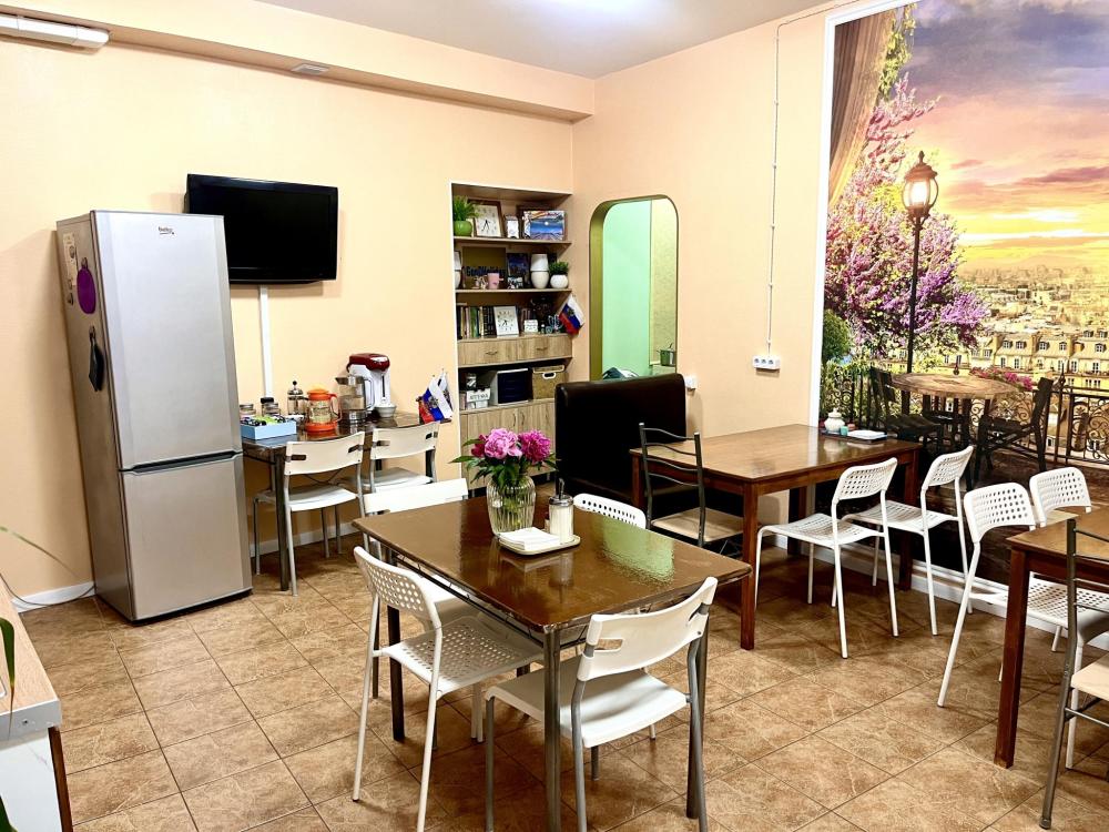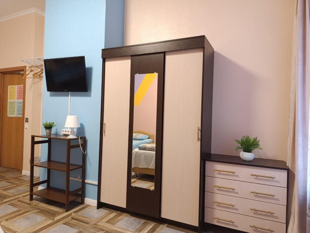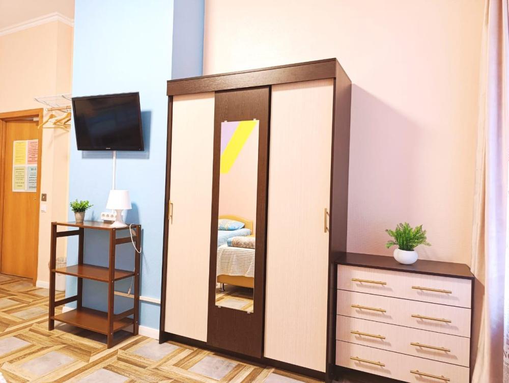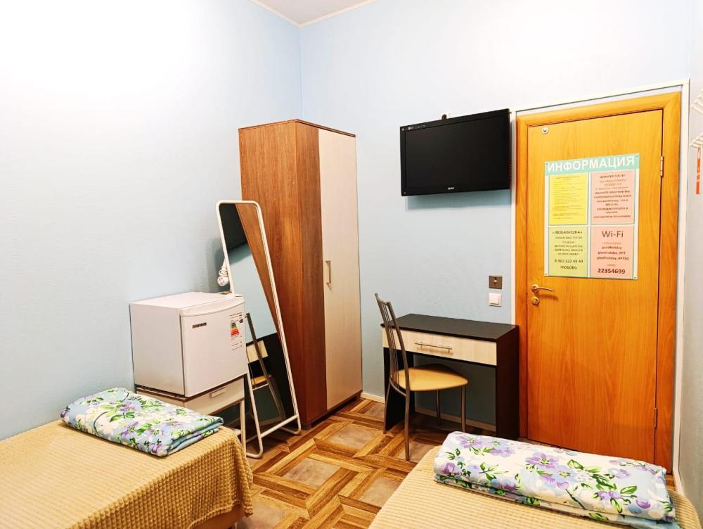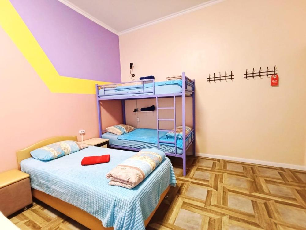 Просторная 5-ти местная комната, которая идельно подходит, как для большой семьи, так и для дружной компании. Наполнение комнаты: шкаф-купе, комод, гардеробная система и настенные вешалки для вещей, тумбочки прикроватные, телевизор, стеллаж. Для гостей оборудованы общие санузлы и душевые: 3 санузла и 2 душевые на 7 комнат. В большой общей кухне-гостиной есть все необходимое: два холодильника, электрическая панель, микроволновая печь, тостер, термопот, посуда для приготовления и принятия пищи, чай, кофе, какао. Также в общем доступе есть гладильная доска, утюг, стиральная машина, фены.