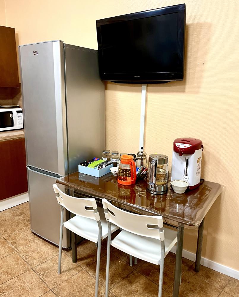 Двухместная комната с двумя раздельными кроватями. В комнате есть шкаф для вещей, зеркало, прикроватные тумбочки, светильник, стол и стул, телевизор. Для гостей оборудованы общие санузлы и душевые: 3 санузла и 2 душевые на 7 комнат. В большой общей кухне-гостиной есть все необходимое: два холодильника, электрическая панель, микроволновая печь, тостер, термопот, посуда для приготовления и принятия пищи, чай, кофе, какао. Также в общем доступе есть гладильная доска, утюг, стиральная машина, фены.