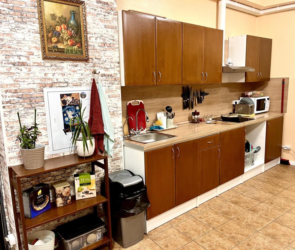 Большая комната с двумя раздельными кроватями и одной двухъярусной кроватью. В комнате есть комод и гардеробная система для вещей, зеркало, прикроватные тумбочки, светильники, стол и стулья, телевизор, мини-холодильник. Для гостей оборудованы 3 общих санузла: 2 душевые, совместно с туалетом и 1 туалет отдельно на 7 комнат. В большой общей кухне-гостиной есть все необходимое: два холодильника, электрическая панель, микроволновая печь, тостер, термопот, посуда для приготовления и принятия пищи, чай, кофе, какао. Также в общем доступе есть гладильная доска, утюг, стиральная машина, фены.