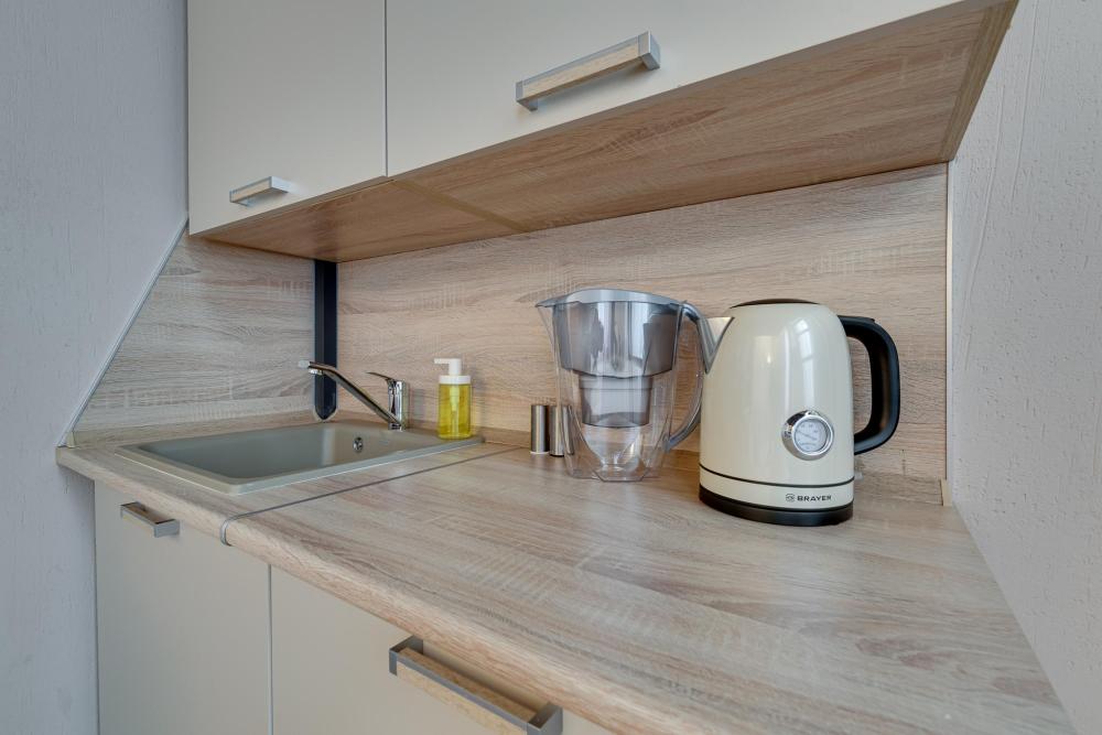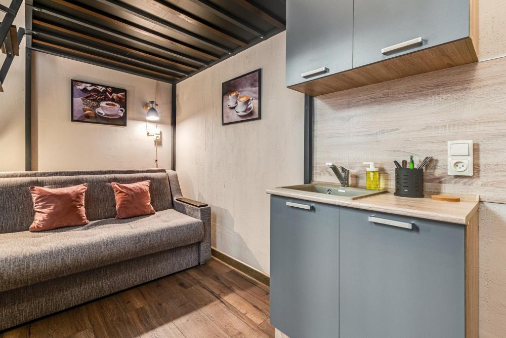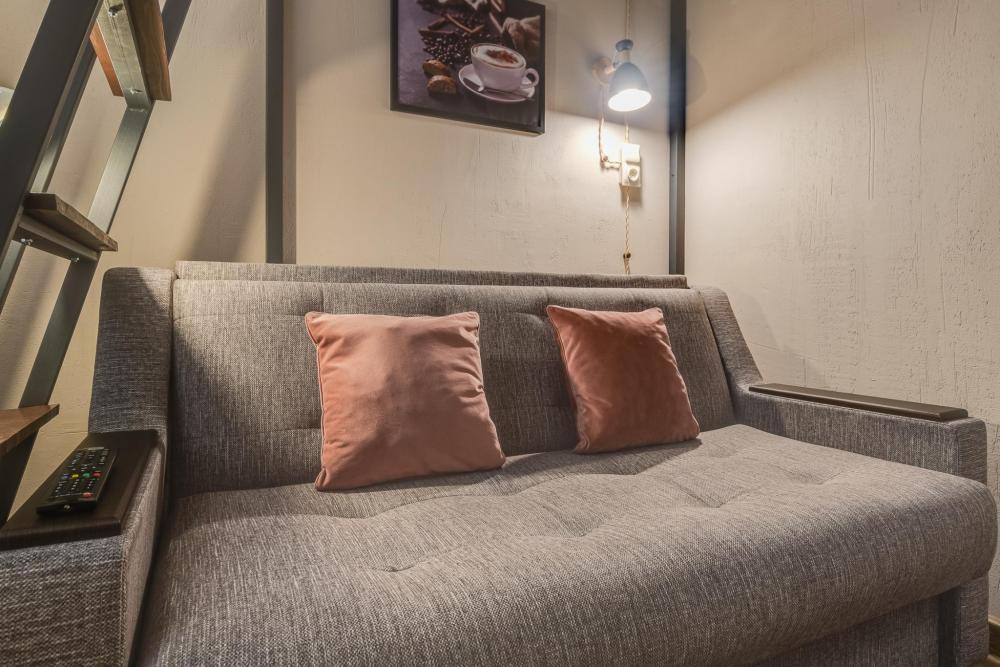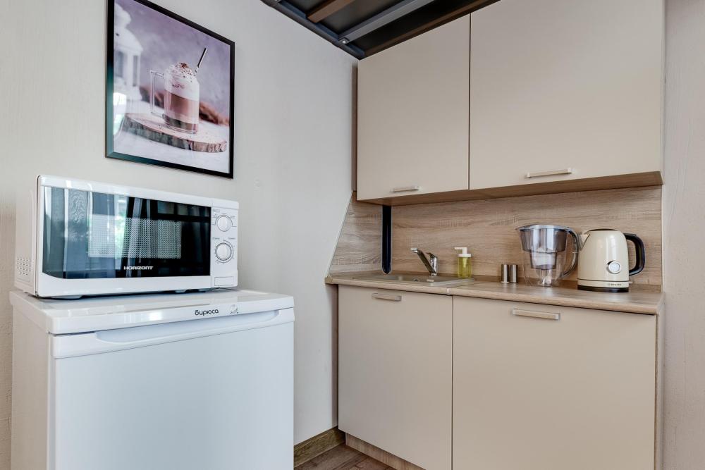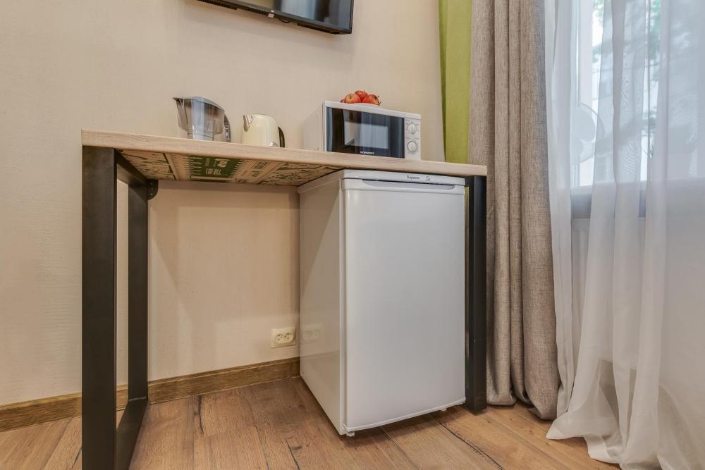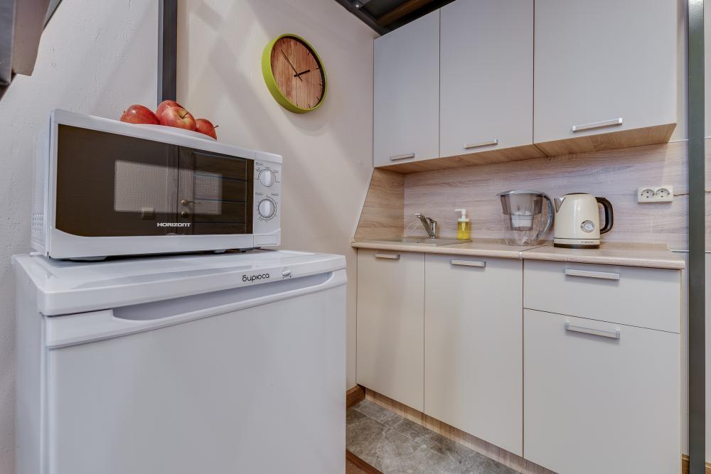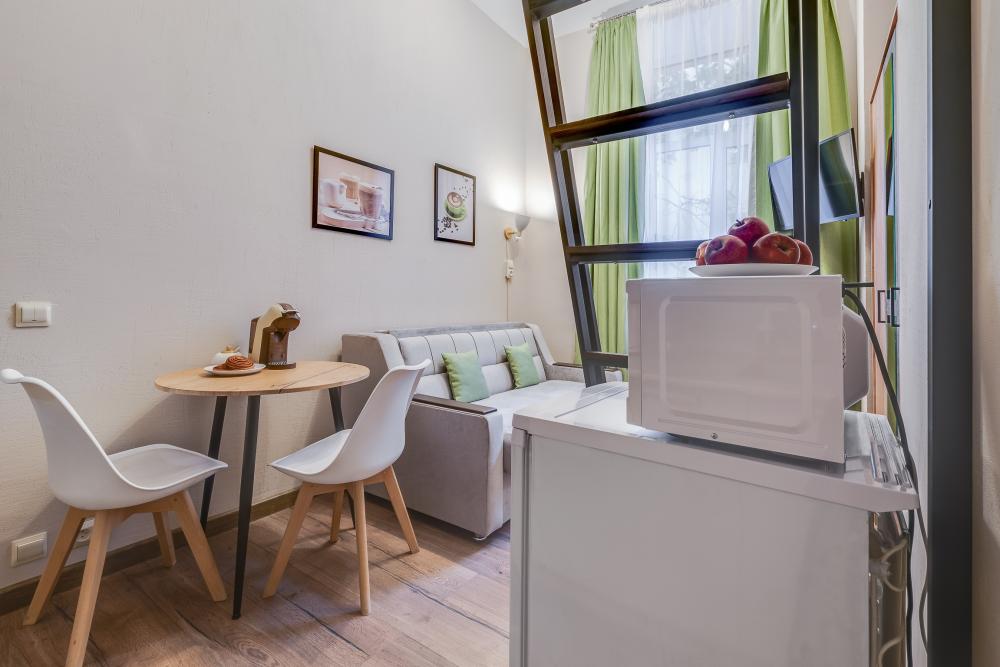 Уютная двухуровневая студия "Капучино" в самом центре Санкт-Петербурга, оснащенная всей необходимой мебелью и техникой для комфортного проживания. Спальное место на втором уровне с ортопедическим матрасом. На первом уровне мини-кухня, гостиная зона с обеденным столом, диваном и телевизором и шкафом для хранения вещей. Мини-кухня оборудована холодильником, чайником, микроволновой печью и необходимой посудой и столовыми приборами. В студии индивидуальный санузел с душем, есть фен, гель для душа, мыло для рук, полотенцесушитель и большое зеркало с дополнительной подсветкой. Окна студий выходят в тихий внутренний дворик. Гостям предоставляется: комплект полотенец по количеству гостей, моющие средства, одноразовые салфетки, чай, кофе, сахар, соль. Так же в студии есть бесплатные средства для чистки одежды и обуви и сушилка для обуви. На всей территории апарта работает бесплатный Wi-Fi . Так же в апартах есть хозяйственная зона, где гости могут воспользоваться стиральной машинкой и гладильной доской с утюгом. Оснащение номера и мебель: Площадь 16 кв.м. Обогреватель Вентилятор Рабочее пространство Утюг Шкаф/Гардероб Москитная сетка Светонепроницаемые шторы Ванная комната: Собственный санузел Тапочки Туалетно-косметические принадлежности Душ Фен Стиральная машина Кухонная зона: Микроволновка Холодильник Столовые приборы Обеденный стол Кофе/Чай Кофемашина/Кофеварка Чайник Электроника и развлечения: Телевизор Кабельное ТВ WiFi Вид: Вид на внутренний двор Услуги: Хранение багажа