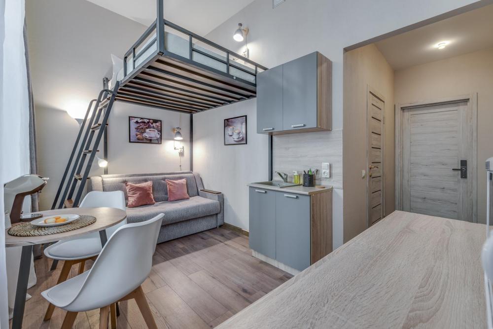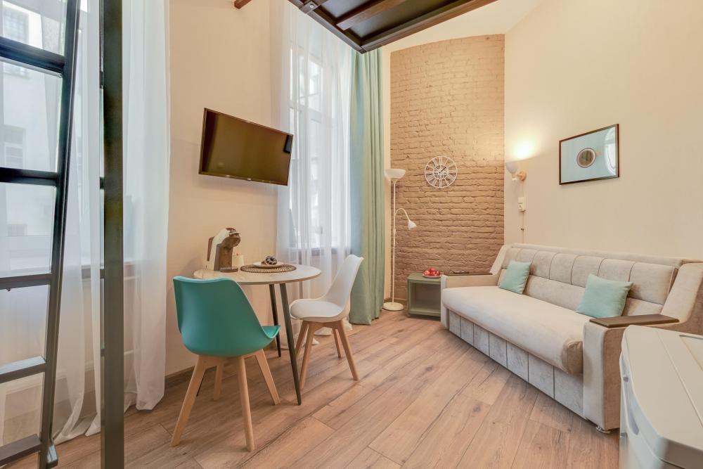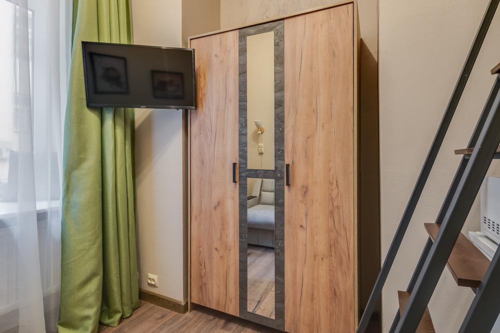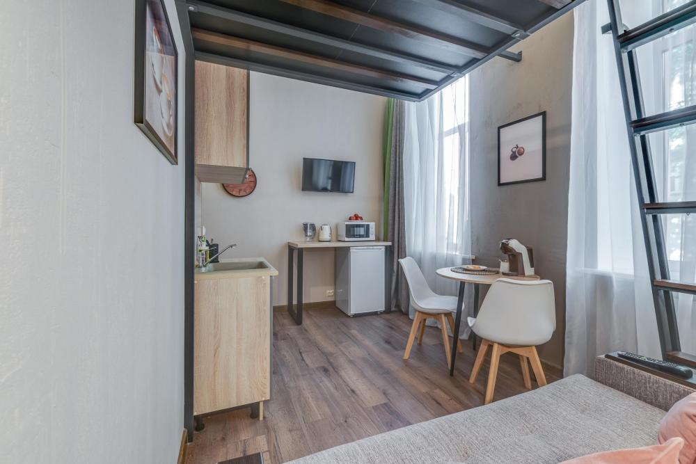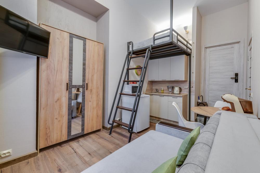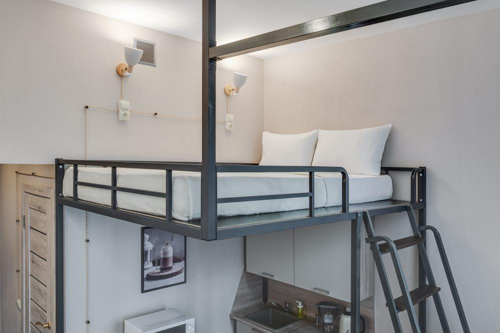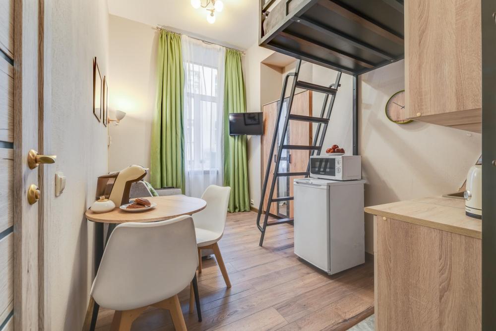 Уютная двухуровневая студия "Латте" в самом центре Санкт-Петербурга, оснащенная всей необходимой мебелью и техникой для комфортного проживания. Спальное место на втором уровне с ортопедическим матрасом. На первом уровне мини-кухня, гостиная зона с обеденным столом, диваном и телевизором и шкафом для хранения вещей. Мини-кухня оборудована холодильником, чайником, микроволновой печью и необходимой посудой и столовыми приборами. В студии индивидуальный санузел с душем, есть фен, гель для душа, мыло для рук, полотенцесушитель и большое зеркало с дополнительной подсветкой. Окна студий выходят в тихий внутренний дворик. Гостям предоставляется: комплект полотенец по количеству гостей, моющие средства, одноразовые салфетки, чай, кофе, сахар, соль. Так же в студии есть бесплатные средства для чистки одежды и обуви и сушилка для обуви. На всей территории апарта работает бесплатный Wi-Fi . Так же в апартах есть хозяйственная комната, где гости могут воспользоваться стиральной машинкой и гладильной доской с утюгом. Оснащение номера и мебель: Площадь 14 кв.м. Обогреватель Вентилятор Рабочее пространство Утюг Шкаф/Гардероб Москитная сетка Светонепроницаемые шторы Ванная комната: Собственный санузел Тапочки Туалетно-косметические принадлежности Душ Фен Стиральная машина Кухня: Микроволновка Холодильник Столовые приборы Обеденный стол Кофе/Чай Кофемашина/Кофеварка Чайник Электроника и развлечения: Телевизор Кабельное ТВ WiFi Вид: Вид на внутренний двор Услуги: Хранение багажа