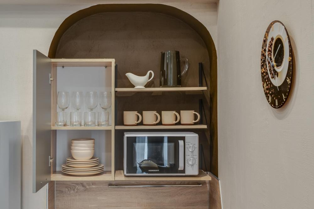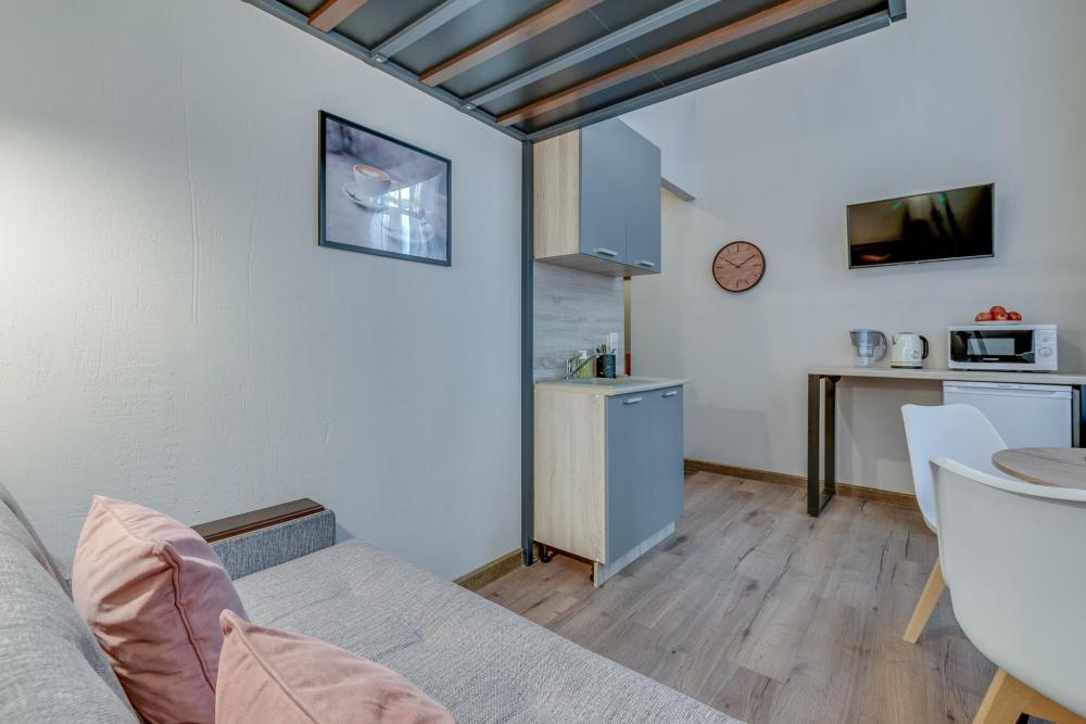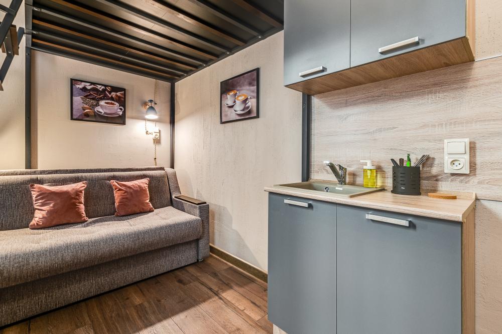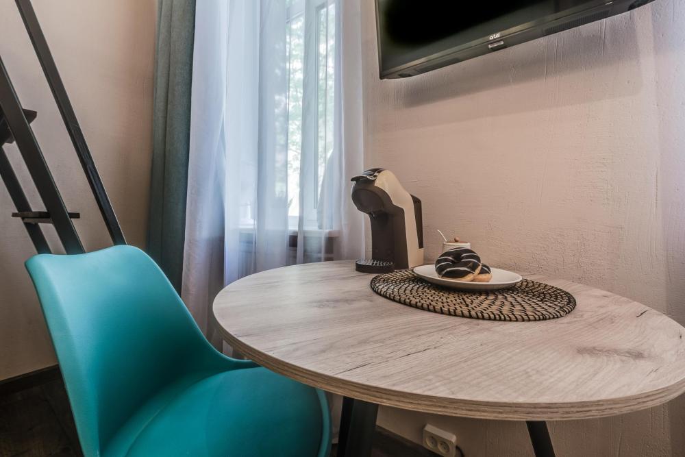 Уютная двухуровневая студия "Мокка" в самом центре Санкт-Петербурга, оснащенная всей необходимой мебелью и техникой для комфортного проживания. Спальное место на втором уровне с ортопедическим матрасом. На первом уровне мини-кухня, гостиная зона с обеденным столом, диваном и телевизором и шкафом для хранения вещей. Мини-кухня оборудована холодильником, чайником, микроволновой печью и необходимой посудой и столовыми приборами. В студии индивидуальный санузел с душем, есть фен, гель для душа, мыло для рук, полотенцесушитель и большое зеркало с дополнительной подсветкой. Окна студий выходят в тихий внутренний дворик. Гостям предоставляется: комплект полотенец по количеству гостей, моющие средства, одноразовые салфетки, чай, кофе, сахар, соль. Так же в студии есть бесплатные средства для чистки одежды и обуви и сушилка для обуви. На всей территории апарта работает бесплатный Wi-Fi . Так же в апартах есть хозяйственная зона, где гости могут воспользоваться стиральной машинкой и гладильной доской с утюгом. Оснащение номера и мебель: Площадь 17 кв.м. Обогреватель Вентилятор Рабочее пространство Утюг Шкаф/Гардероб Москитная сетка Светонепроницаемые шторы Ванная комната: Собственный санузел Тапочки Туалетно-косметические принадлежности Душ Фен Стиральная машина Кухонная зона: Микроволновка Холодильник Столовые приборы Обеденный стол Кофе/Чай Кофемашина/Кофеварка Чайник Электроника и развлечения: Телевизор Кабельное ТВ WiFi Вид: Вид на внутренний двор Услуги: Хранение багажа