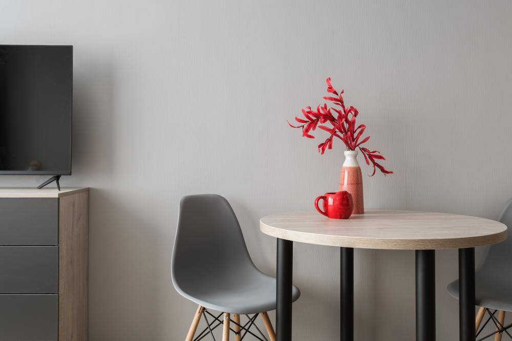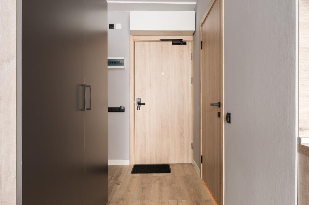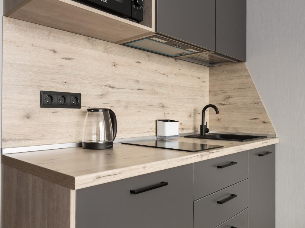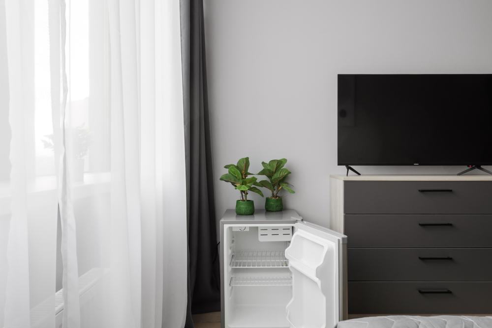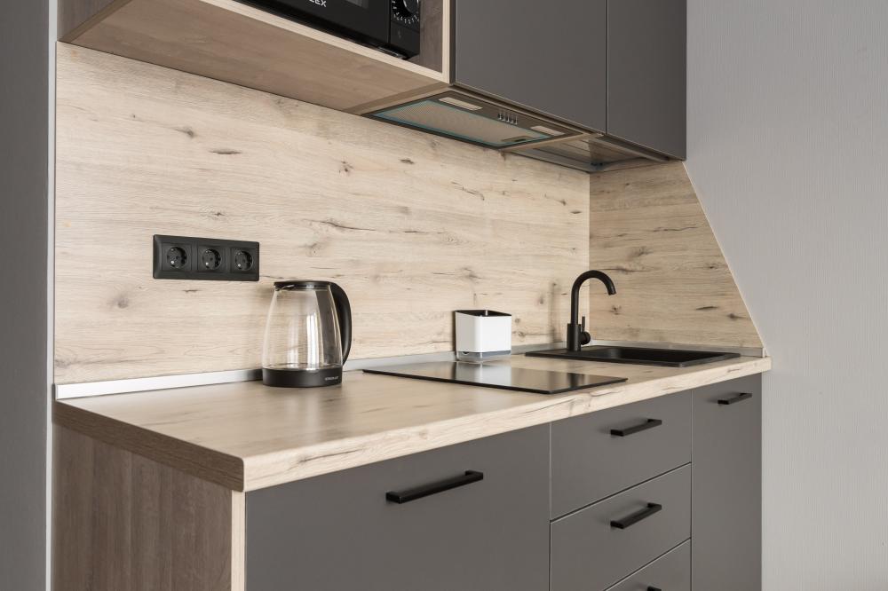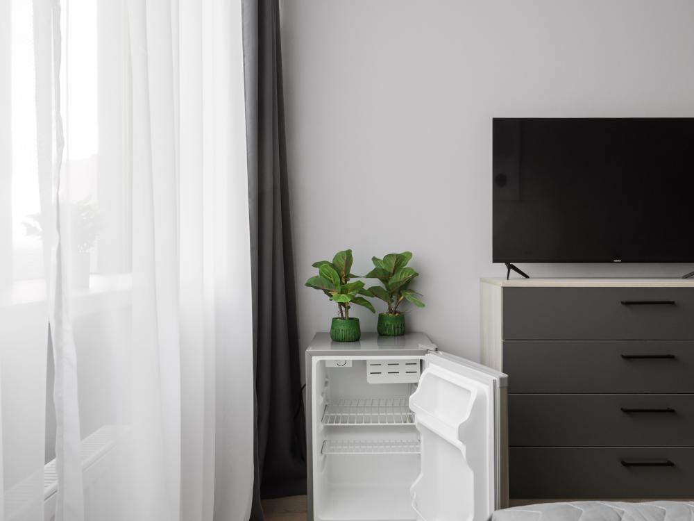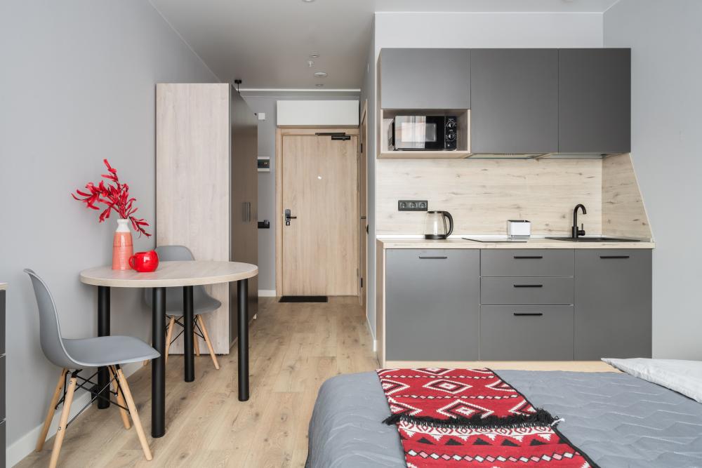 Общее оснащение номера: -Кухня с варочной поверхностью и вытяжкой, СВЧ- печь, холодильник, чайник, набор посуды на 2 персоны. -Кровать 160х200 см, высококачественный ортопедический матрас, постельное белье, полотенца. -Смарт ТВ, система хранения, обеденая зона для отдыха на 2 человека. -Также имеются: стиральная машина, фен, утюг, гладильная доска. Особенности и преимущества проживания: -полностью укомплектованные для проживания, комфортабельные апартаменты; - wi-fi на всей территории