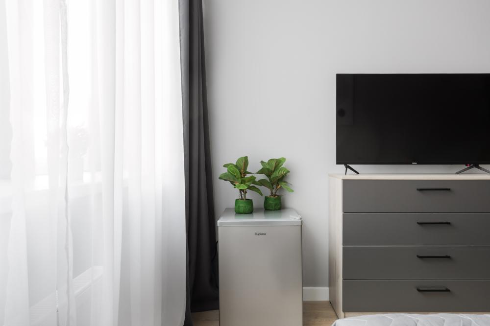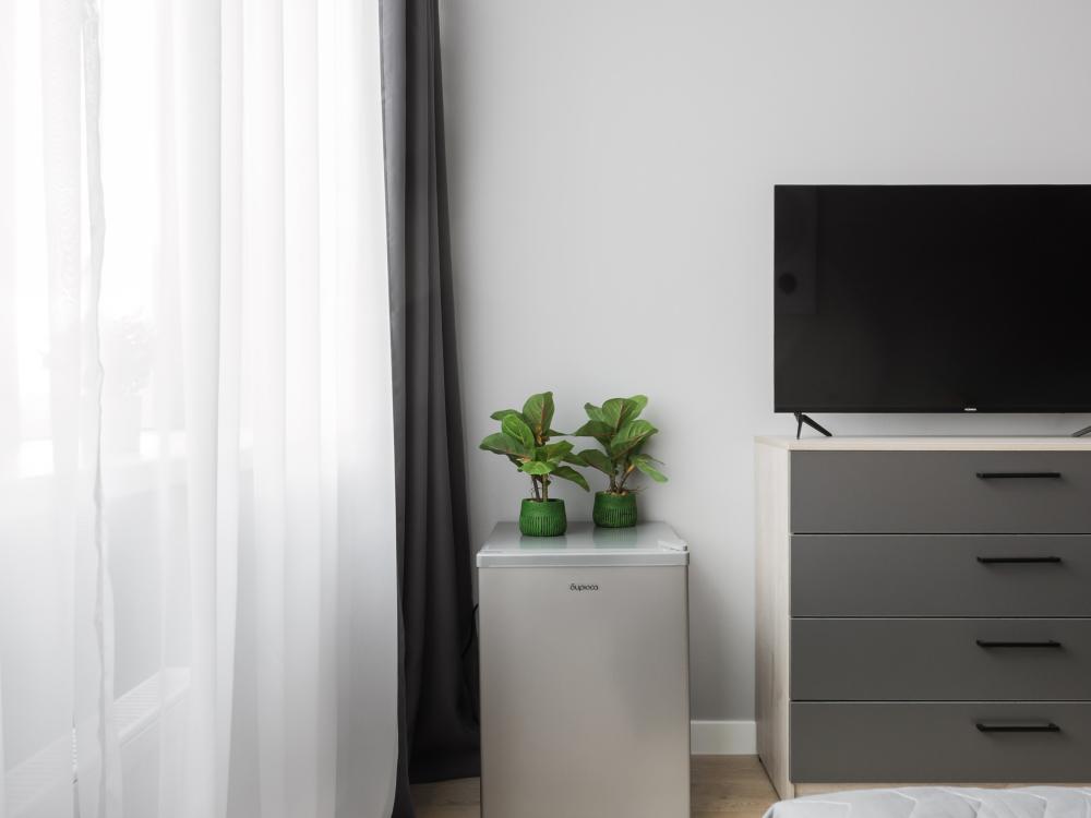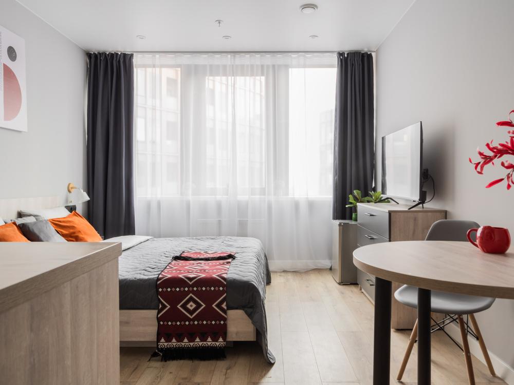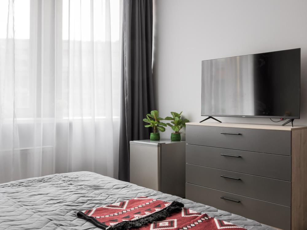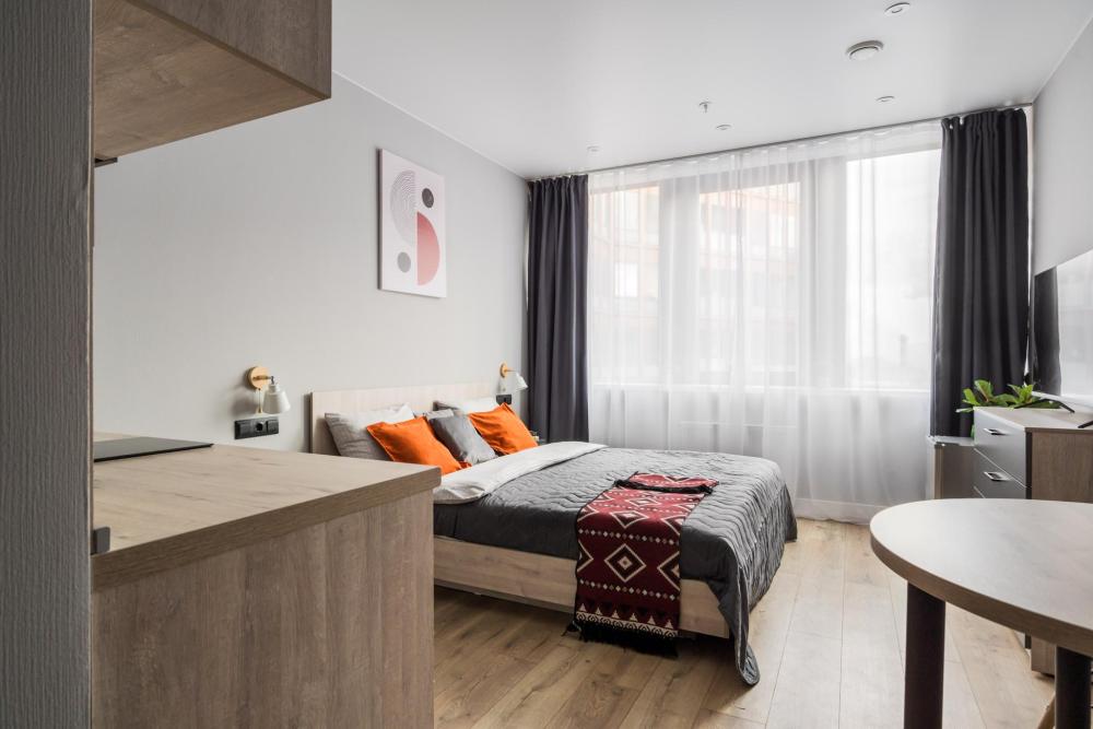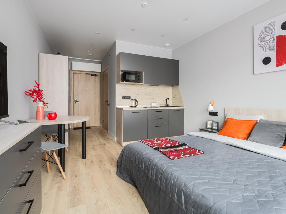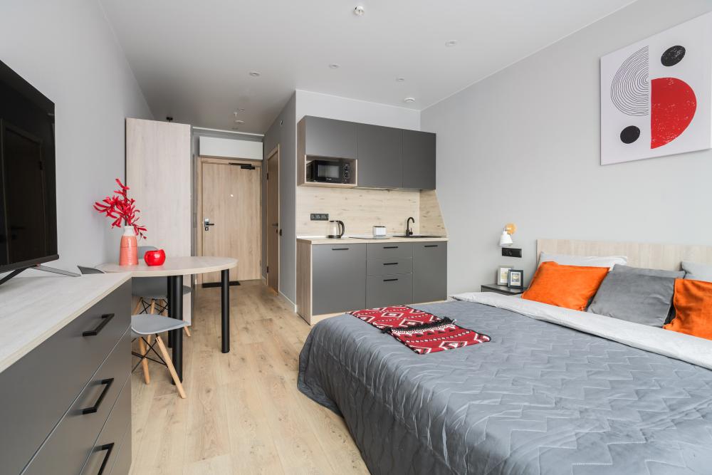 Размещение для 2 гостей. В апартаментах: двуспальная кровать с ортопедическим матрасом. Современный ЖК-телевизор для просмотра любимых программ и фильмов. Система для хранения вещей; Полностью оборудованный кухонный гарнитур с плитой, электрическим чайником, микроволновкой и всей необходимой посудой для приготовления. Обеденный стол и стулья; Собственный санузел, где есть душ и туалет. Утюг, зеркало, стиральная машинка и фен. Постельное белье и полотенца предоставляются.