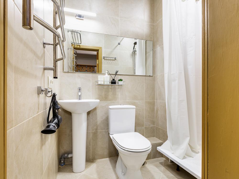 ?Уютный собственный санузел с душем и туалетом. Утюг и фен для вашего удобства, а также стиральная машинка для свежести ваших вещей.