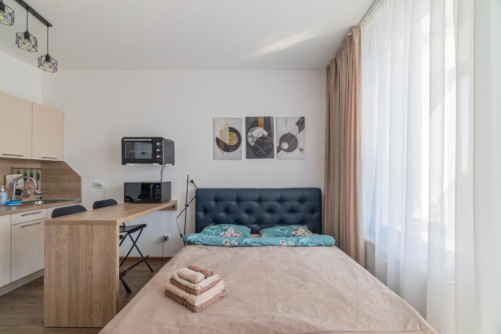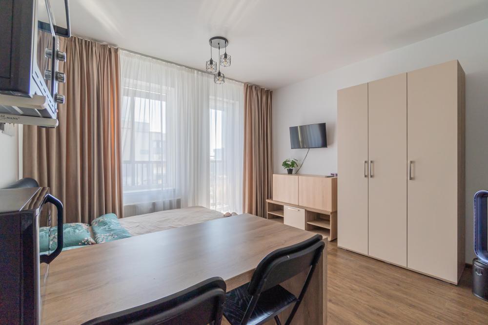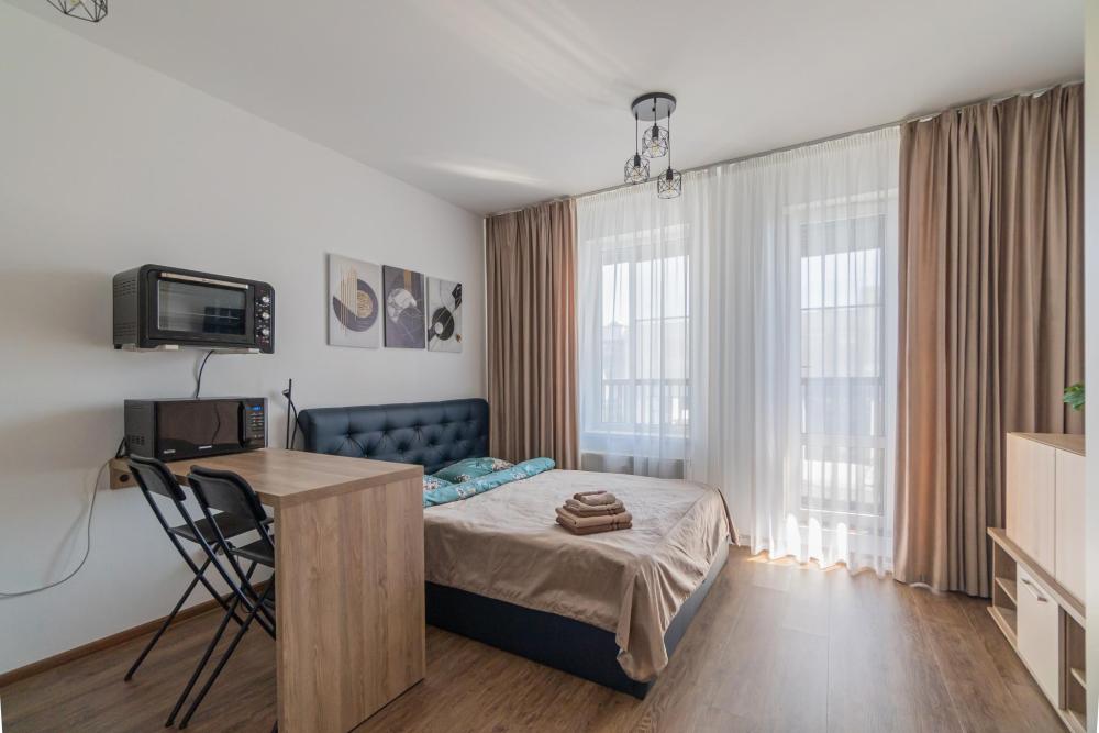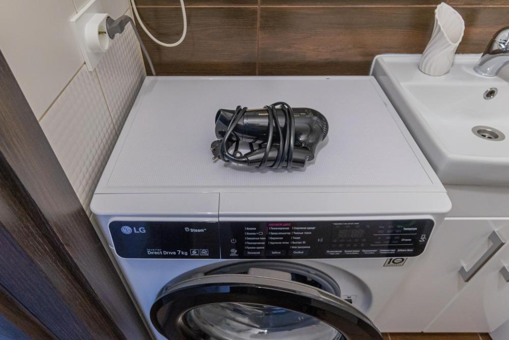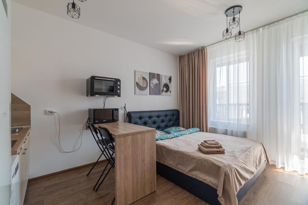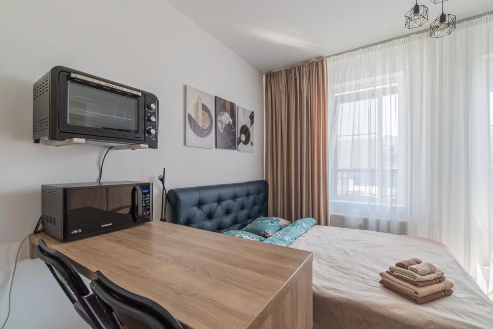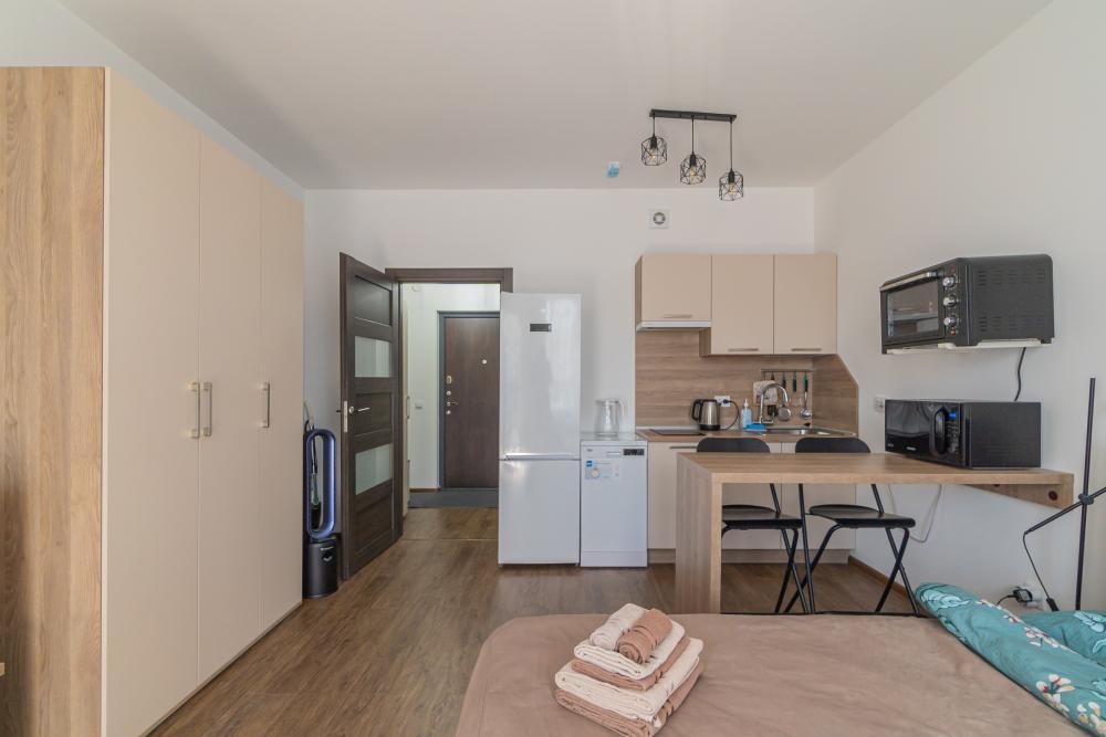 Оснащение : - телевизор с Смарт ТВ, Алисой и выходом в интернет -фен -гладильные принадлежности (гладильная доска и утюг) -скоростной вайфай -постельное белье и полотенца -спальная зона (двуспальная кровать, раскладное кресло с увеличенным спальным пространством) - обеденная зона (холодильник, чайник, микроволновка, варочная панель, столовая группа, посуда на 2 персоны, барная стойка со стульями) - Сан.узел (душевая кабина, туалет, стиральная машинка, сушилка, фен)