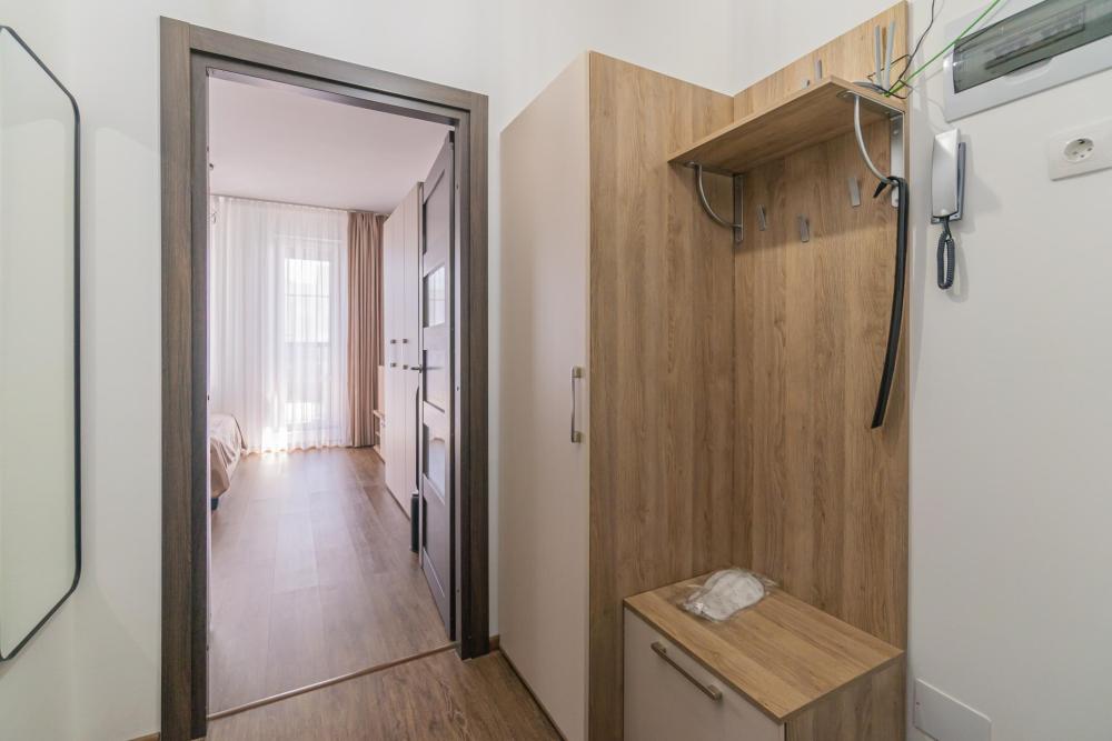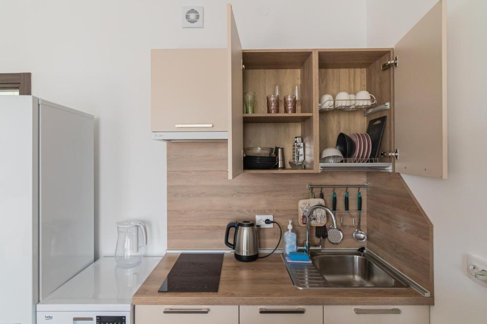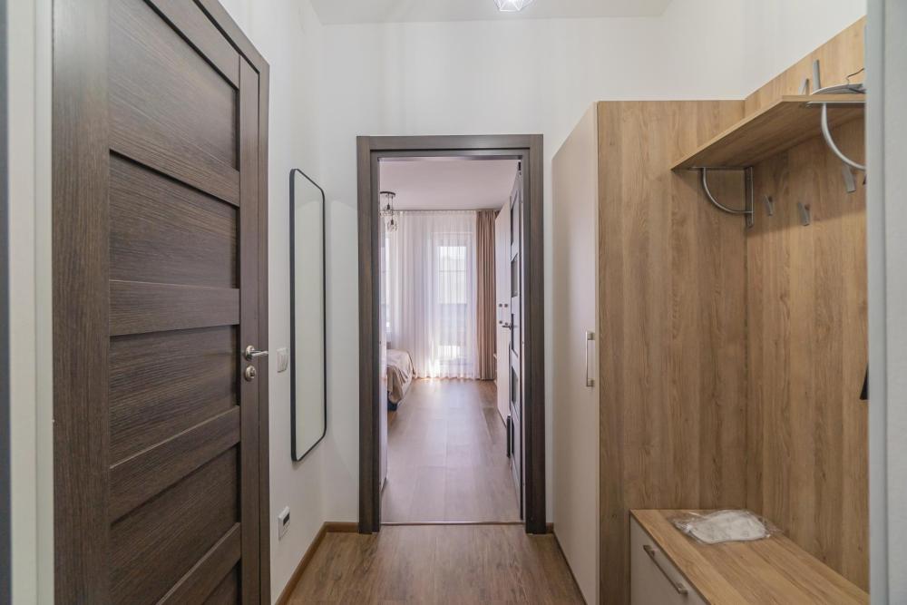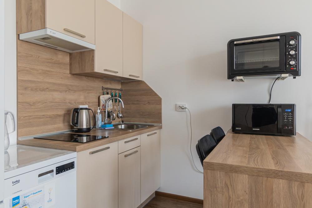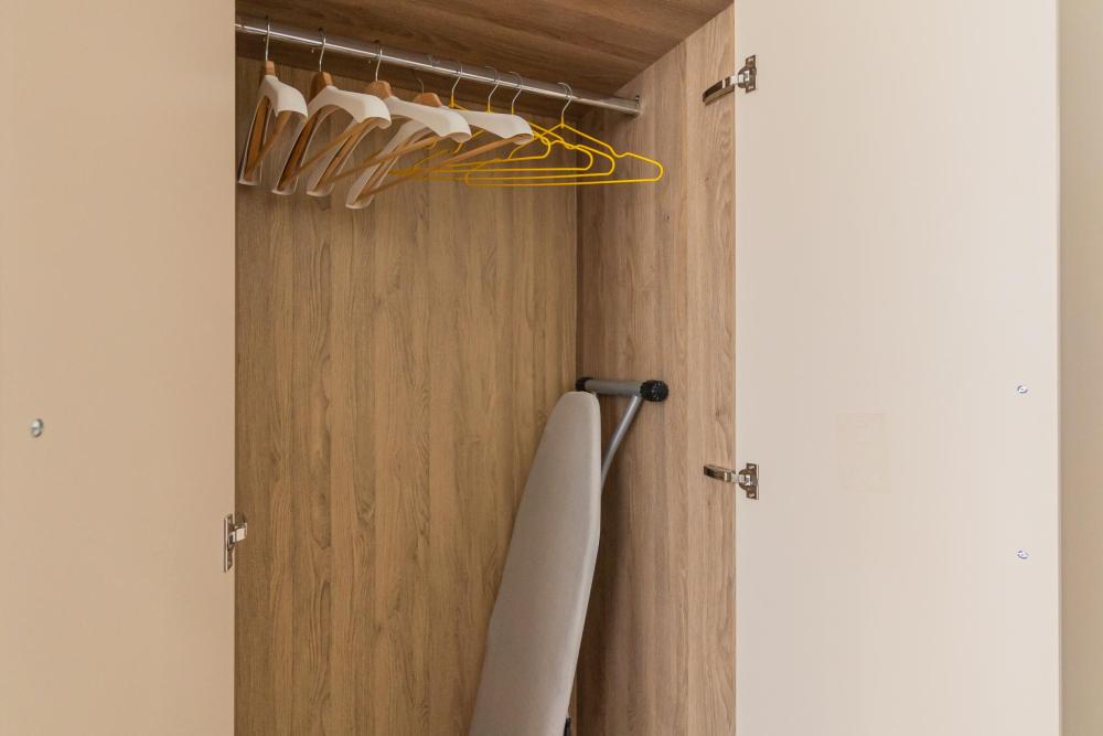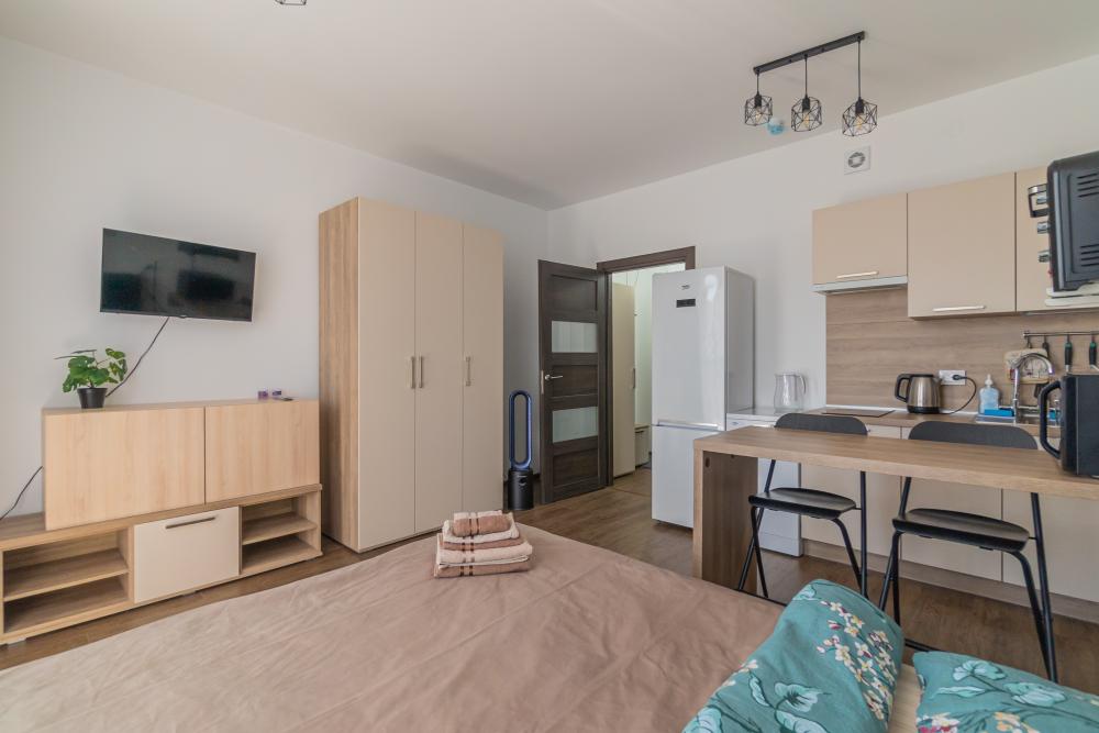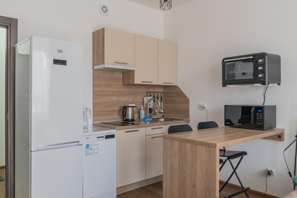 Оснащение : - телевизор Смарт ТВ -фен -гладильные принадлежности (гладильная доска и утюг) -скоростной вайфай -постельное белье и полотенца -спальная зона (двуспальная кровать) - обеденная зона (холодильник, чайник, микроволновка, варочная панель, столовая группа, посуда на 2 персоны, стол со стульями) - Сан.узел (душевая кабина, туалет, стиральная машинка, сушилка, фен)