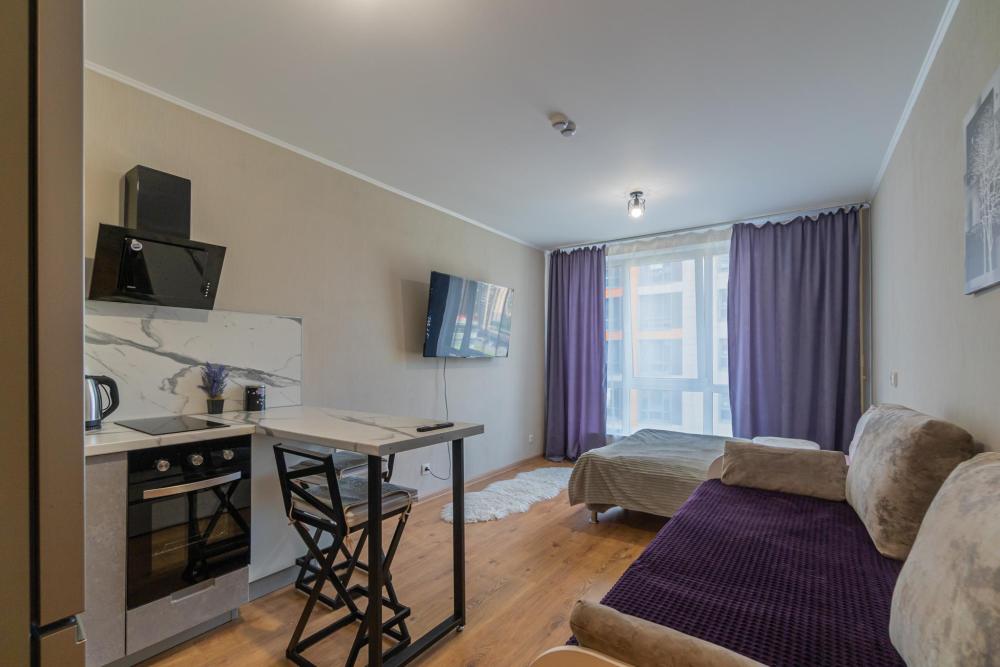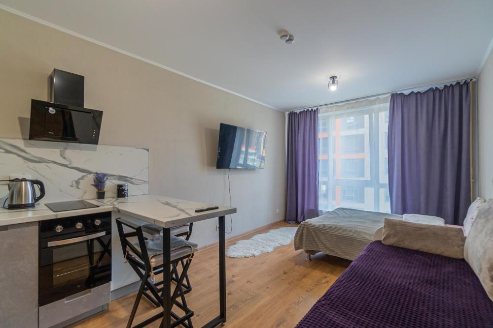 В номере: - большое панорамное окно - телевизор с встроенным голосовым яндекс помощником, функцией зеркального экрана и выходом в интернет -фен -гладильные принадлежности -рабочая зона -скоростной вайфай -постельное белье и полотенца -спальная зона (двуспальная кровать и раскладное кресло) - обеденная зона (холодильник, чайник, микроволновка, варочная панель, столовая группа, посуда на 2 персоны, стол со стульями) - Сан.узел (душевая кабина, туалет, стиральная машинка, сушилка)