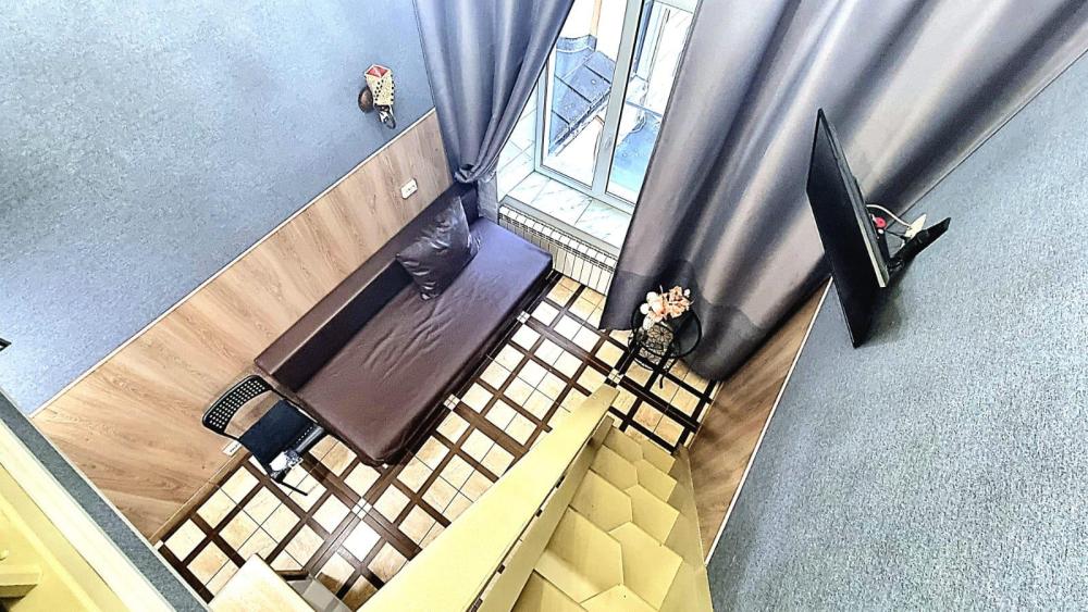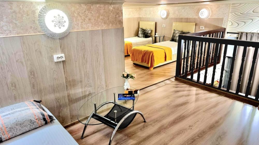 Двухуровневая комната, оборудованная всем необходимым для комфортного проживания. Спальные места: двуспальная кровать, две односпальные кровати и диван. В комнате: кондиционер, три телевизора, совмещенный санузел с душем.