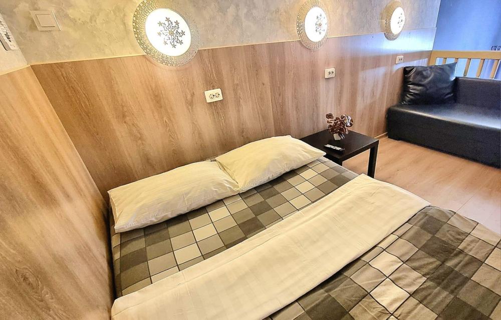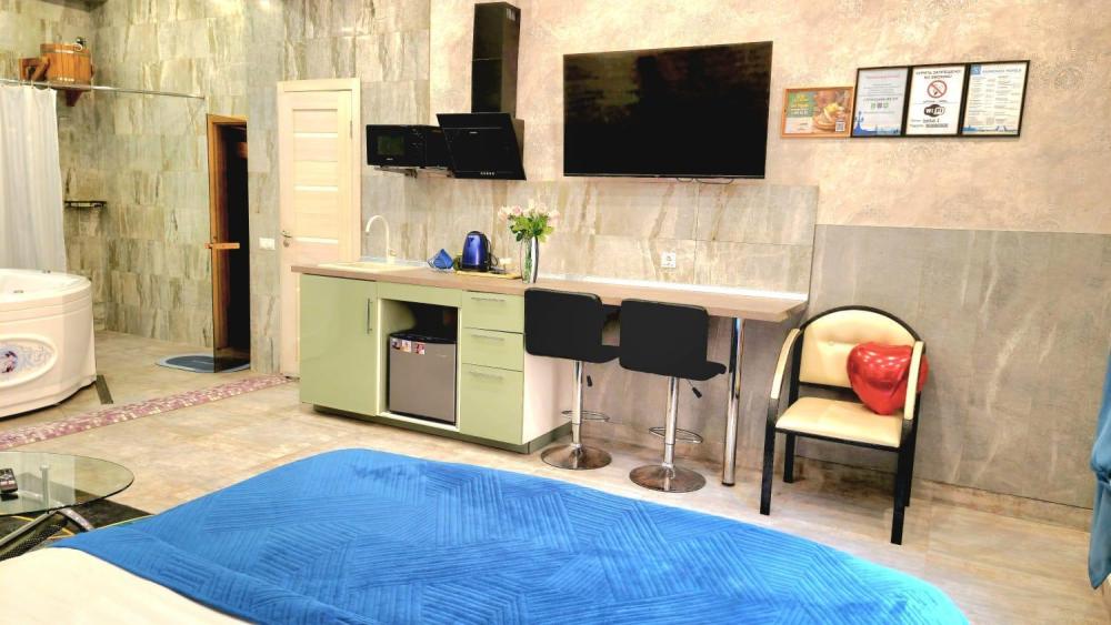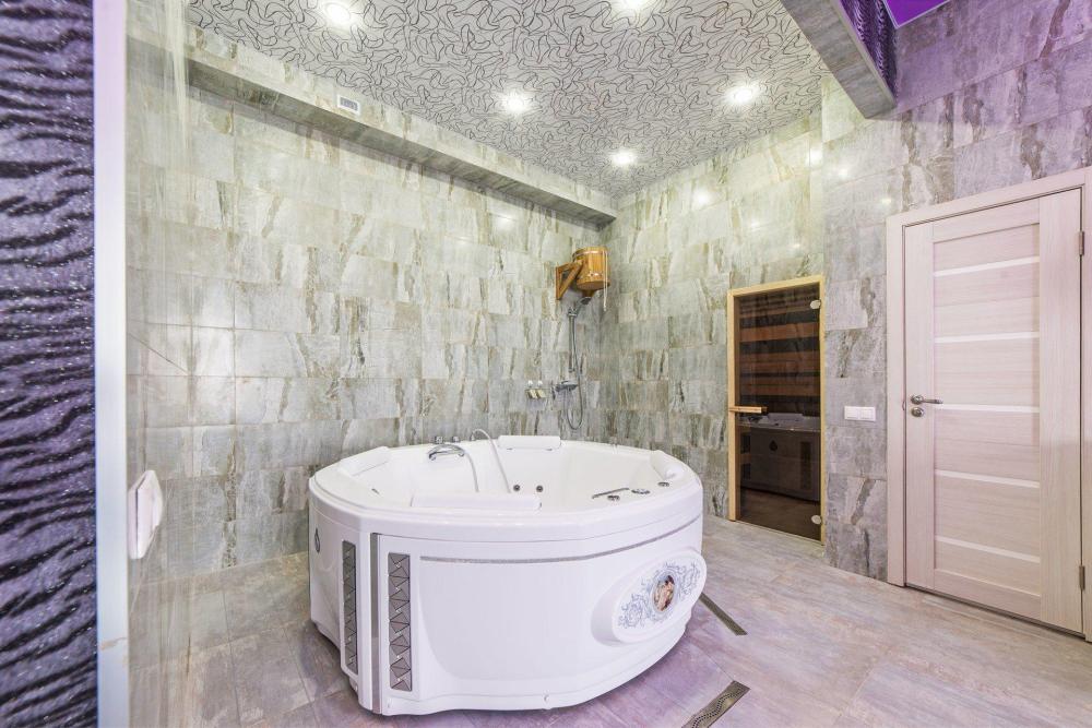 Просторная комната с сауной, оборудованная всем необходимым для комфортного проживания. Спальные места: двуспальная кровать и диван. В комнате есть большое джакузи, сауна, Smart TV и санузел.