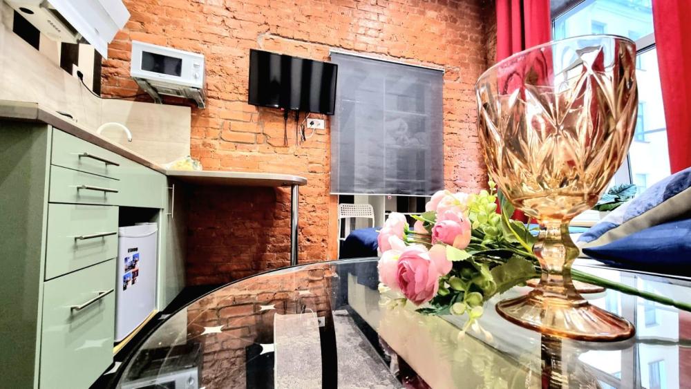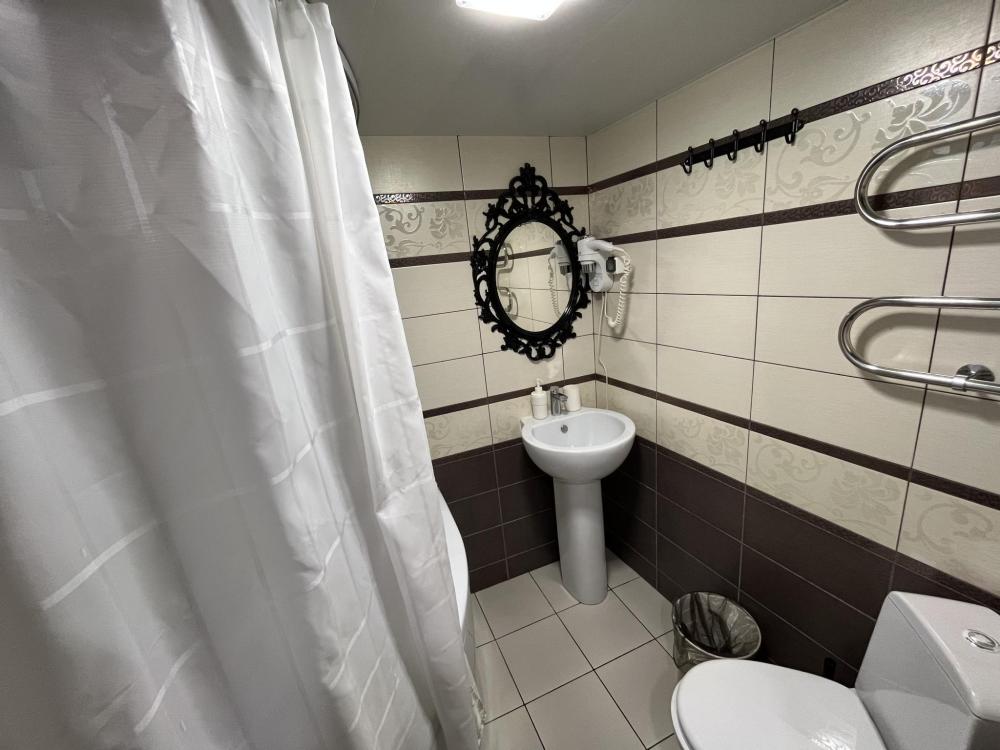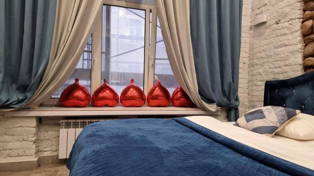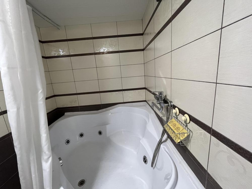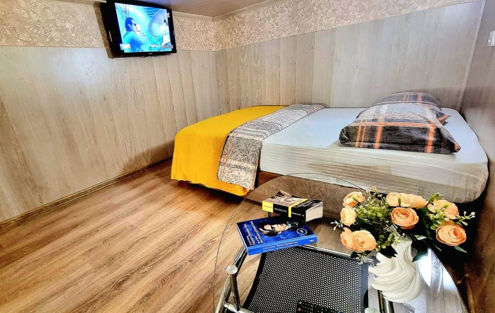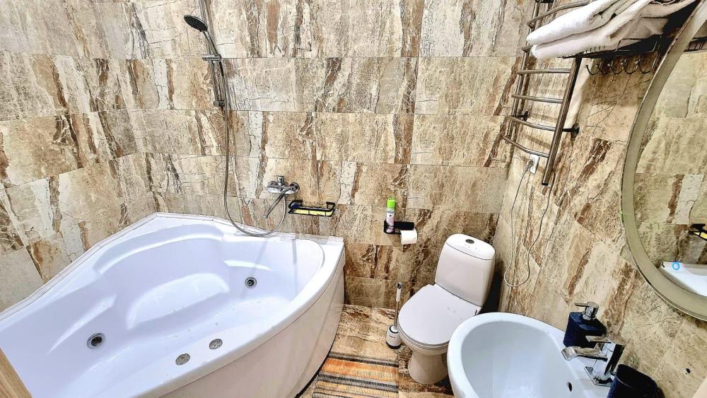 Двухуровневая комната с джакузи, оборудованная всем необходимым для комфортного проживания. Спальные места: двуспальная кровать, два дивана, два телевизора, микроволновка, электрочайник, холодильник, фен, полотенца, одноразовые тапочки, санузел в номере.